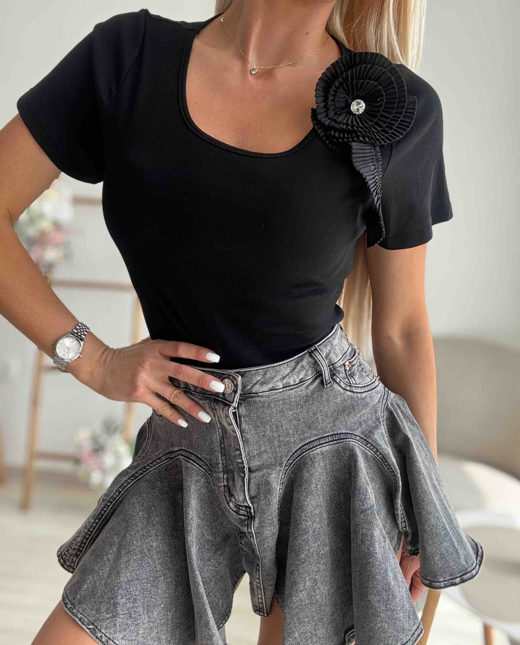 Добавете стил и елегантност към визията си с тази черна тениска с брошка!