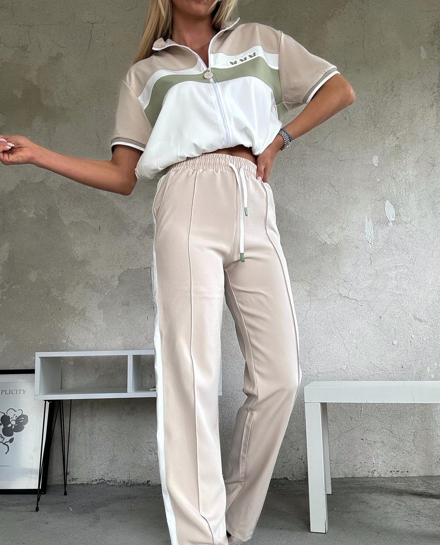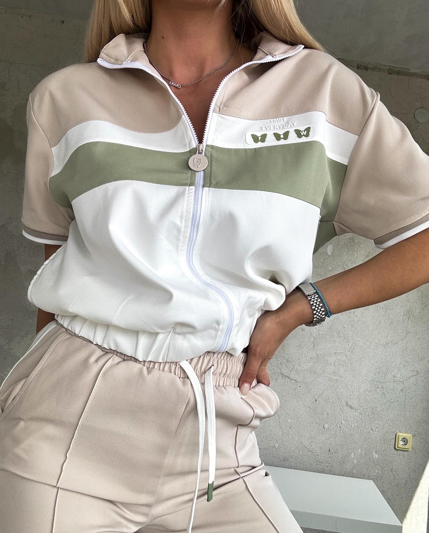 - Горнище с цип и къс ръкав, декорирано с акцент в бежово и зелено.