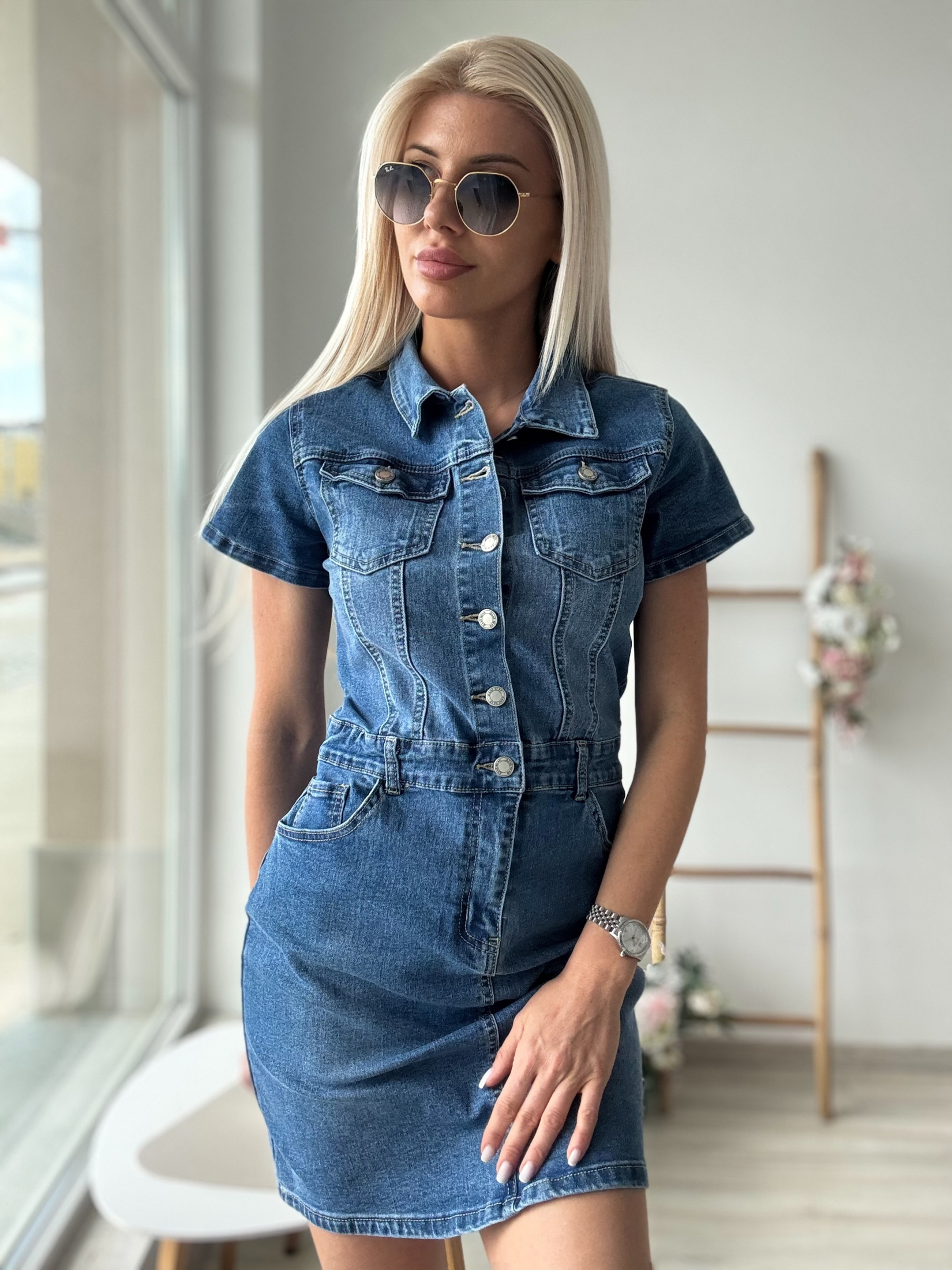 Тази стилна и модерна дънкова рокля е изработена от висококачествен памучен деним, който осигурява удобство и издръжливост. Тъмносиният цвят придава елегантност и универсалност, което позволява да се комбинира с различни аксесоари и обувки. Роклята е с къс ръкав и класическа яка, закопчава се с копчета по цялата дължина, което я прави лесна за обличане и събличане. Вталеният силует подчертава женствените форми, а дължината до коляното е подходяща за всякакви поводи.