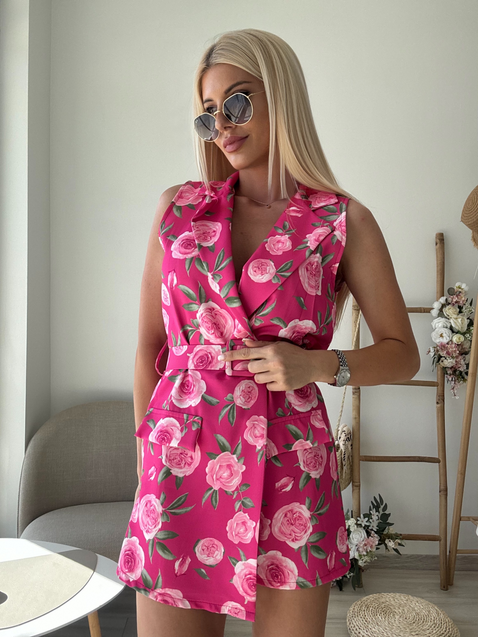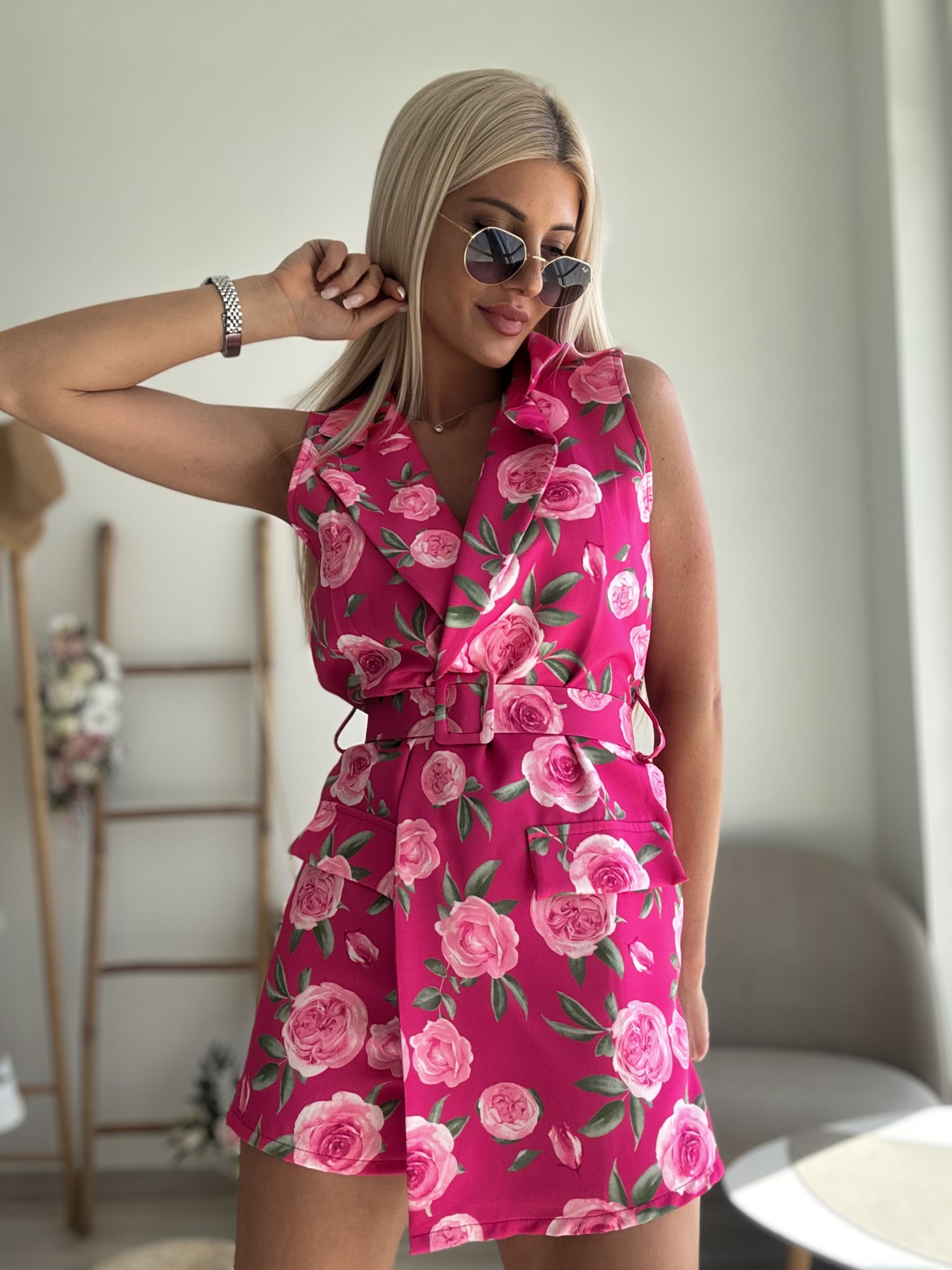 Представяме ви нашия очарователен цикламен гащеризон с розови цветя, перфектният избор за тези, които искат да добавят нотка елегантност и игривост към гардероба си.