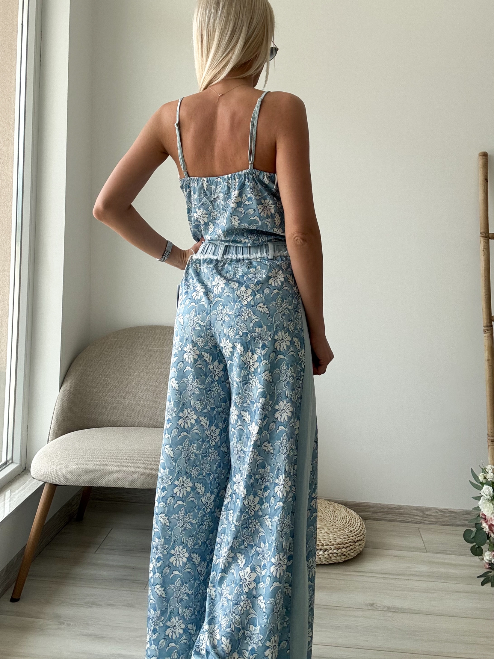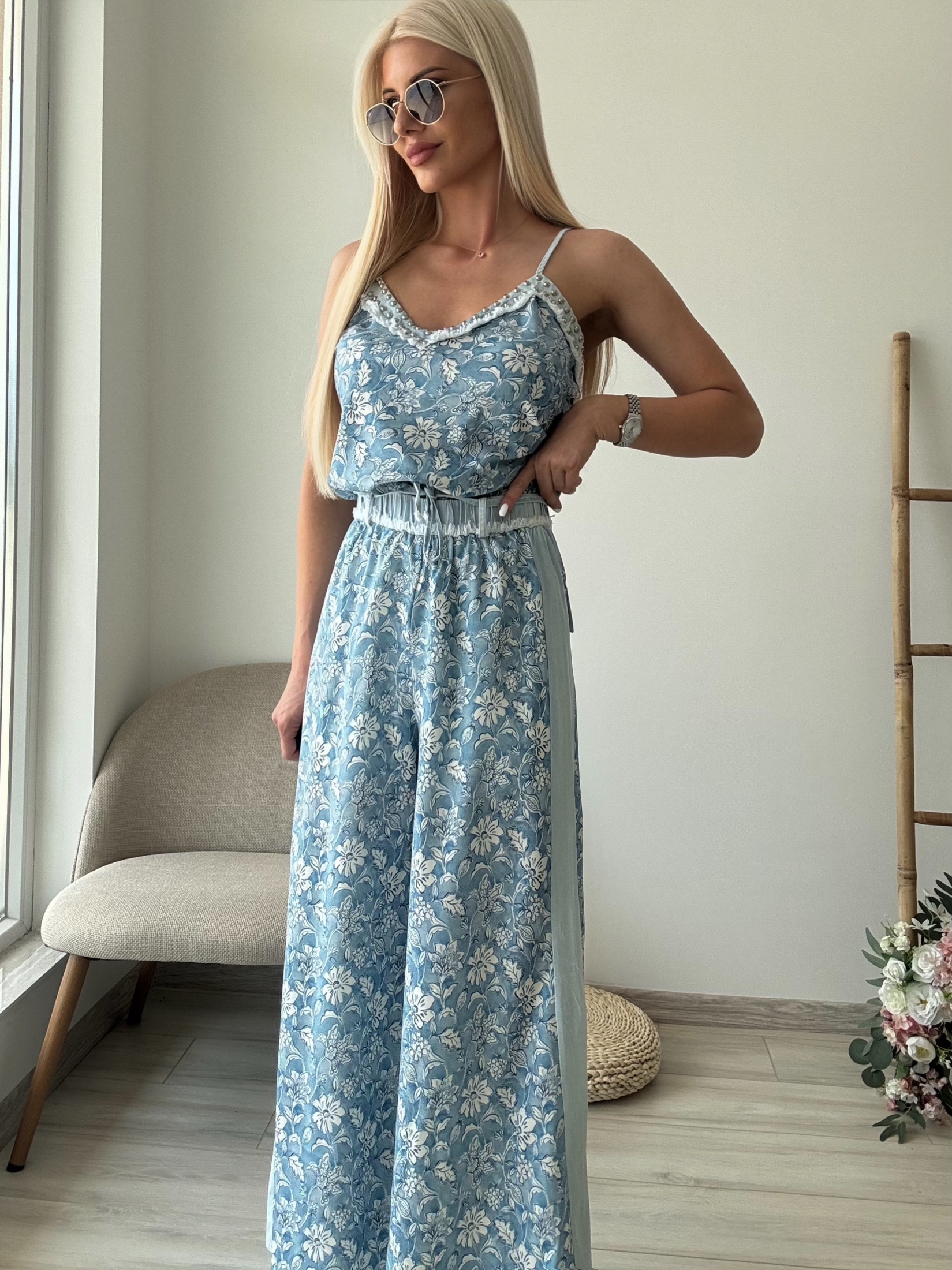 Комплектът включва топ с тънки презрамки, украсен с дантела и малки перлички около деколтето, което придава изискан вид. Панталонът е с широки крачоли и еластична талия с връзки, осигуряващи перфектно прилягане. Материята е комбинация от сатен и деним, с нежен флорален принт в сини и бели тонове, което го прави идеален за летните дни.