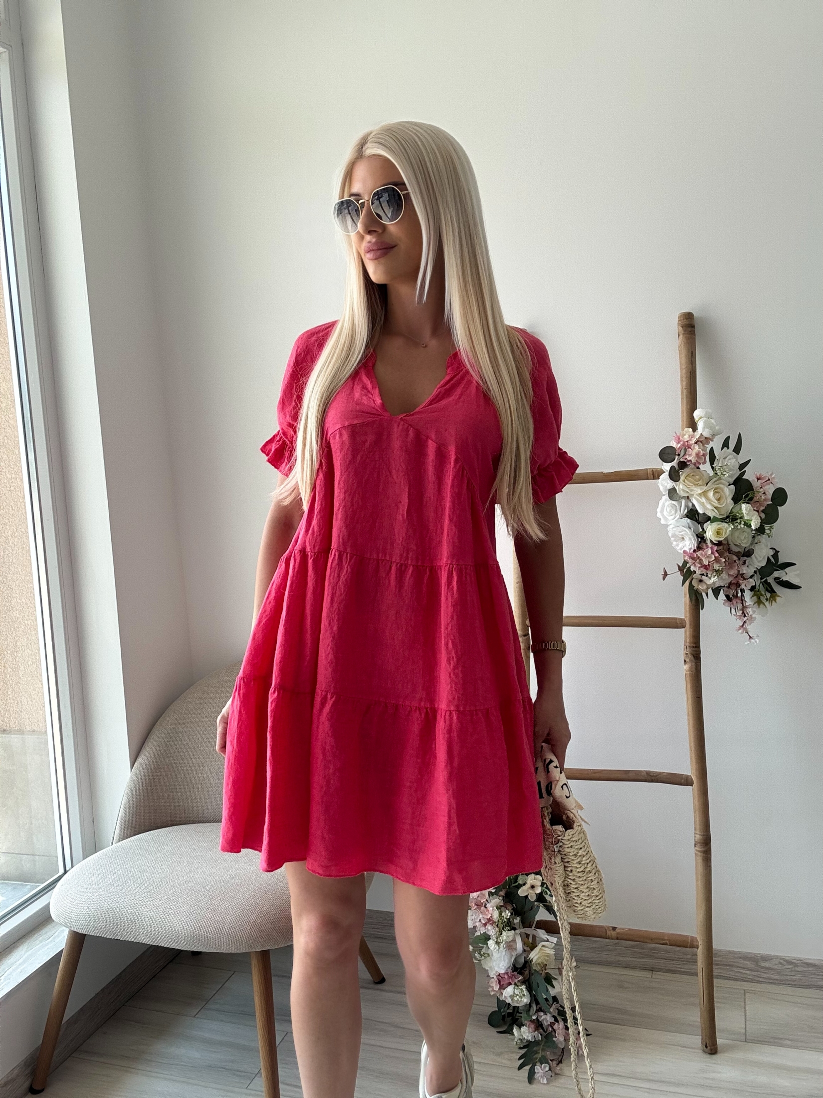 Изработена от висококачествен лен, роклята е изключително лека и дишаща, което ви осигурява прохлада и комфорт дори в най-горещите дни. Свободната кройка и тристепенният дизайн придават на роклята закачлив и женствен вид. V-образното деколте подчертава елегантността на шията, а късите ръкави с леки волани добавят допълнителен чар.