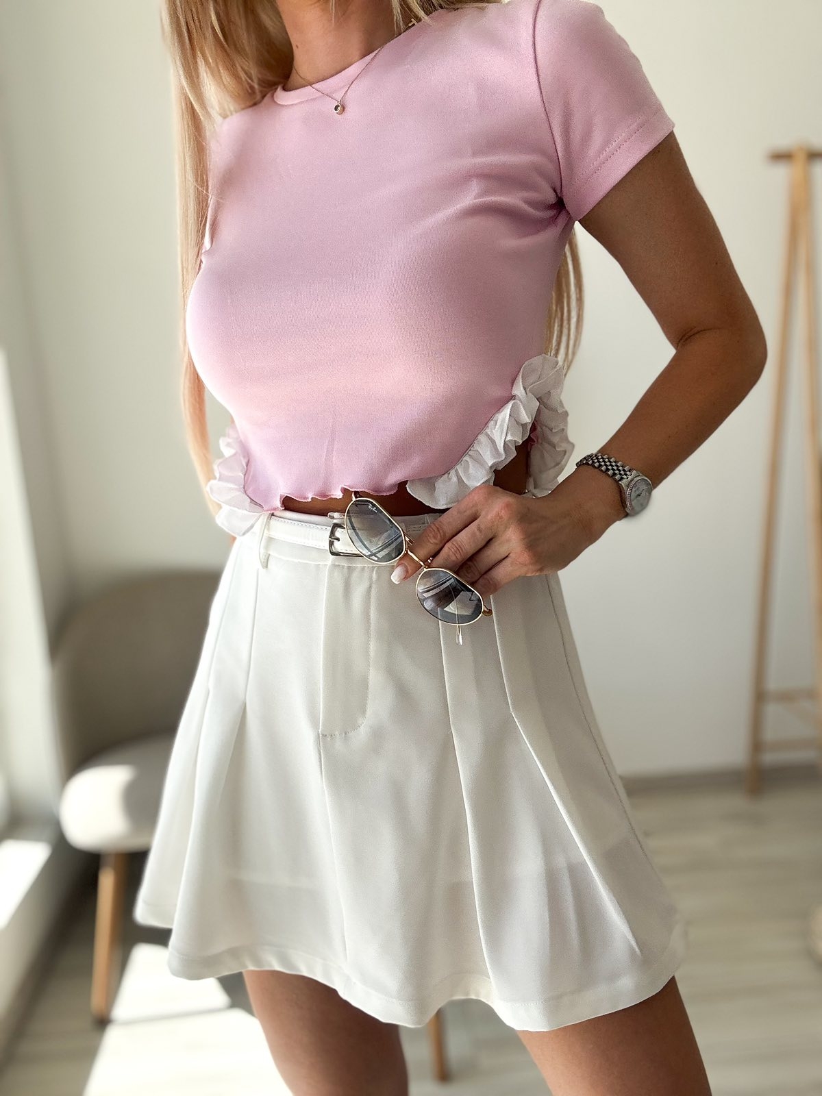 Освежете гардероба си с тази очарователна розова тениска, украсена с бяла харбала!