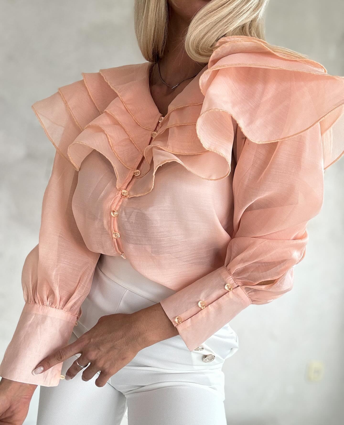 Елегантен дизайн: Тази риза е изработена от висококачествена органза и се отличава с нежен прасковен цвят, който придава изтънченост и стил на визията ви. Ефектните волани около деколтето добавят женственост и романтика.
