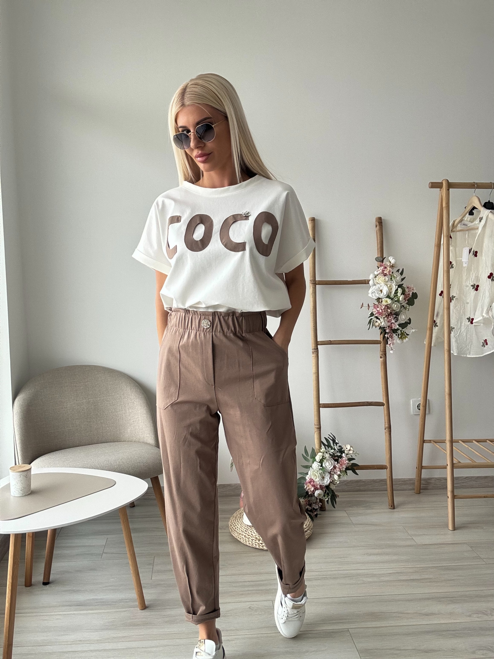 Дизайн и комфорт: Комплектът включва мека бяла тениска с апликация "COCO" в камел цвят, която придава закачлив и модерен вид. Панталонът в цвят камел е с еластична талия, осигуряваща удобство и свобода на движение. Декоративно копче и функционални джобове допълват визията на панталона.
