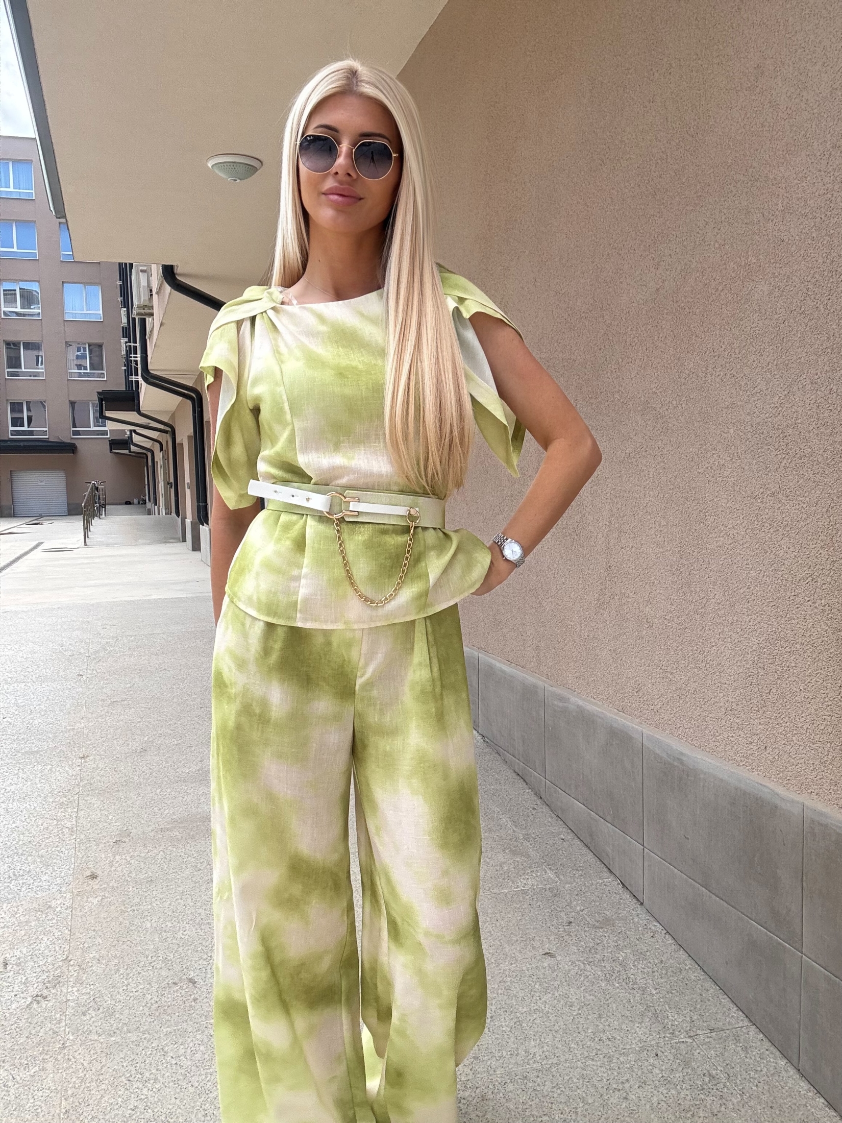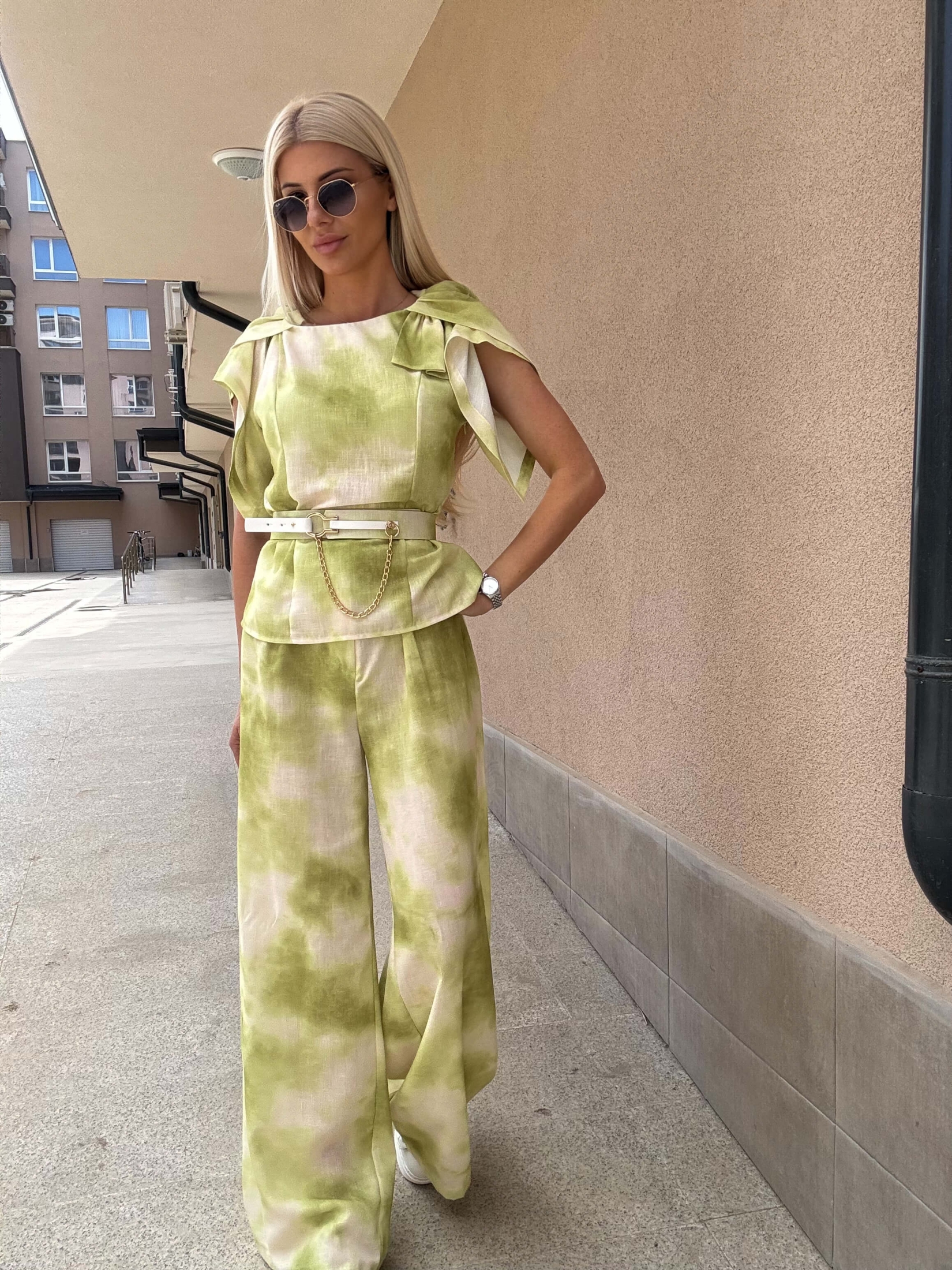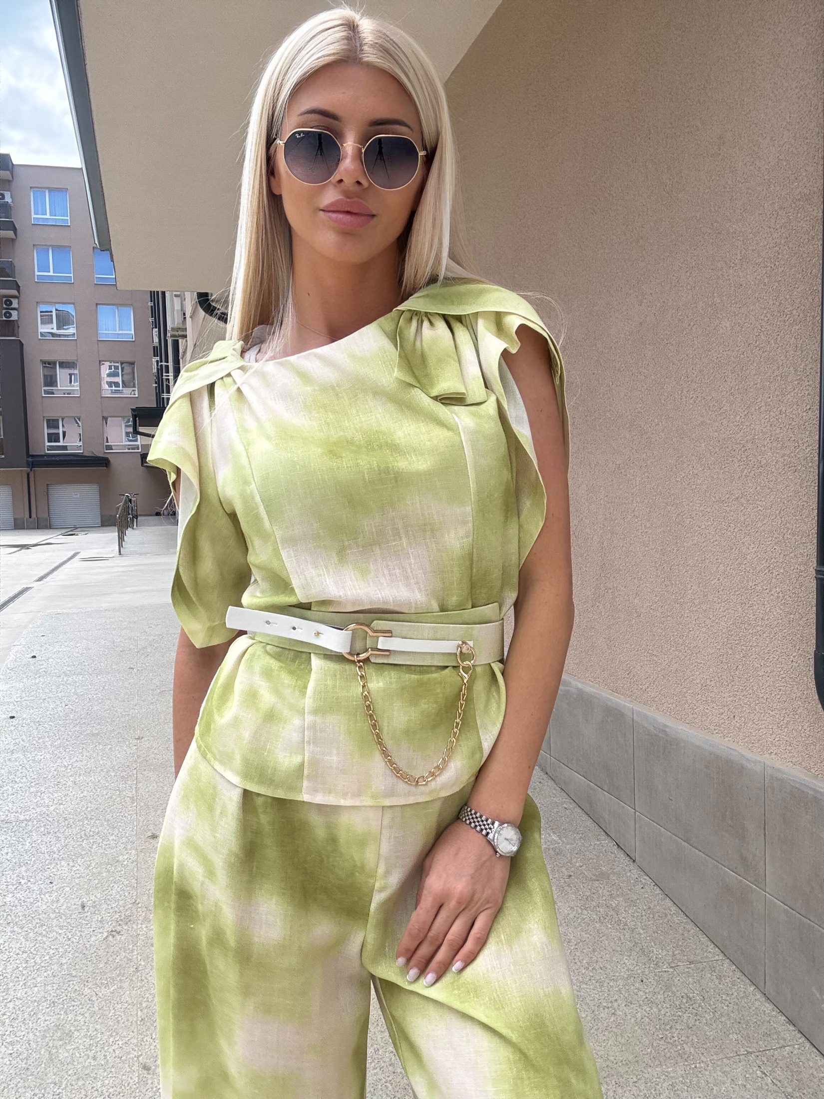 Представяме ви нашия стилен зелен костюм от 100% памук! Този лек и удобен костюм е идеален за топлите дни. Със своя уникален дизайн, той ще ви осигури елегантна визия и комфорт през целия ден.