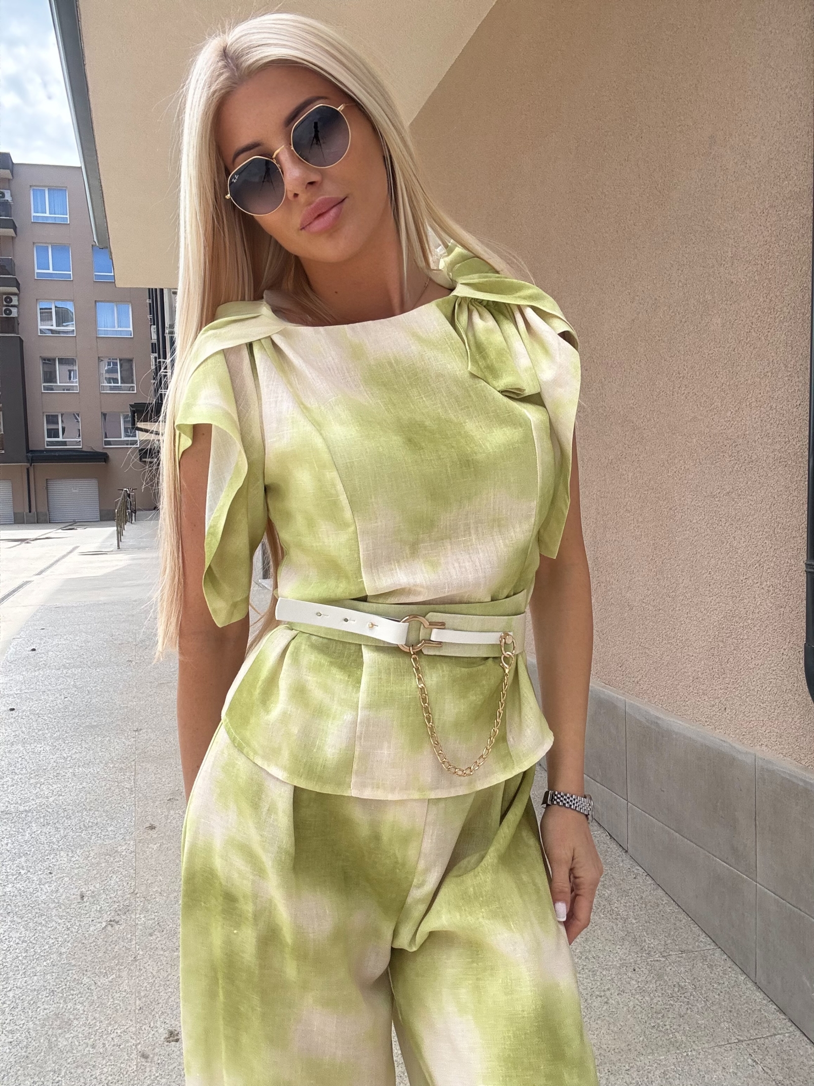 • Детайли: Уникални акценти, като нежни плисета на раменете на горната част и стилен колан, който подчертава талията.