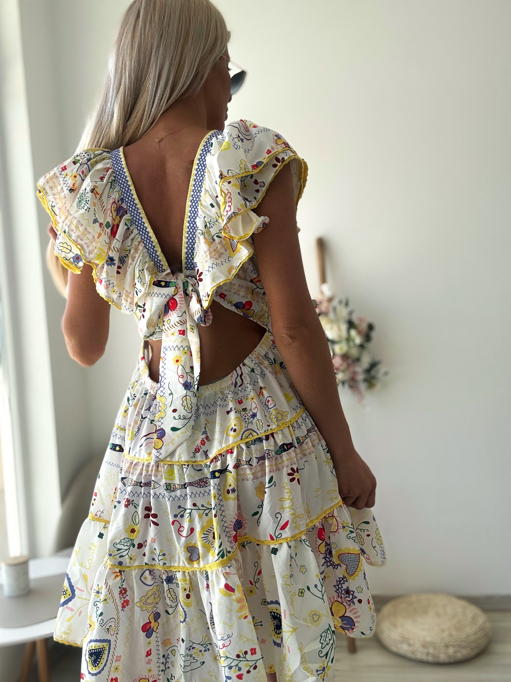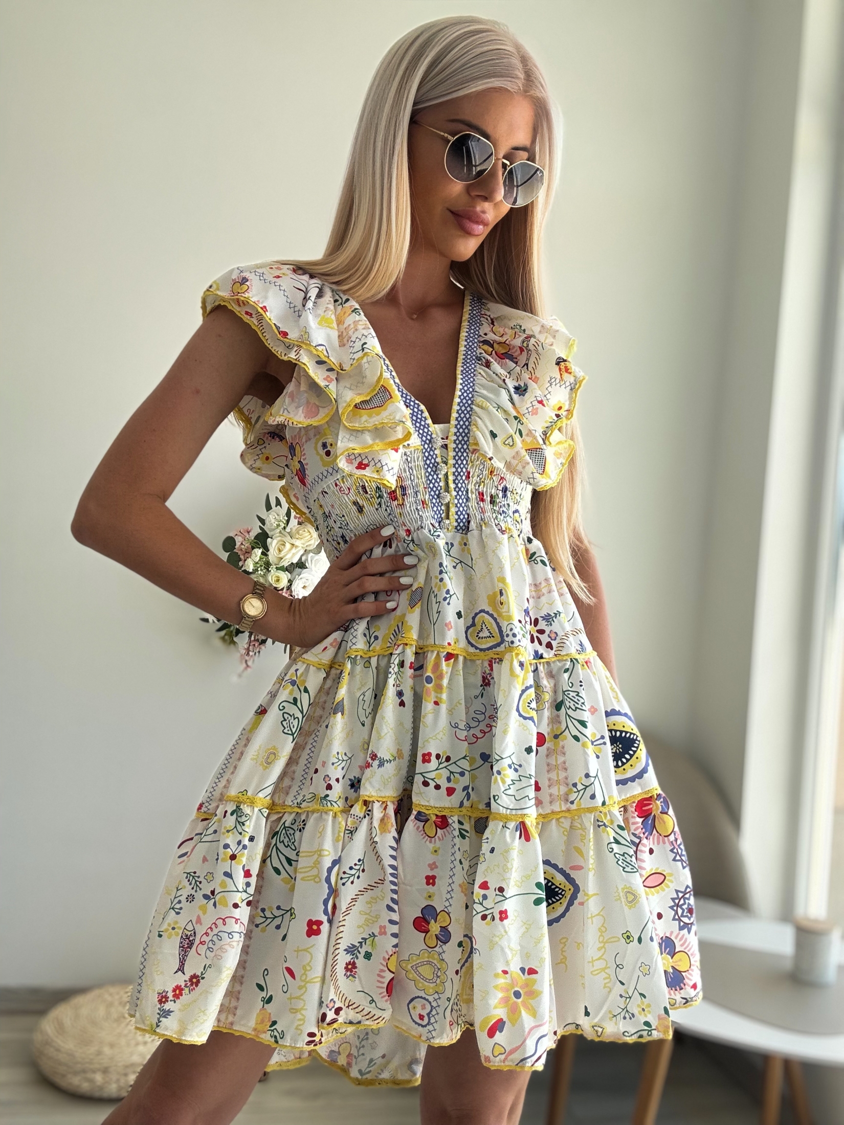 Роклята е изработена от лека и дишаща материя, която е изключително приятна на допир и осигурява максимален комфорт през целия ден. Жълтият цвят е комбиниран с разноцветни надписи и детайли, което придава игрив и модерен вид. Дизайнът включва нежни волани на раменете и под бюста, които добавят женственост и елегантност.