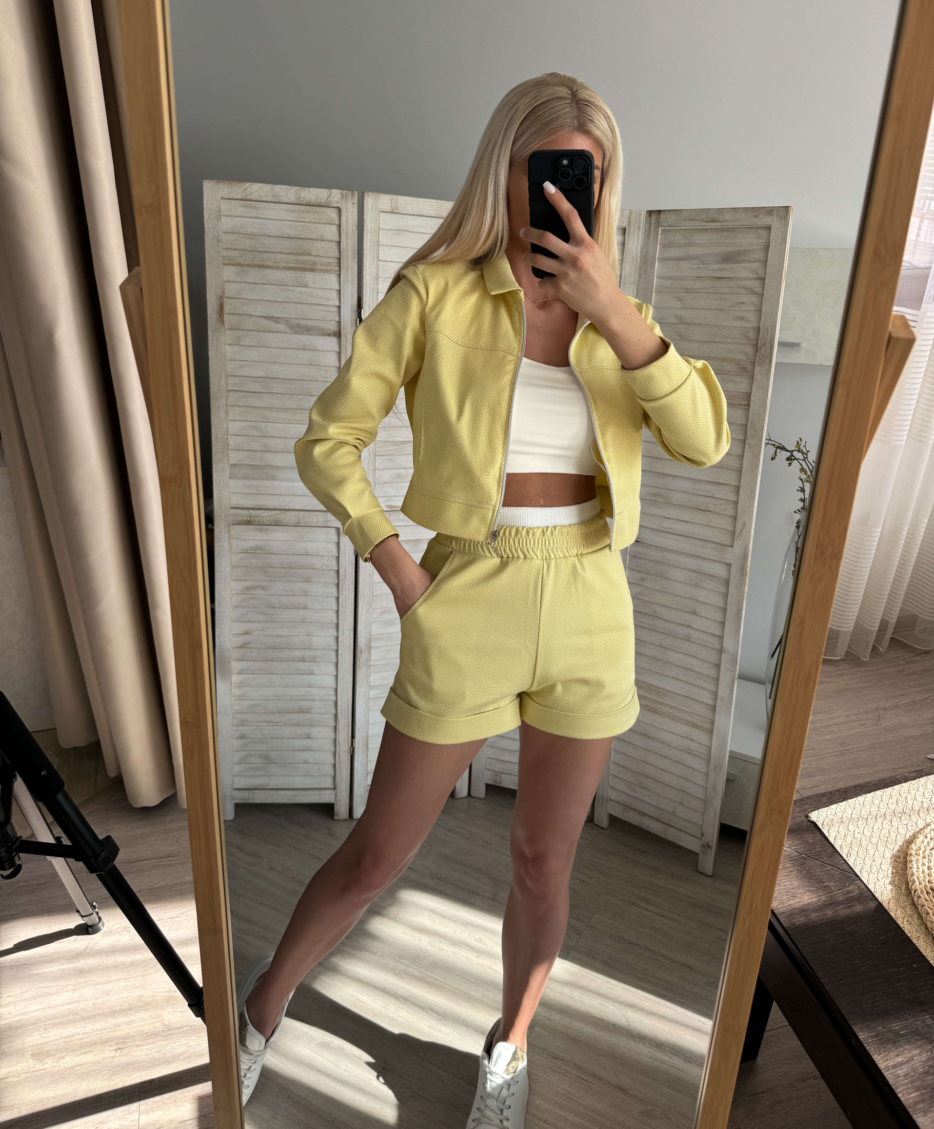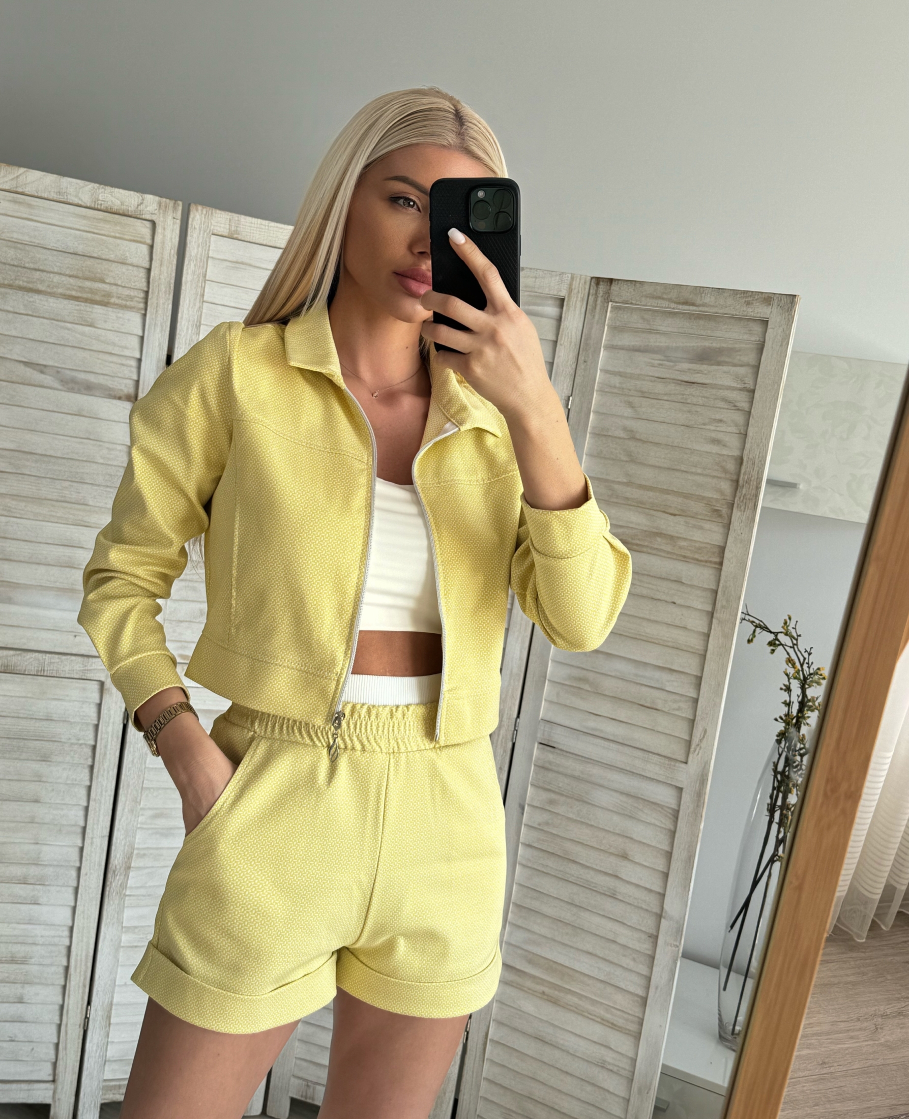 Изразете стила си с този очарователен жълт комплект с яке! Този комплект съчетава комфорт и модерна визия, като е идеален за пролетните и летните дни. Състои се от късо яке с цип и къси панталонки с еластична талия, предлагайки ви свобода на движение и стилна елегантност. Жълтият цвят ще внесе свежест и настроение във вашата визия.