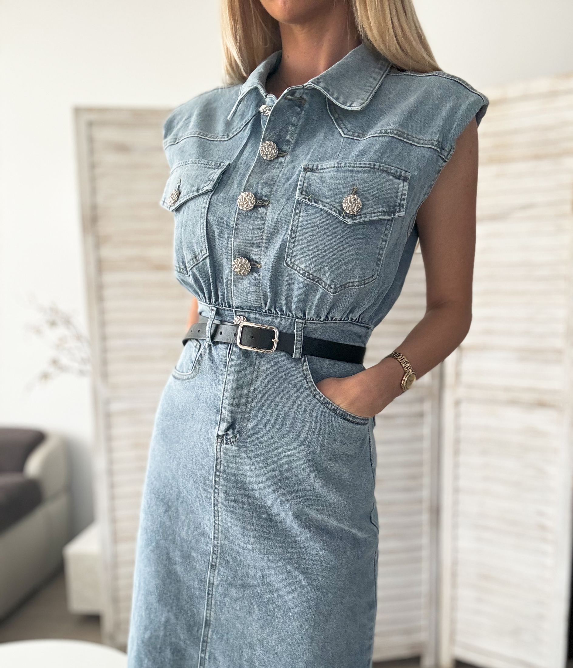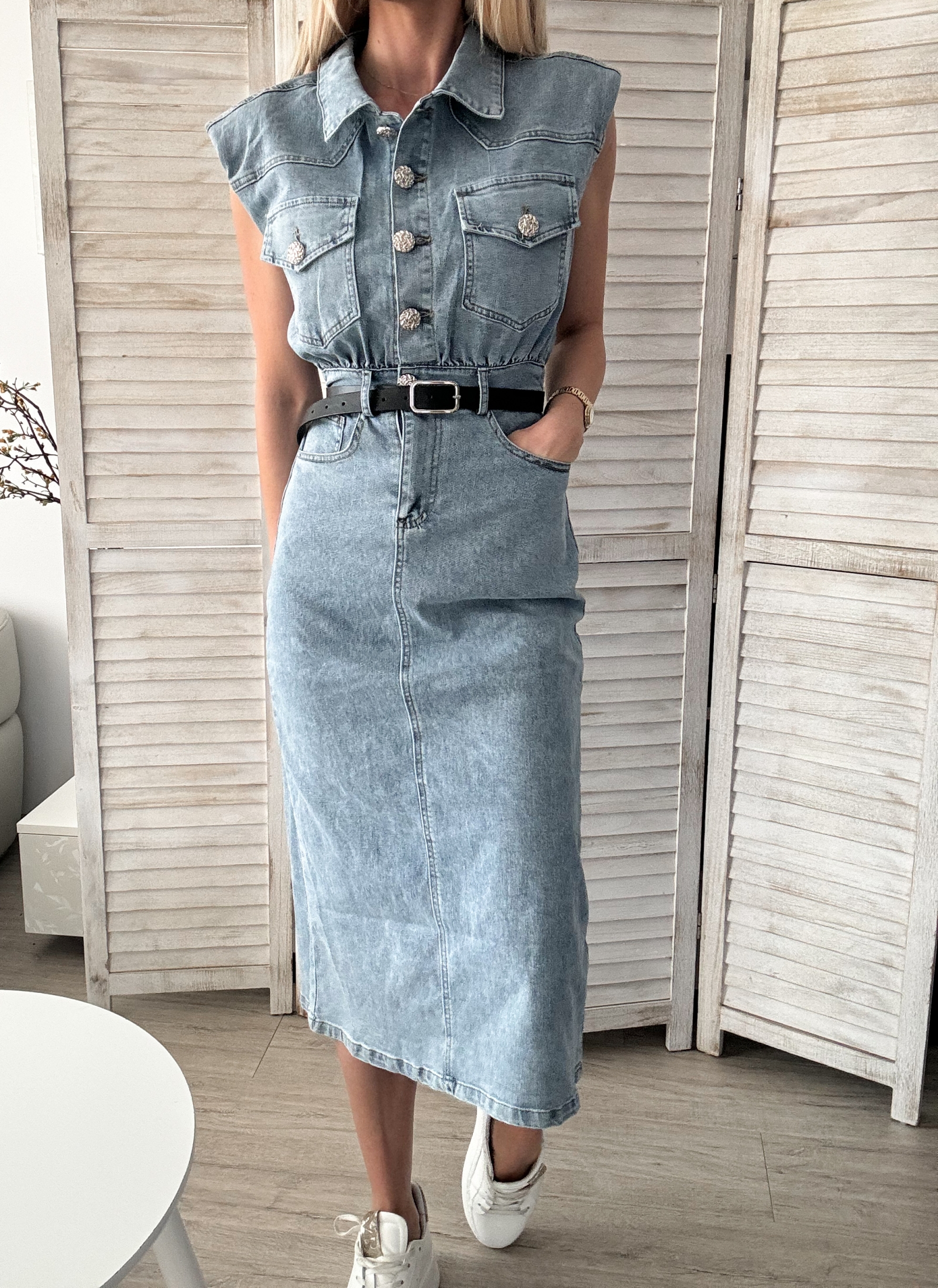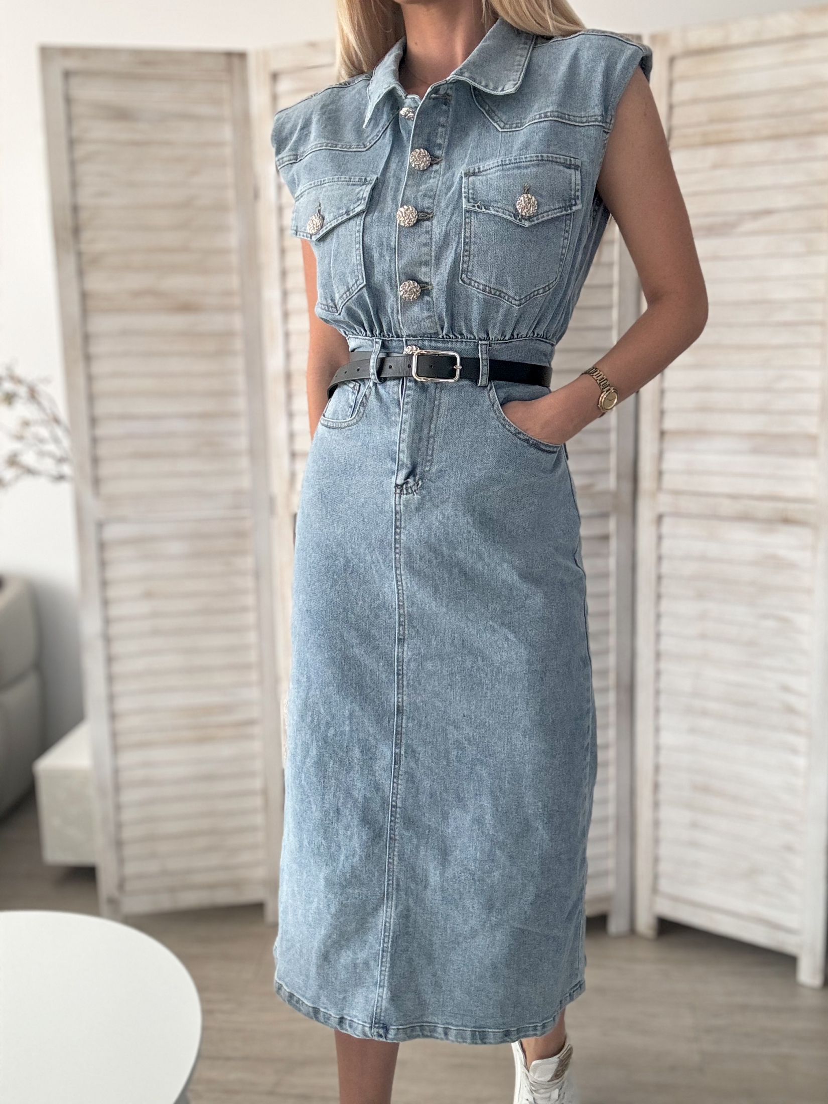 Представяме ви нашата дълга дънкова рокля, перфектна комбинация от модерна визия и елегантност.