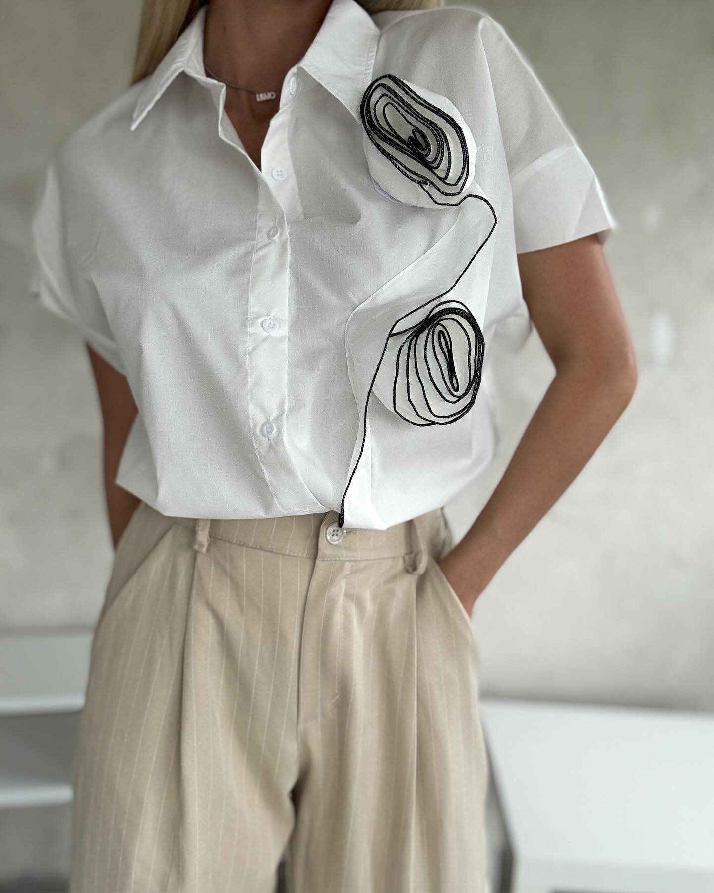Стилна, дамска риза в бяло, с ефектен флорален елемент.