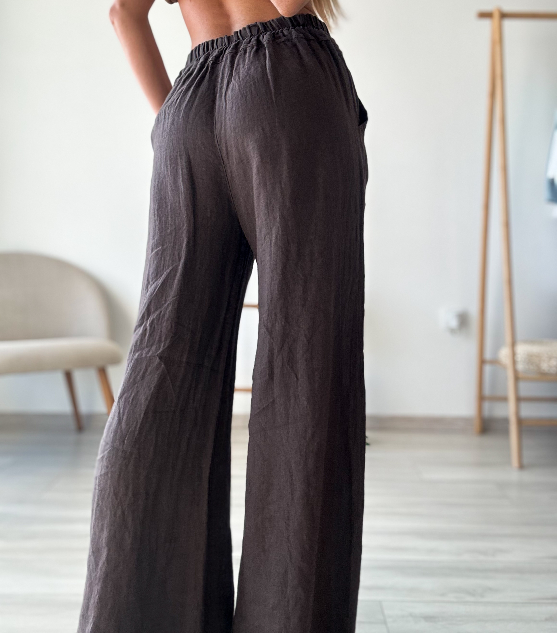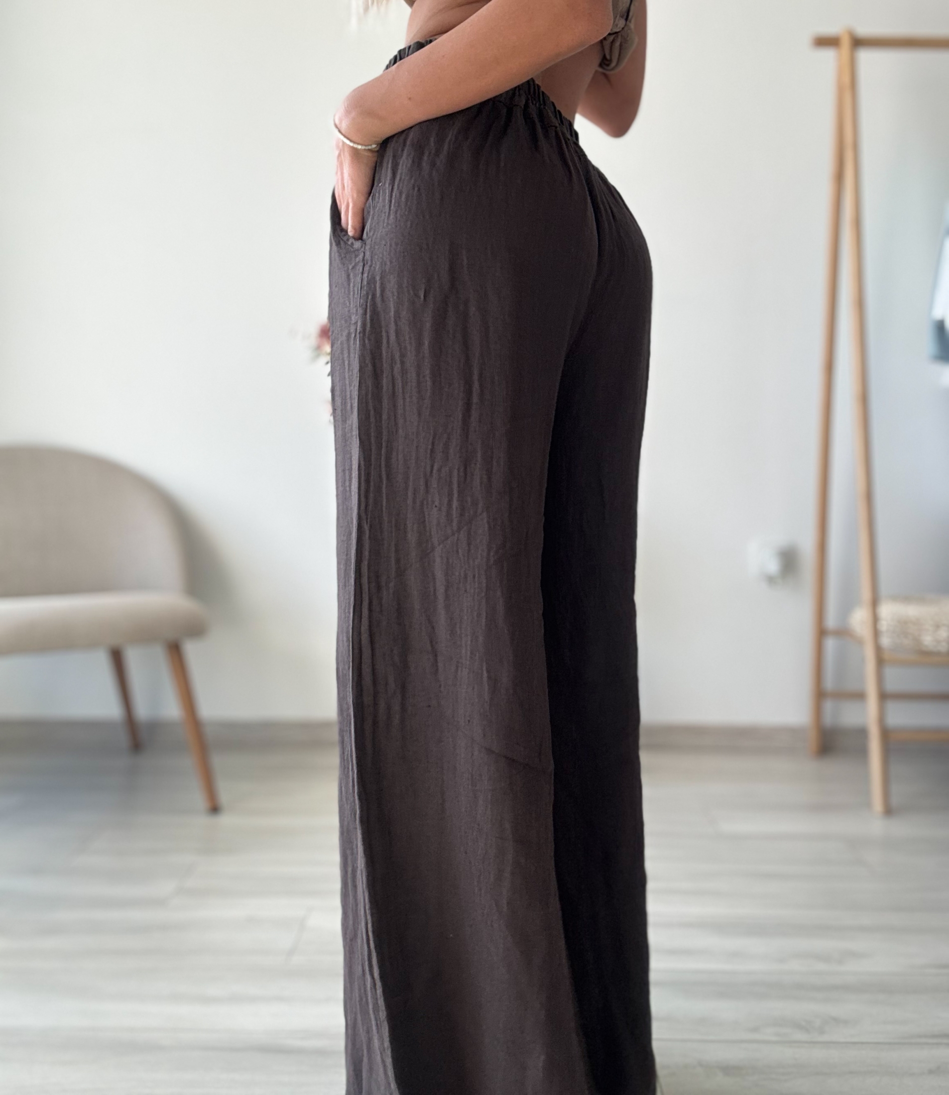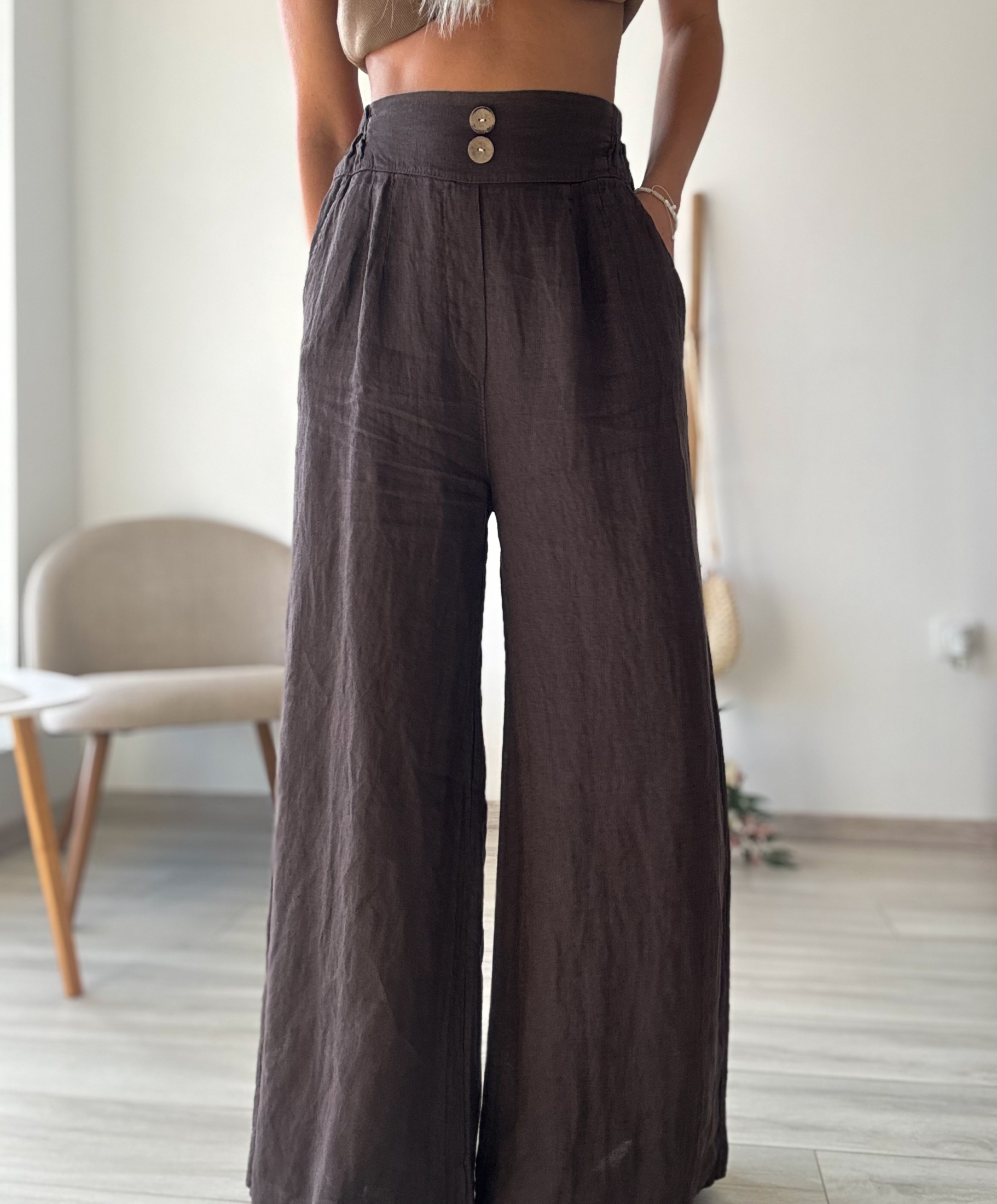 Представяме ви нашия елегантен дълъг ленен панталон в апетитен шоколадов цвят – перфектното допълнение към вашия гардероб за топлите дни!