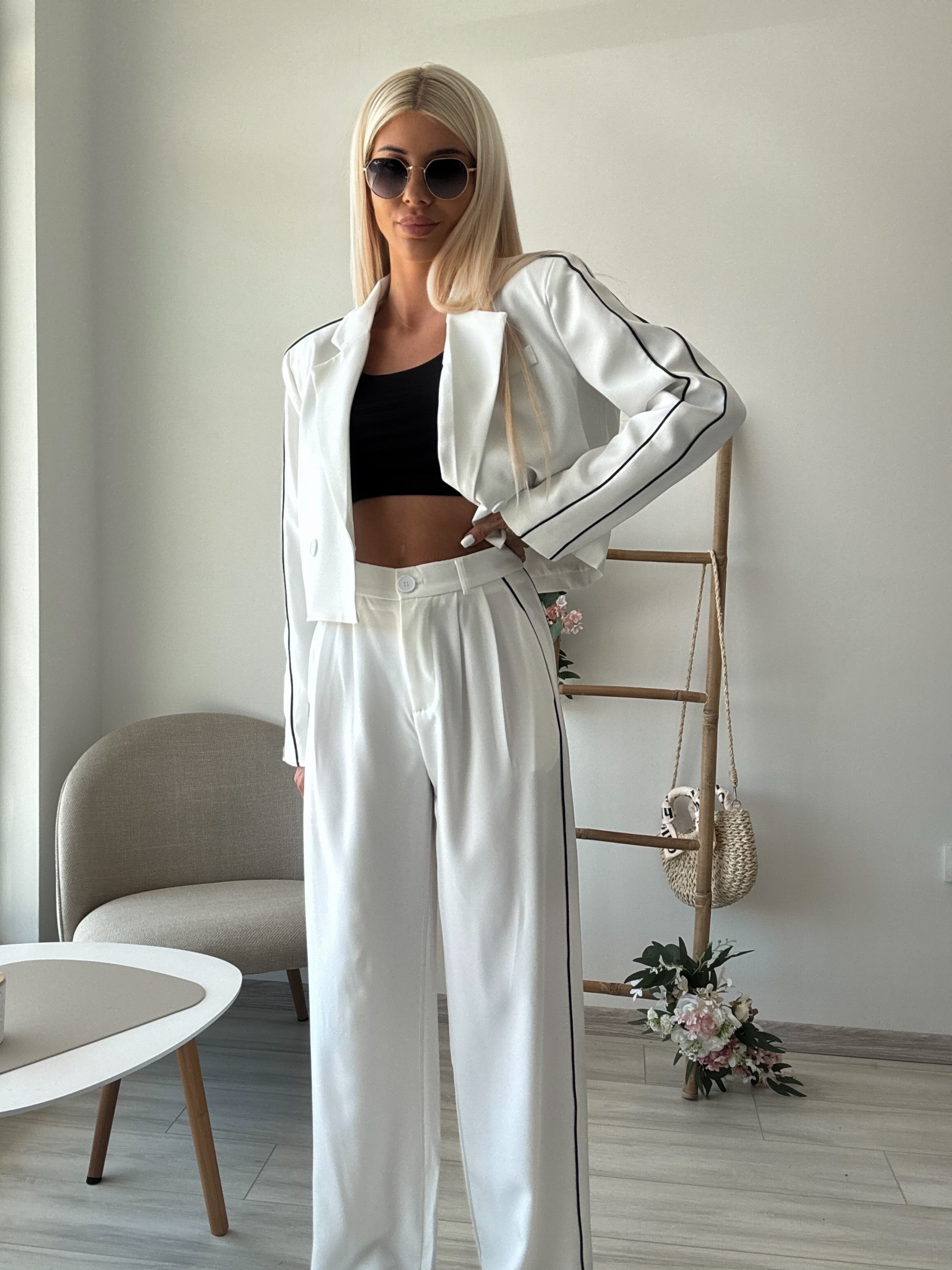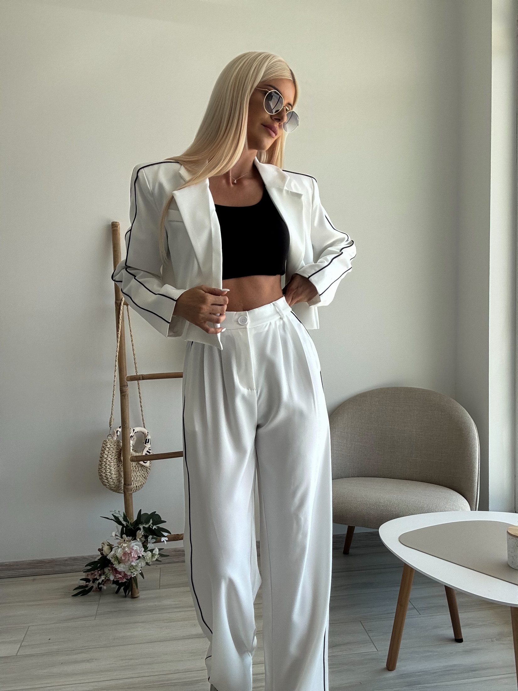 Представяме ви нашия изискан бял костюм с кант – перфектният избор за жени, които искат да изглеждат стилно и уверено във всяка ситуация. Независимо дали става въпрос за бизнес среща, специално събитие или просто искате да се чувствате безупречно в ежедневието си, този костюм ще ви осигури елегантен и модерен вид.