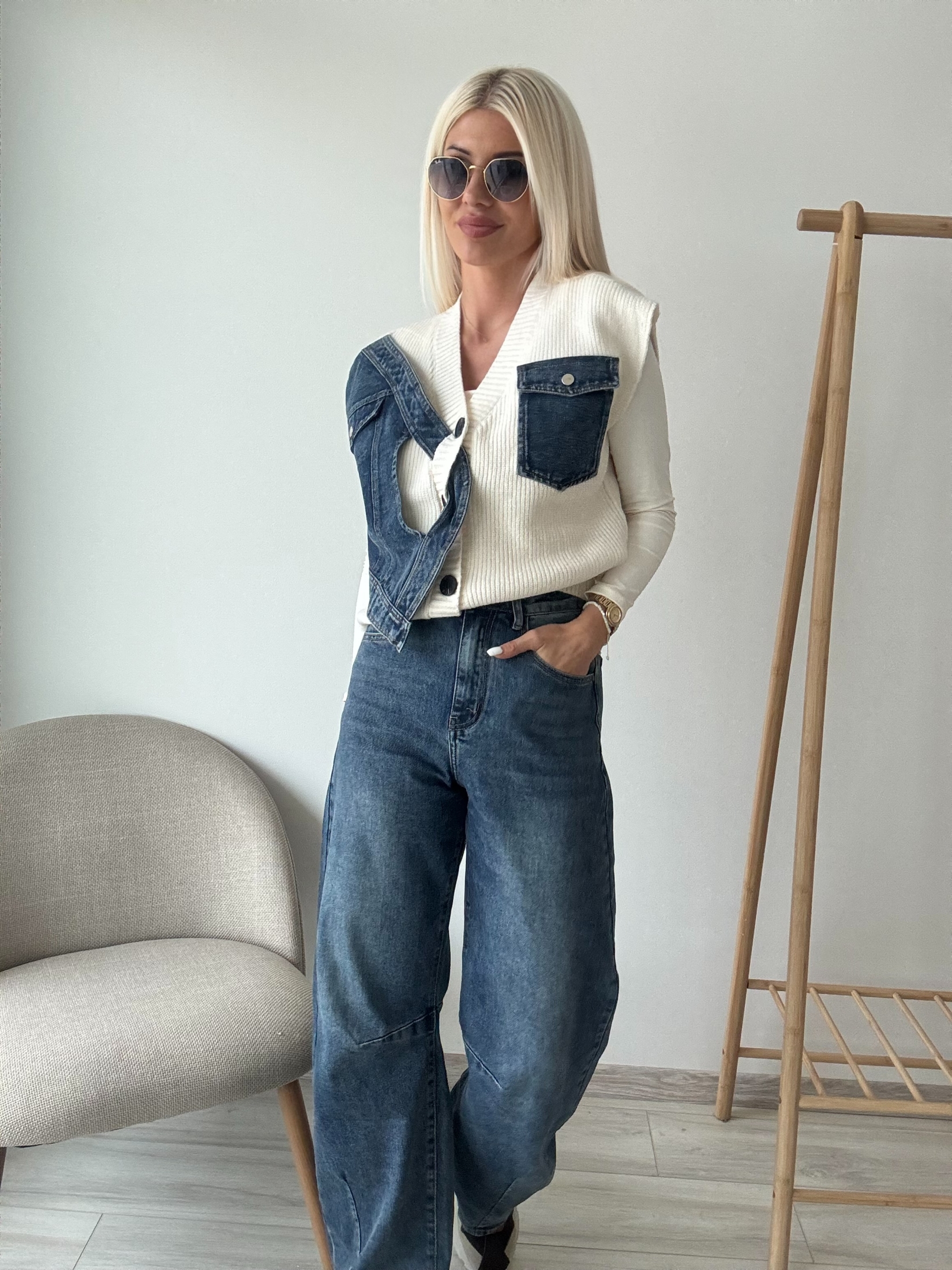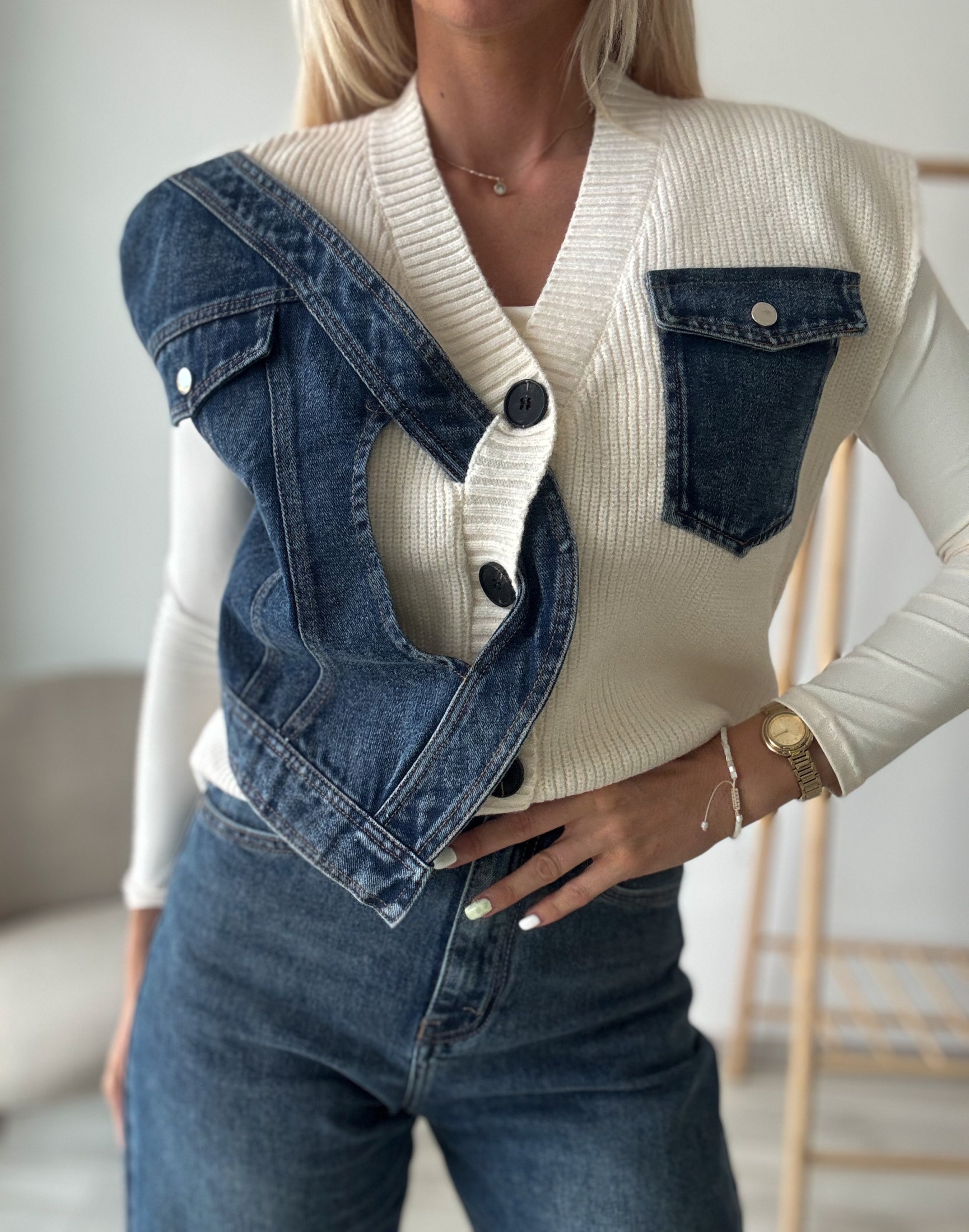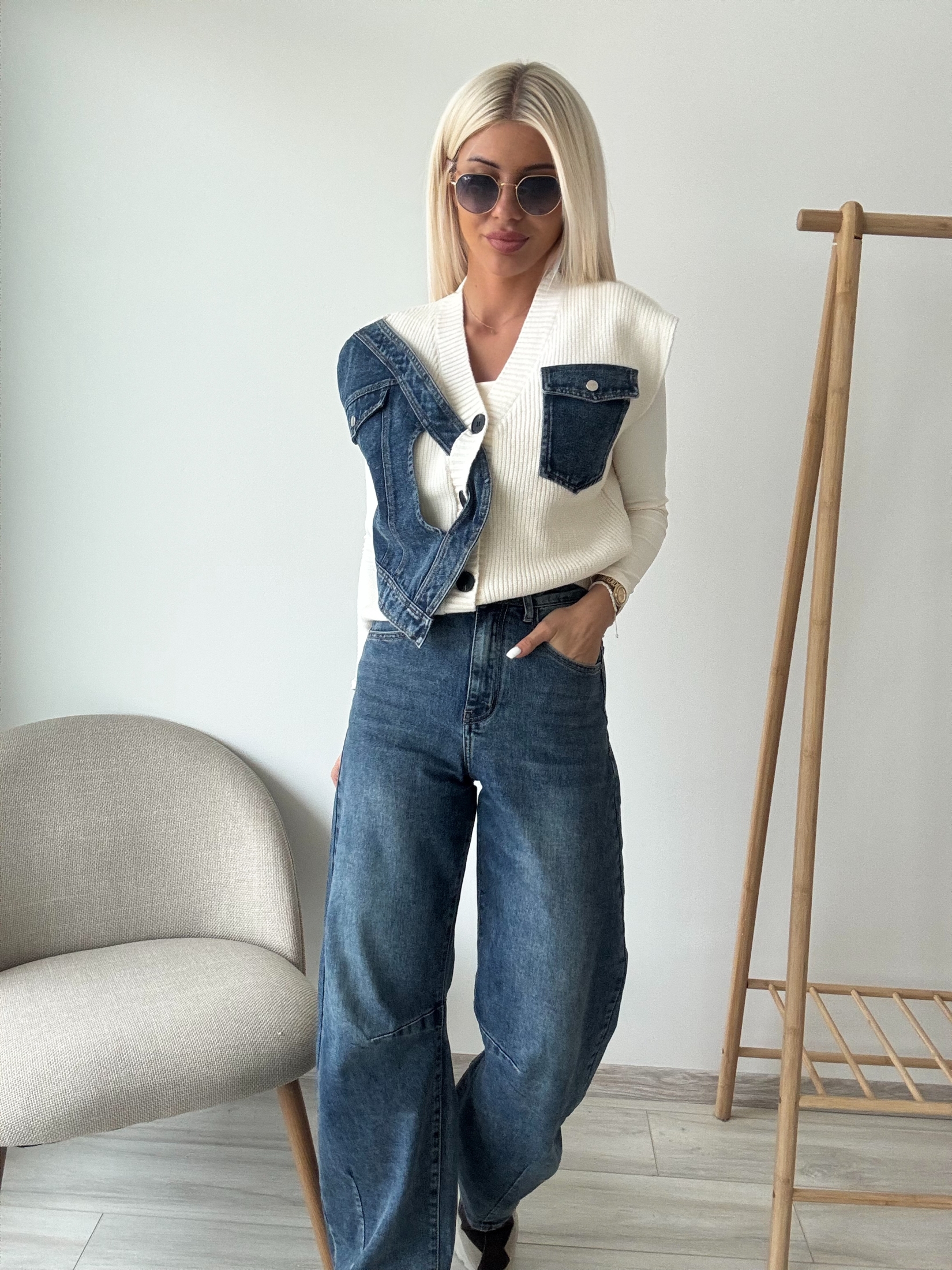 Този елек съчетава класическата елегантност на бялото с небрежния чар на денима. Резултатът е модерно и универсално облекло, което може да се носи както през пролетта, така и през лятото. Белият цвят придава изчистен и стилен вид, докато деним елементите добавят текстура и интерес.
