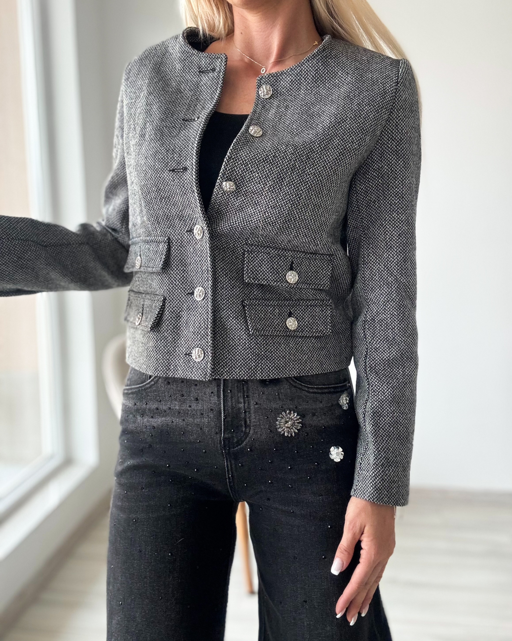 Елегантно вълнено сако в класически сив цвят. Подходящо за всеки стил и повод.