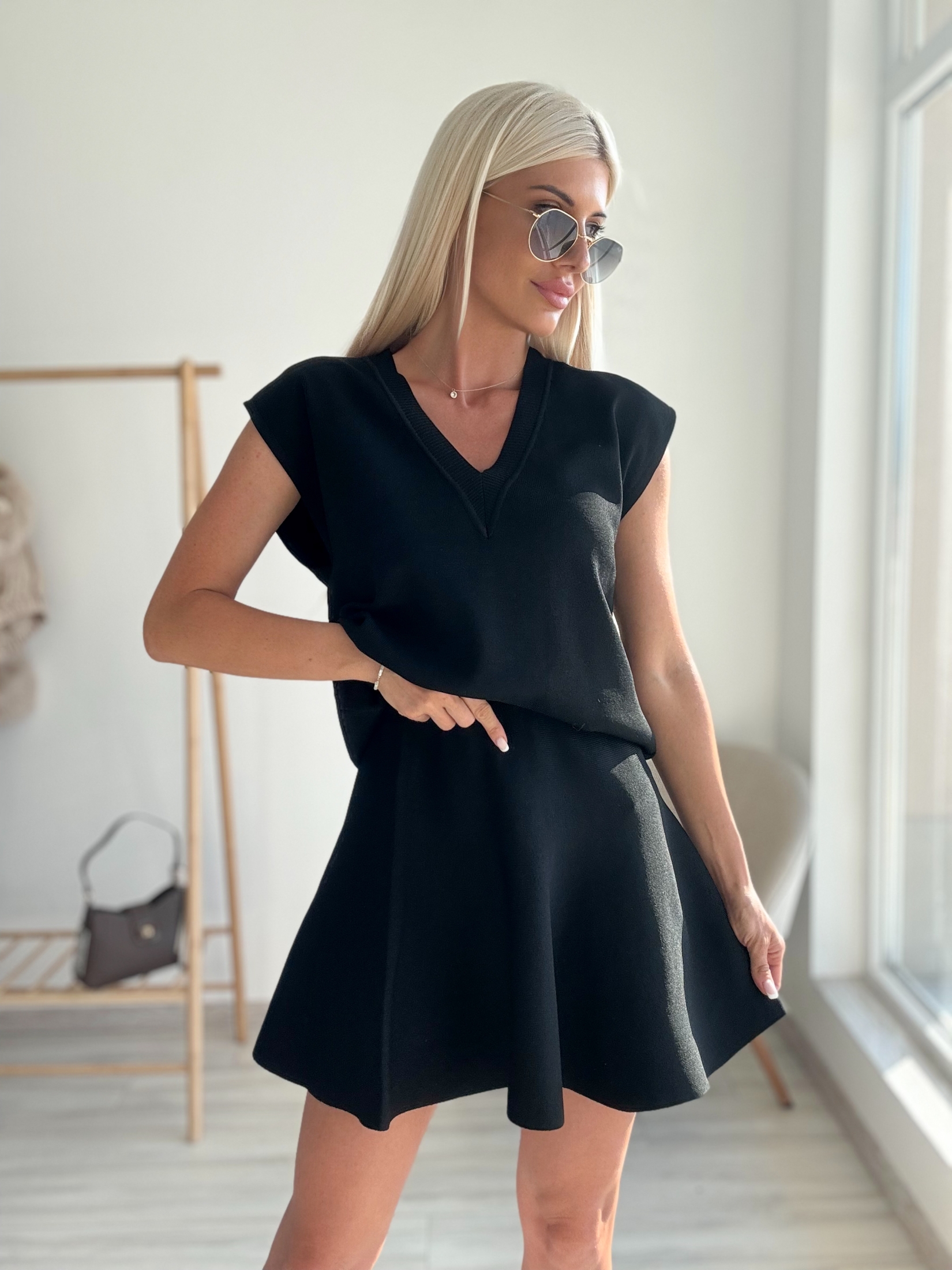 Елегантен черен сет с V-образно деколте и пола, идеален за специални поводи или стилна визия. Подчертава фигурата и осигурява комфорт.