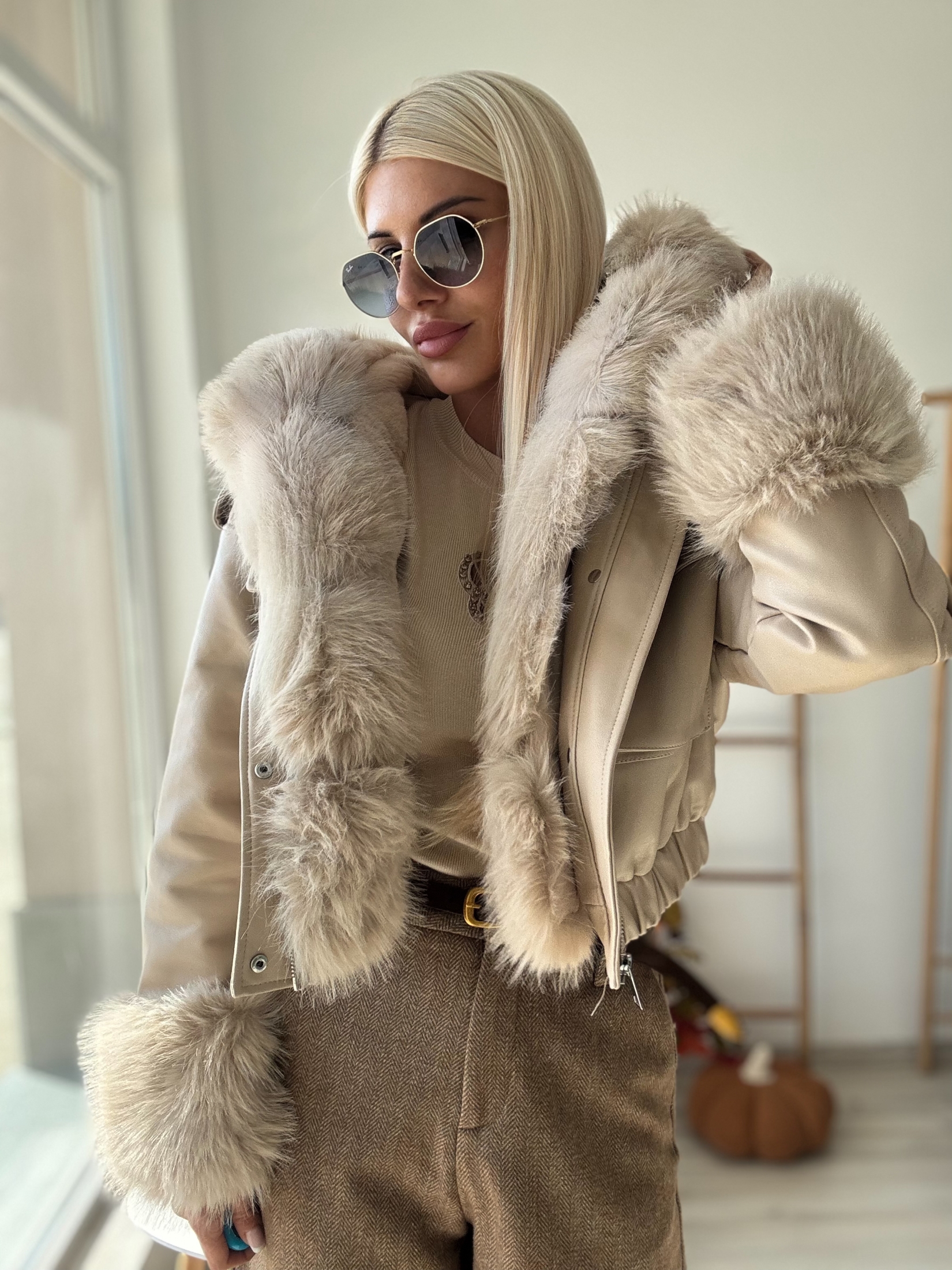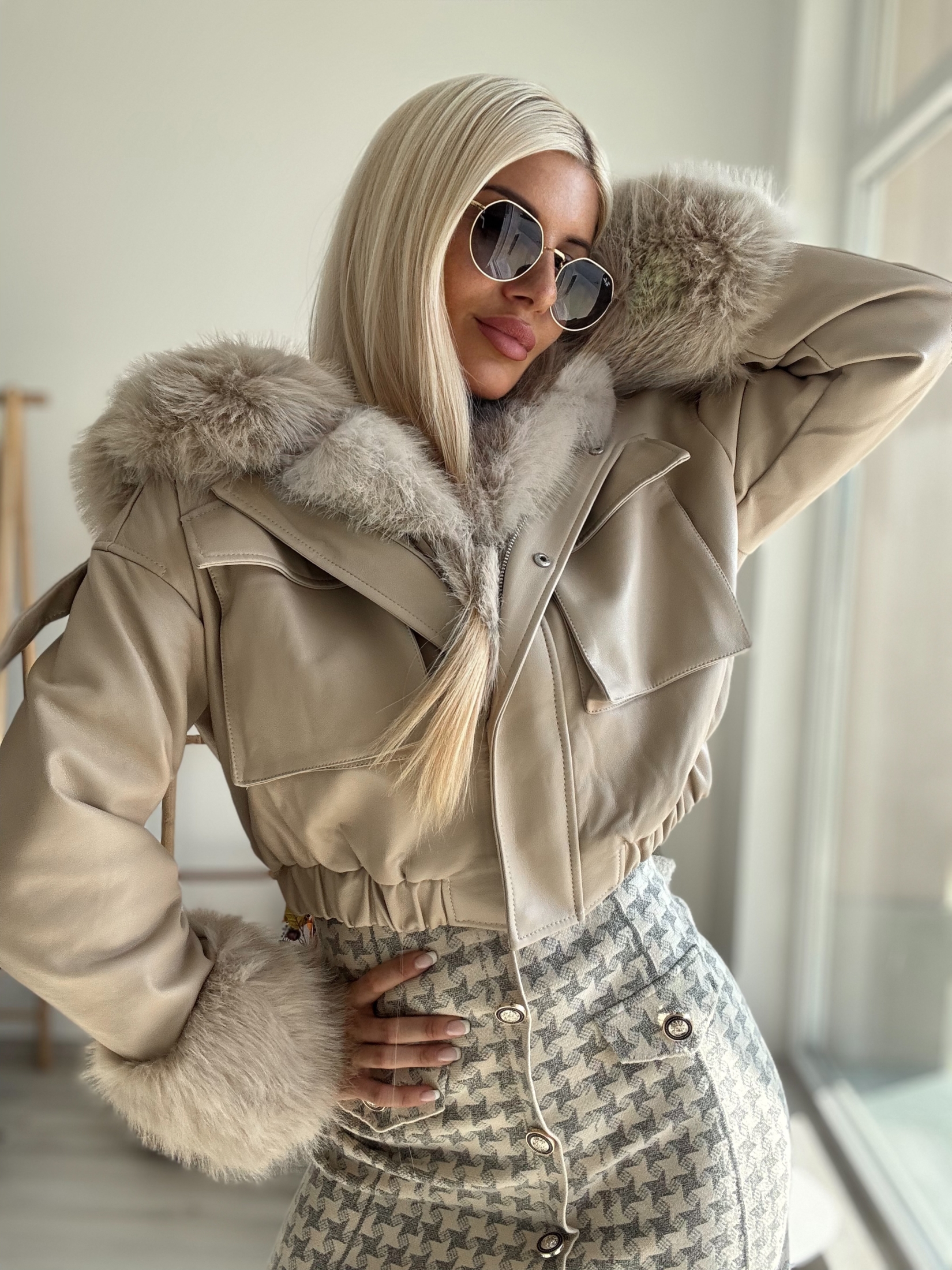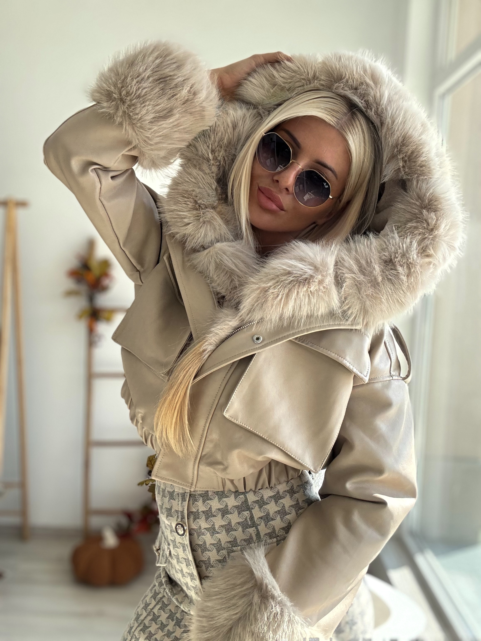 Насладете се на топлина и стил с нашето яке с пух в екрю! Идеално за студените дни, то предлага нежен комфорт и елегантен външен вид.