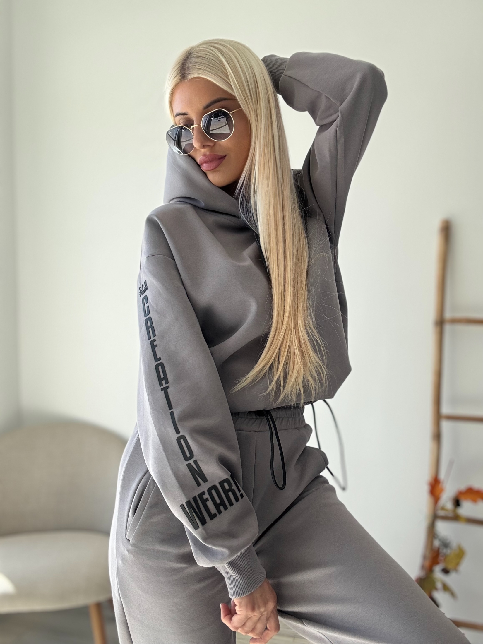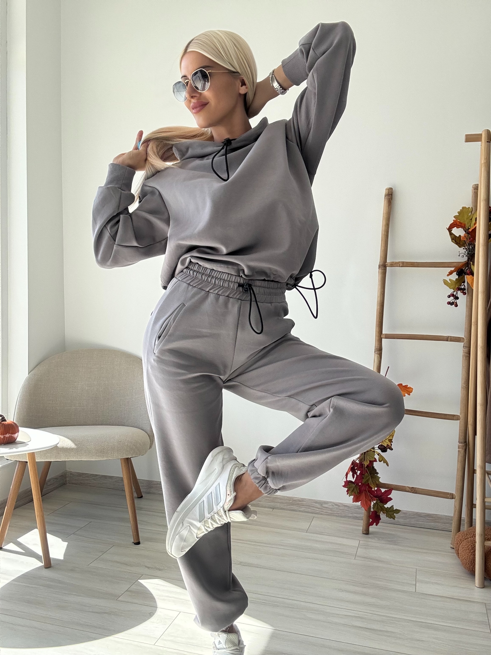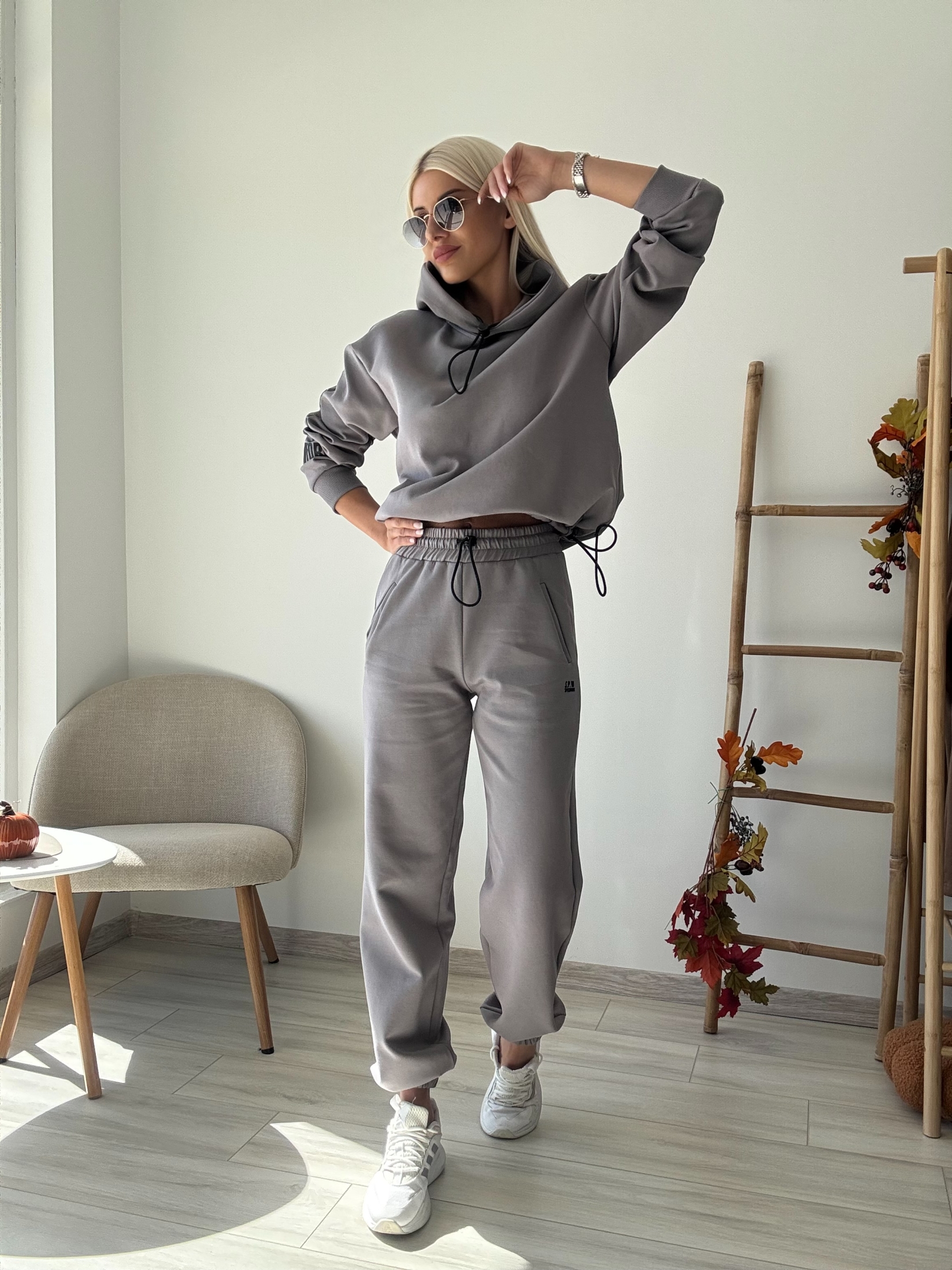 Този комплект е изработен от висококачествена, мека материя, която нежно обгръща тялото и осигурява несравним комфорт. Независимо дали сте на път, у дома или на среща с приятели, ще се чувствате чудесно в него. Сивият цвят е класически и универсален, което го прави лесен за комбиниране с други дрехи и аксесоари.