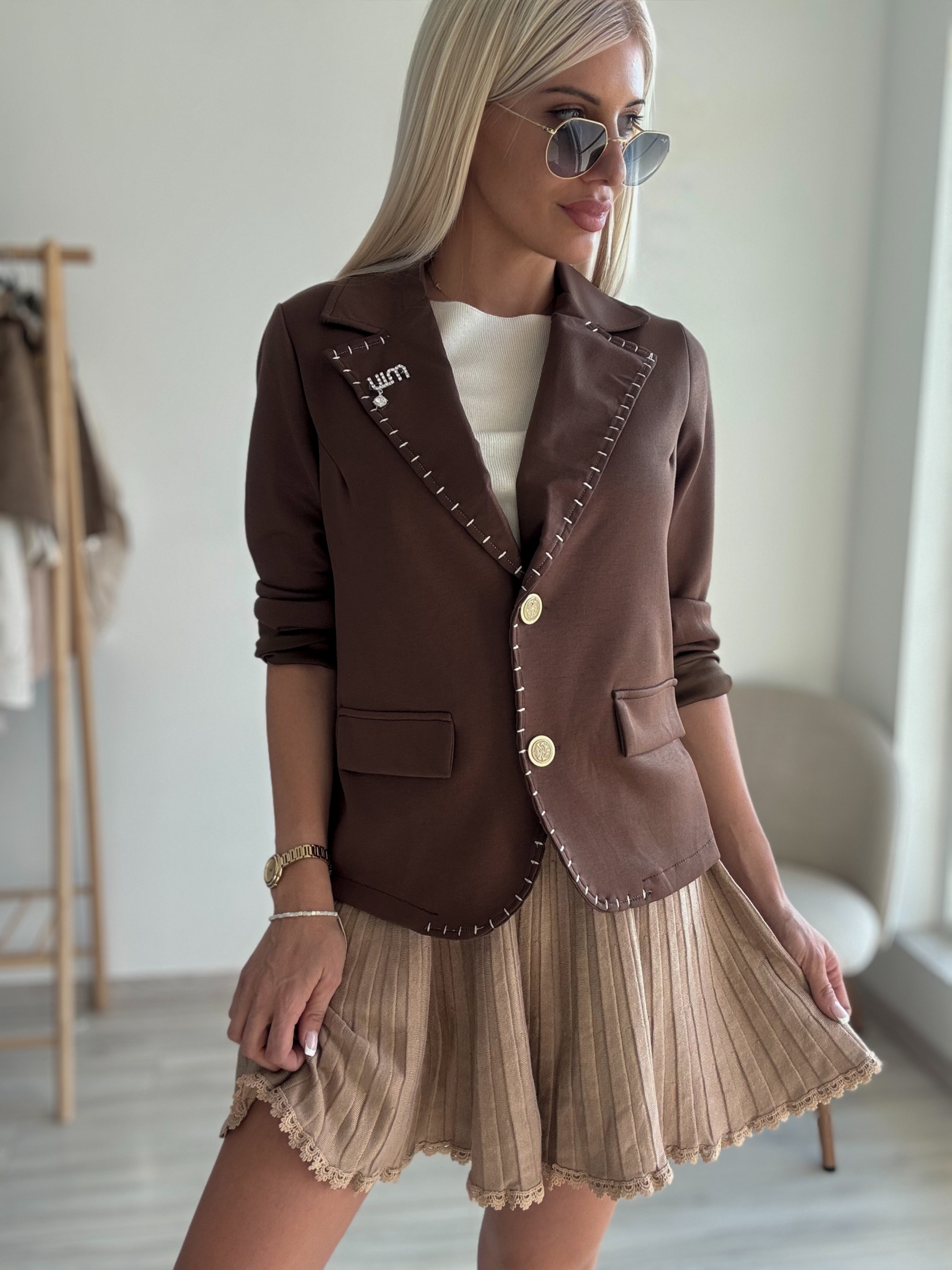 Елегантно кафяво сако с брошка – Добавете стил към визията си!
