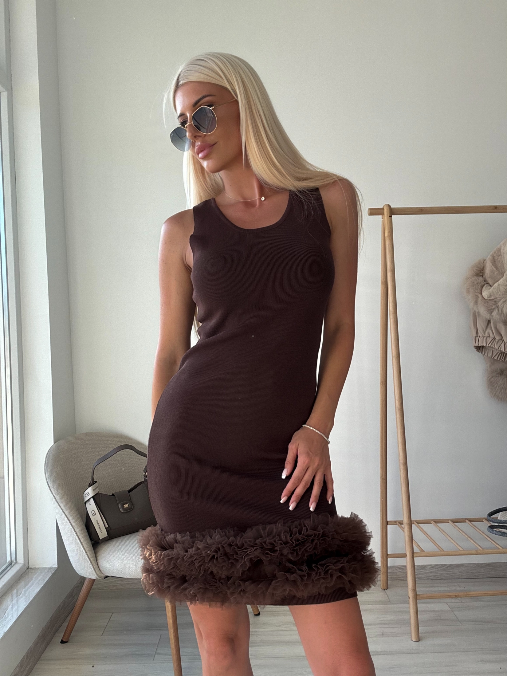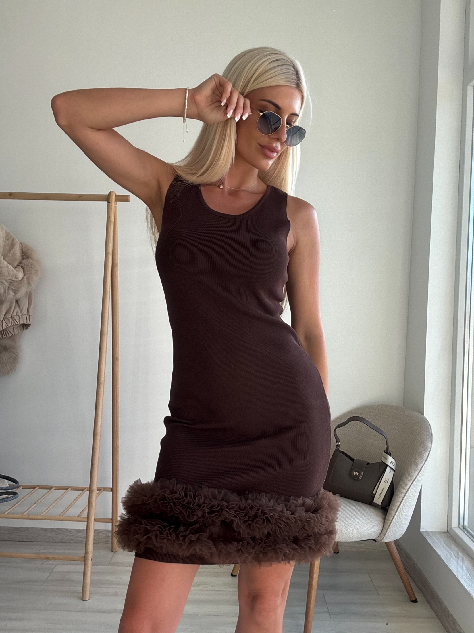 Изискана и съблазнителна, тази кафява рокля по тялото с тюл е перфектният избор за специални поводи, където искате да се откроите с елегантност и стил. Подчертавайки естествените ви форми, тази рокля ще ви накара да се чувствате уверени и красиви.