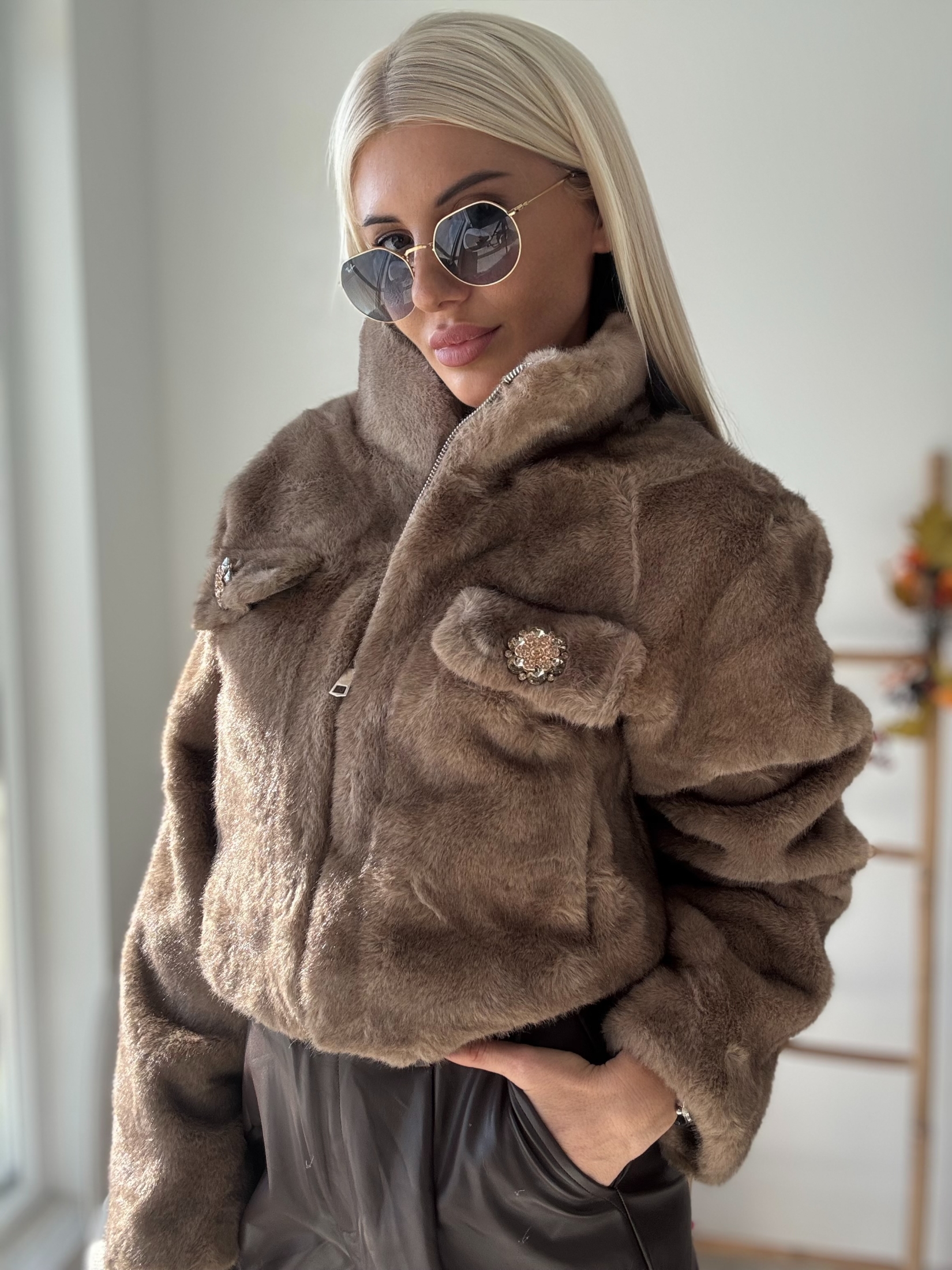 Това кафяво пухкаво палто е идеално за студените дни. Със своя уникален дизайн с камъни, то ще ви осигури топлина и стил.