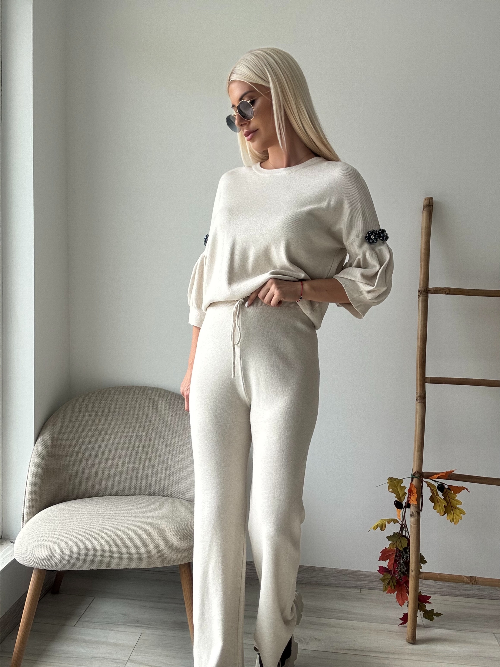Елегантен екрю комплект, украсен с камъни на ръкава, придаващ изискан блясък.