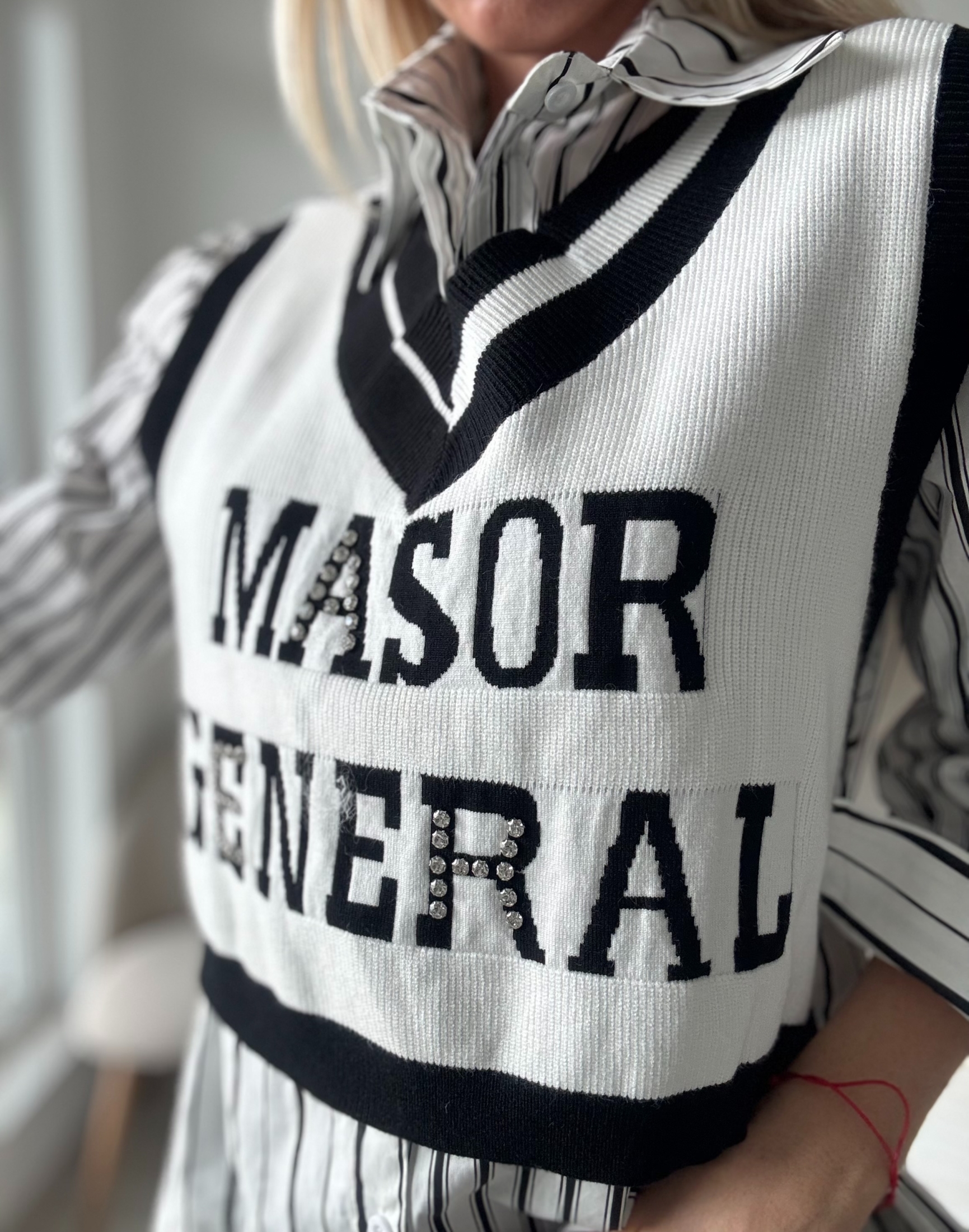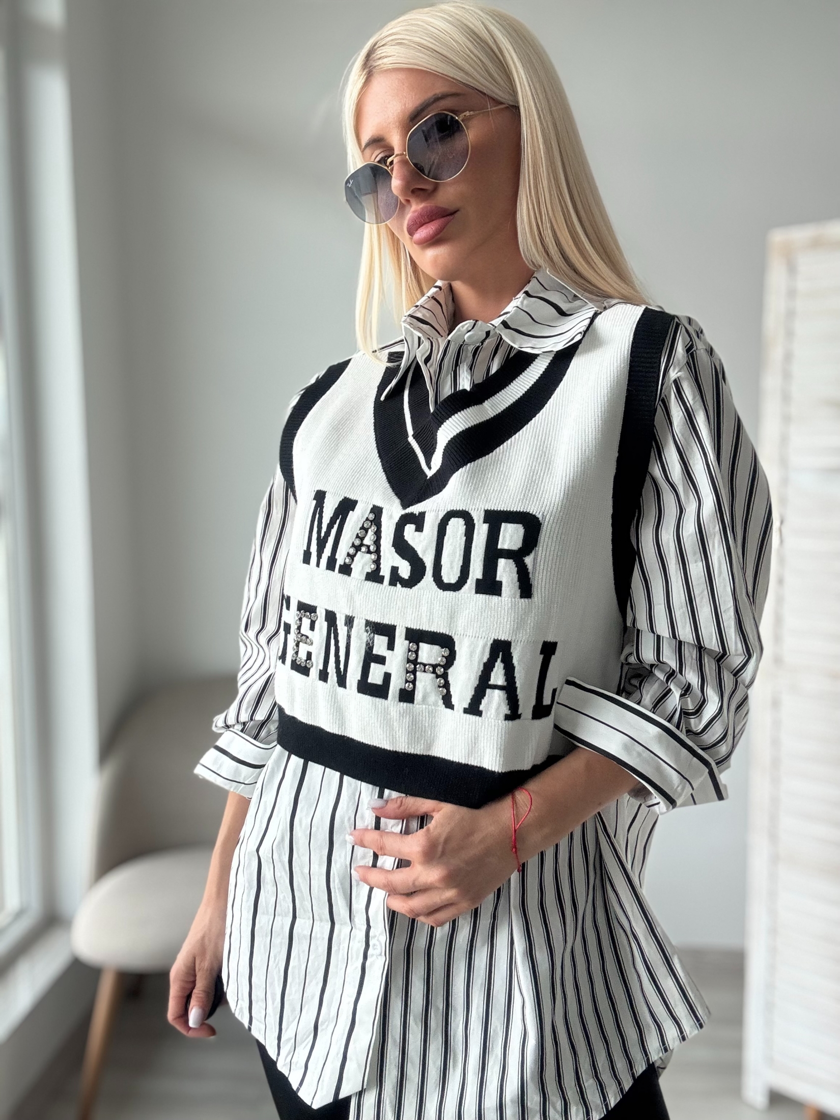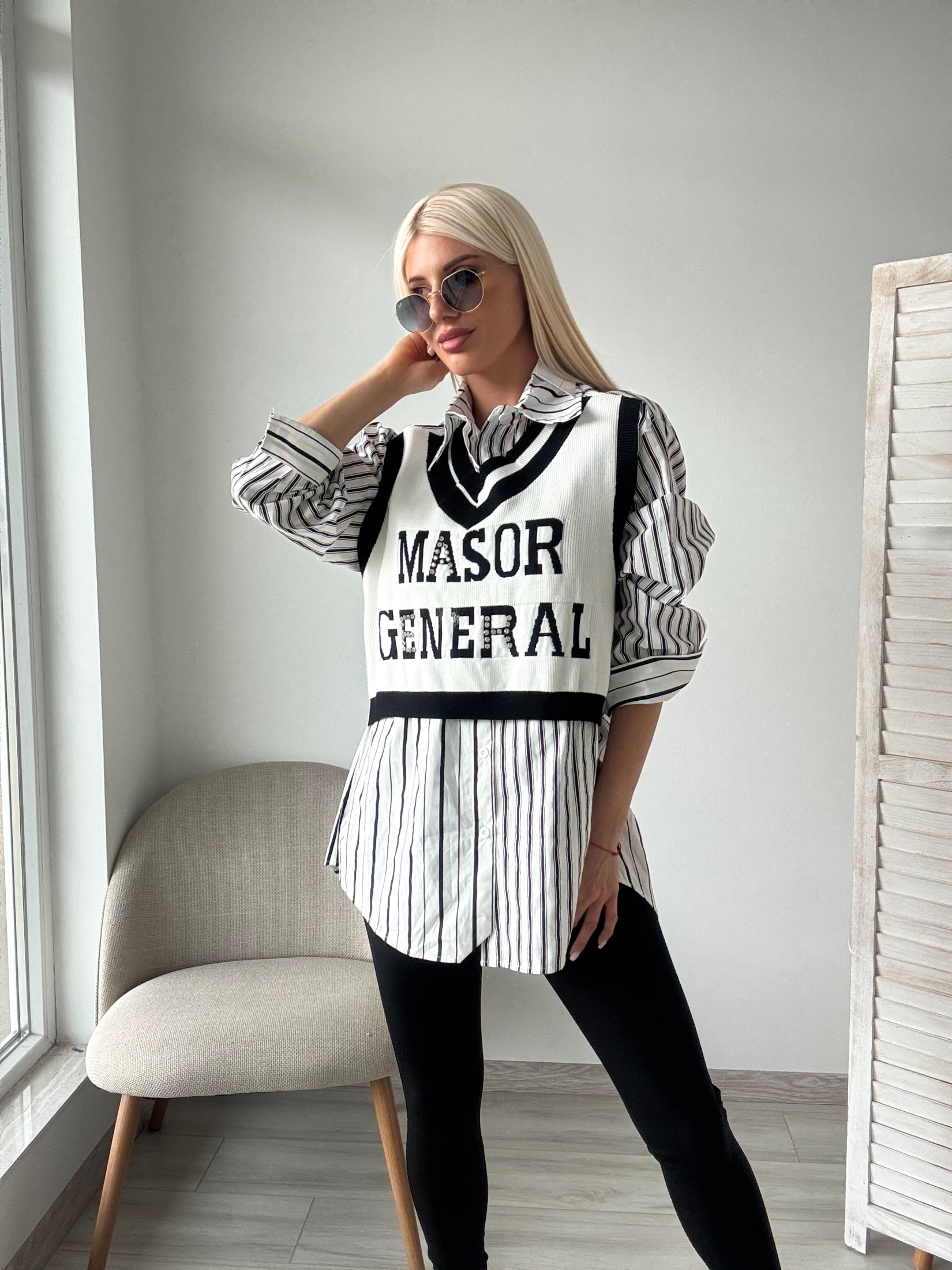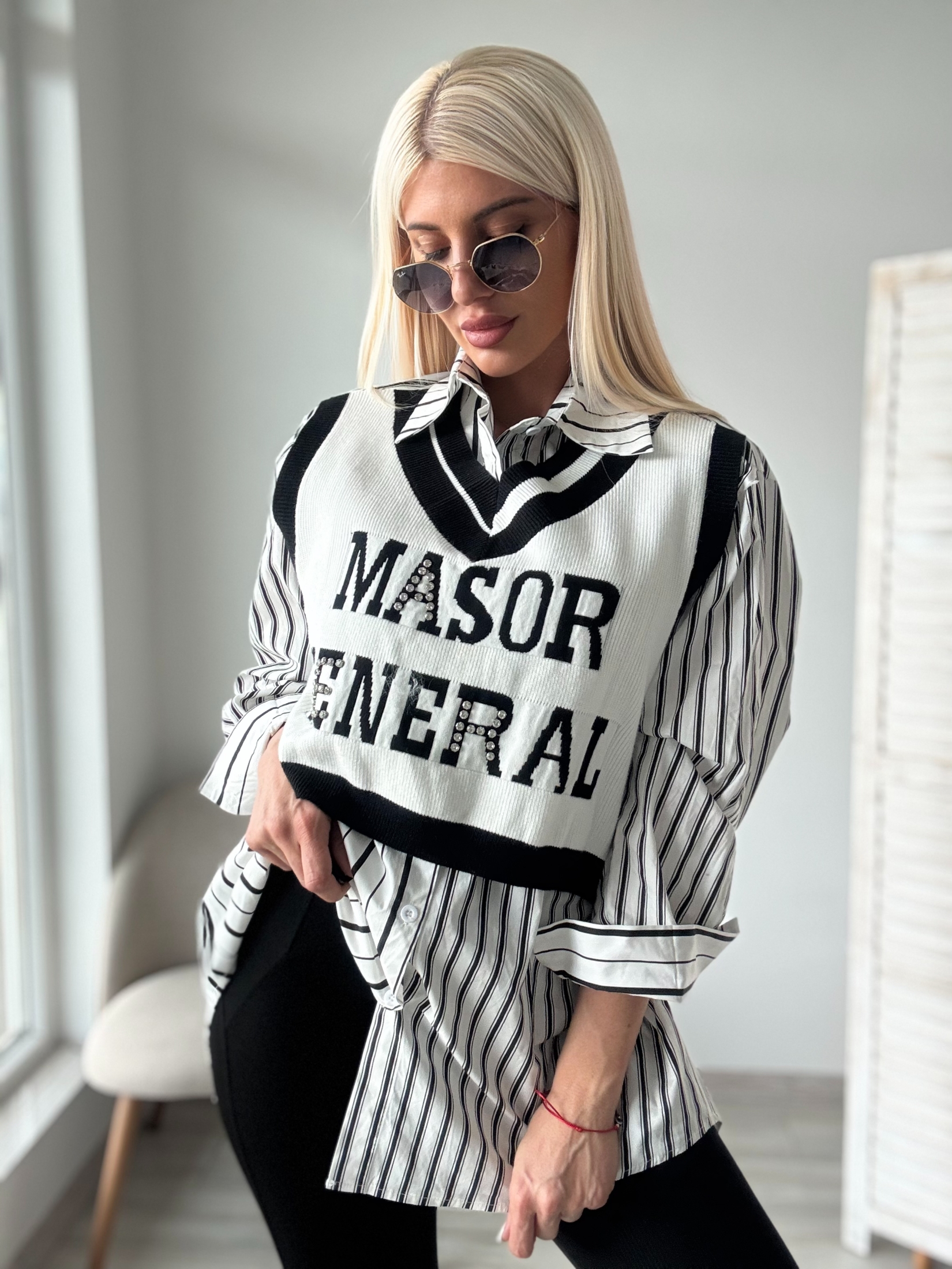 Ризата е изработена от висококачествени материали, които осигуряват мекота и дишане през целия ден. Ефектният плетен елек е умело интегриран в дизайна, създавайки илюзията за два отделни елемента, което придава модерен и изтънчен вид.