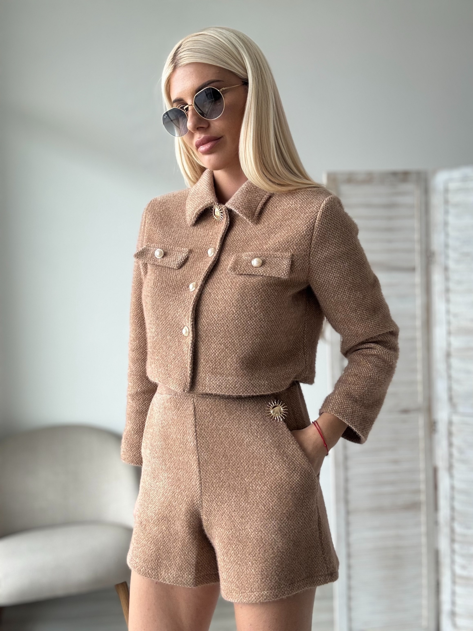 Елегантен бежов сет, включващ стилно палто и къси панталони. Перфектен за създаване на изискана и модерна визия.