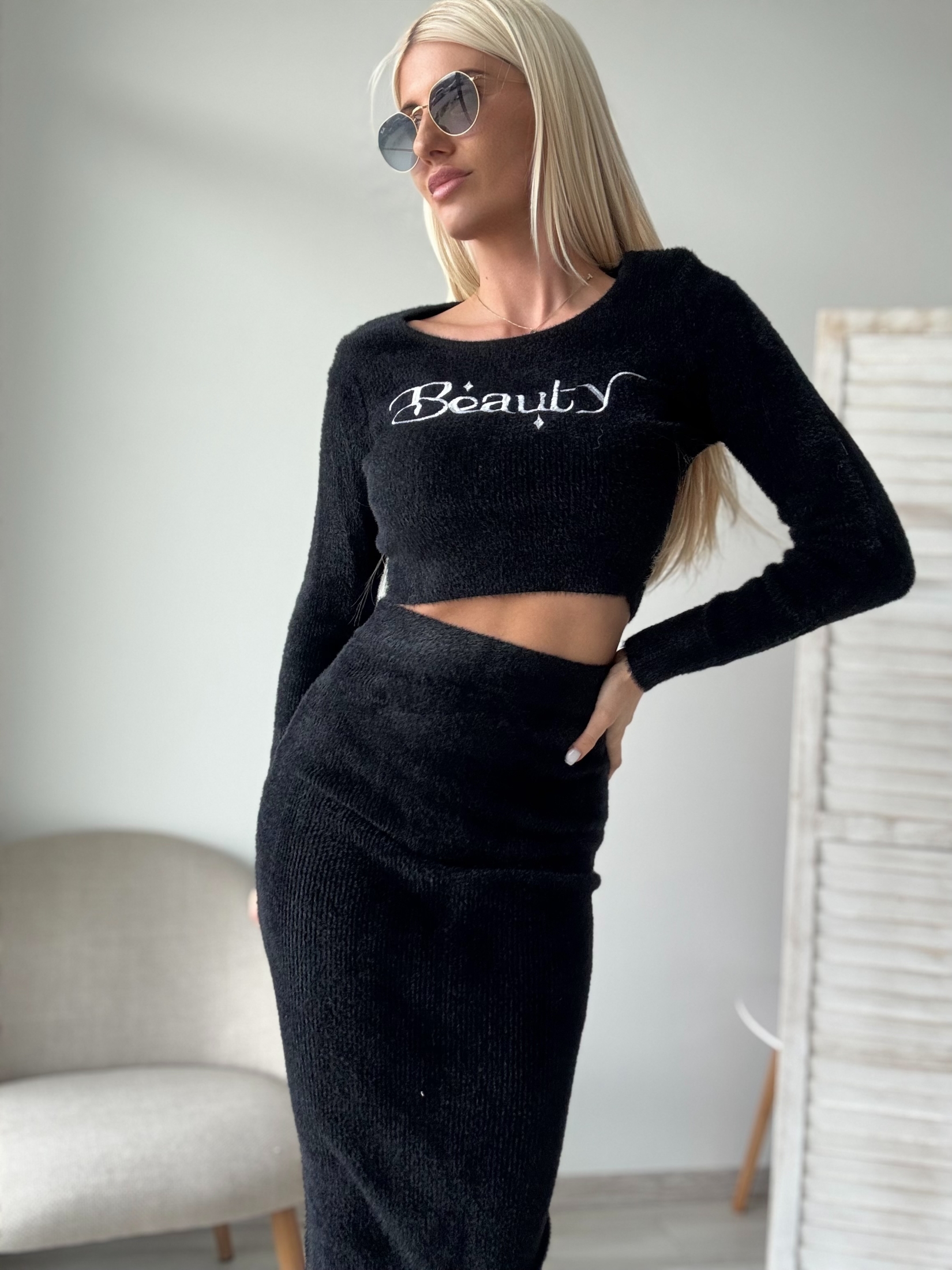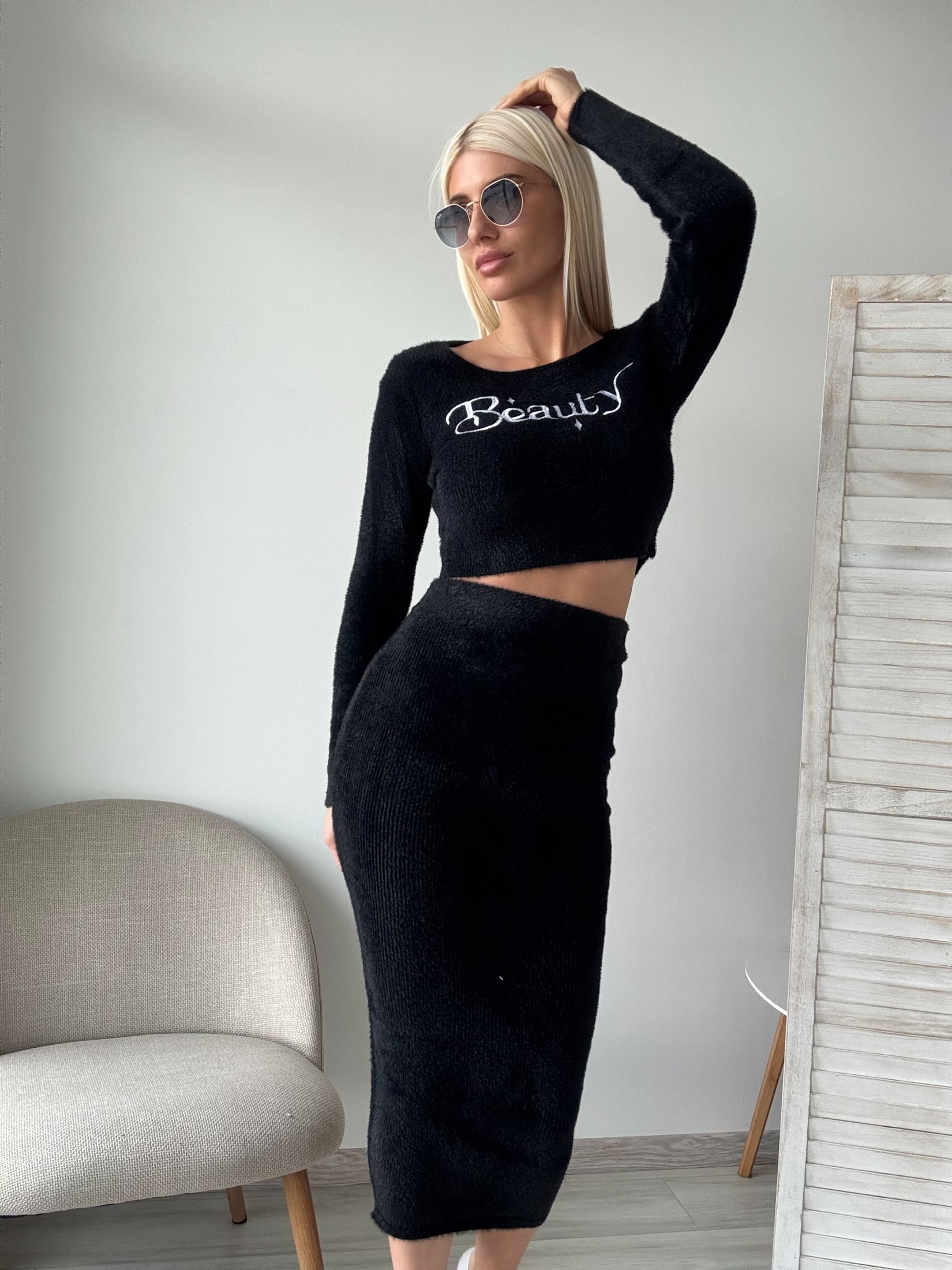 Плюшен Черен Комплект с Пола – Елегантност и Комфорт в Едно