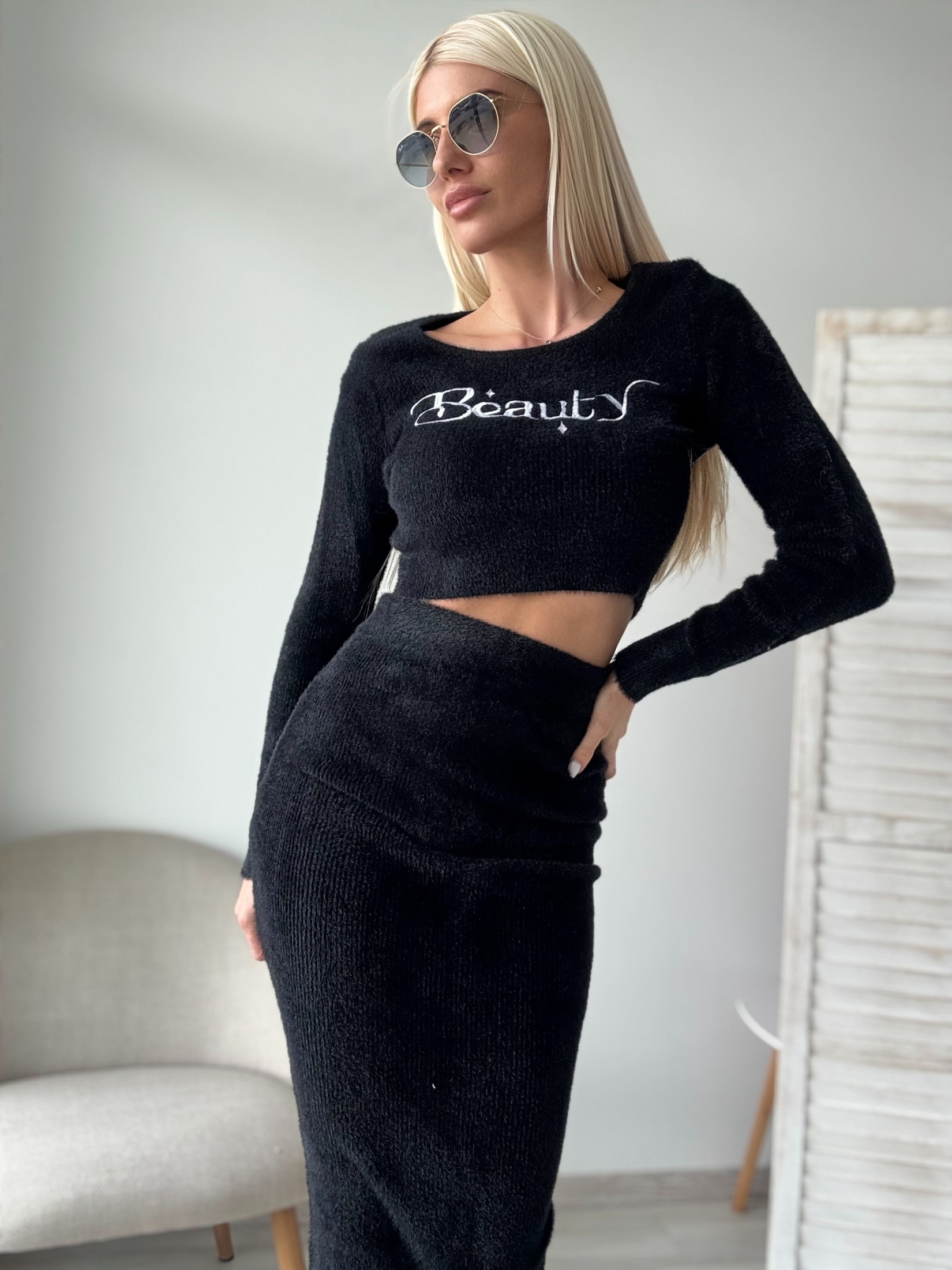 Потопете се в комфорт с нашия плюшен черен комплект с пола! Идеален за релакс у дома или за стилна визия. Мека и уютна материя, която гали кожата.