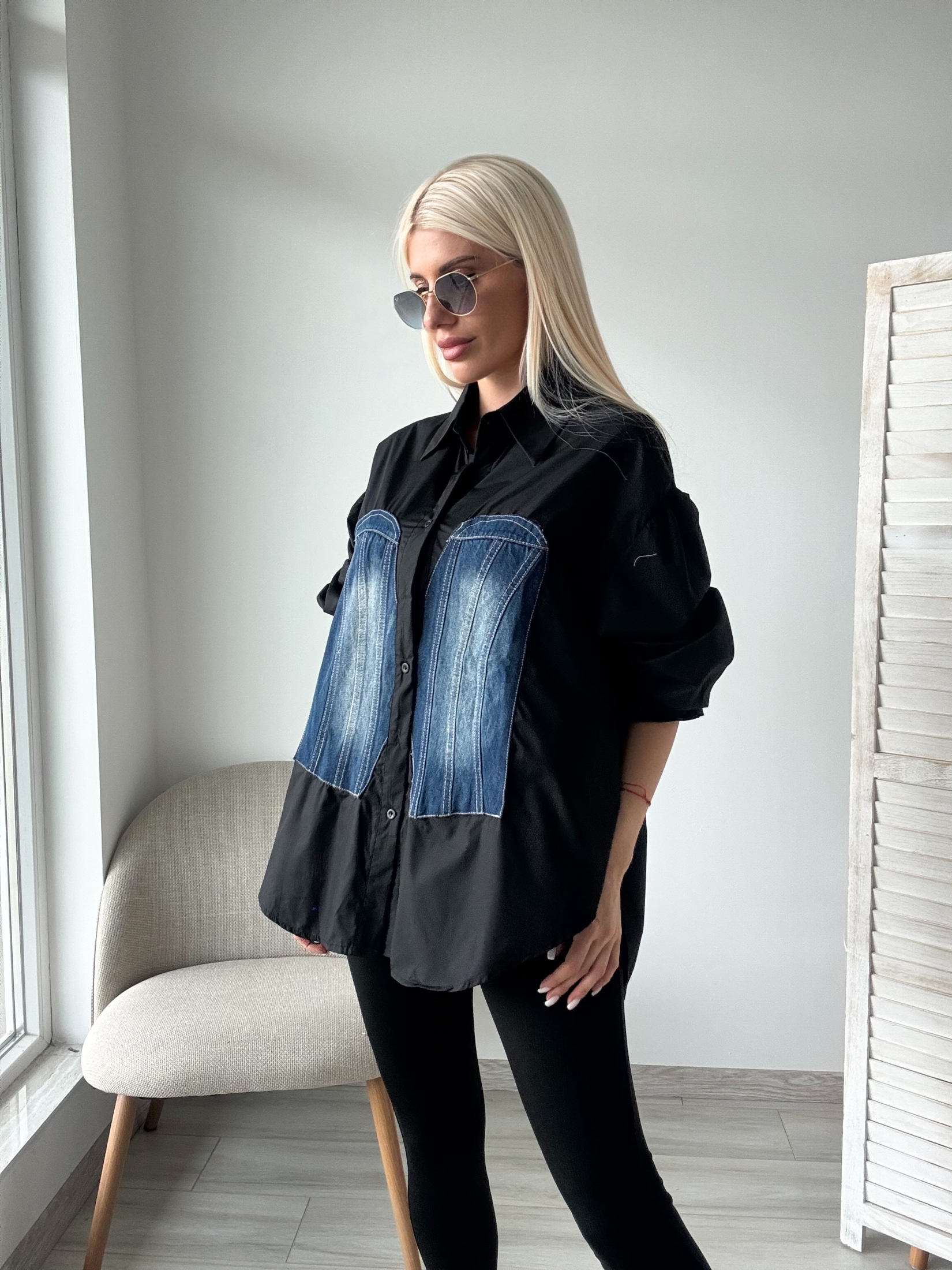 - Деним акценти: Деним елементите добавят модерен и небрежен вид към класическата черна риза.
