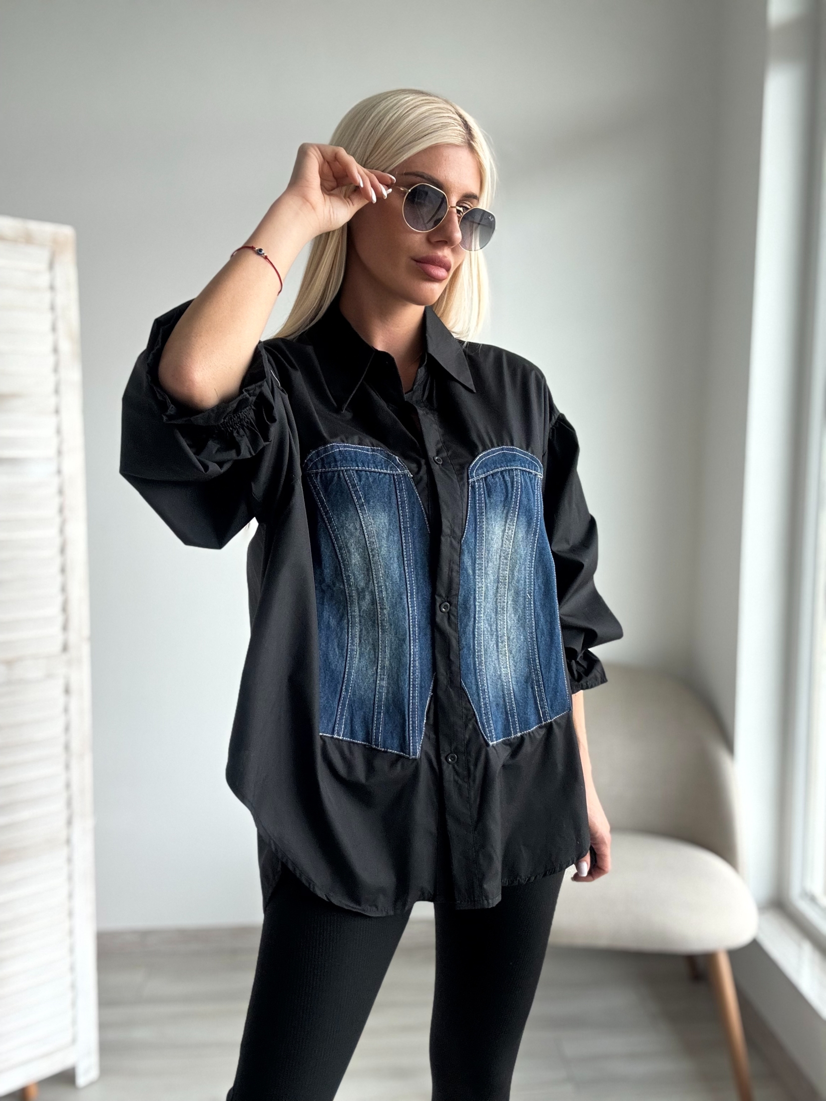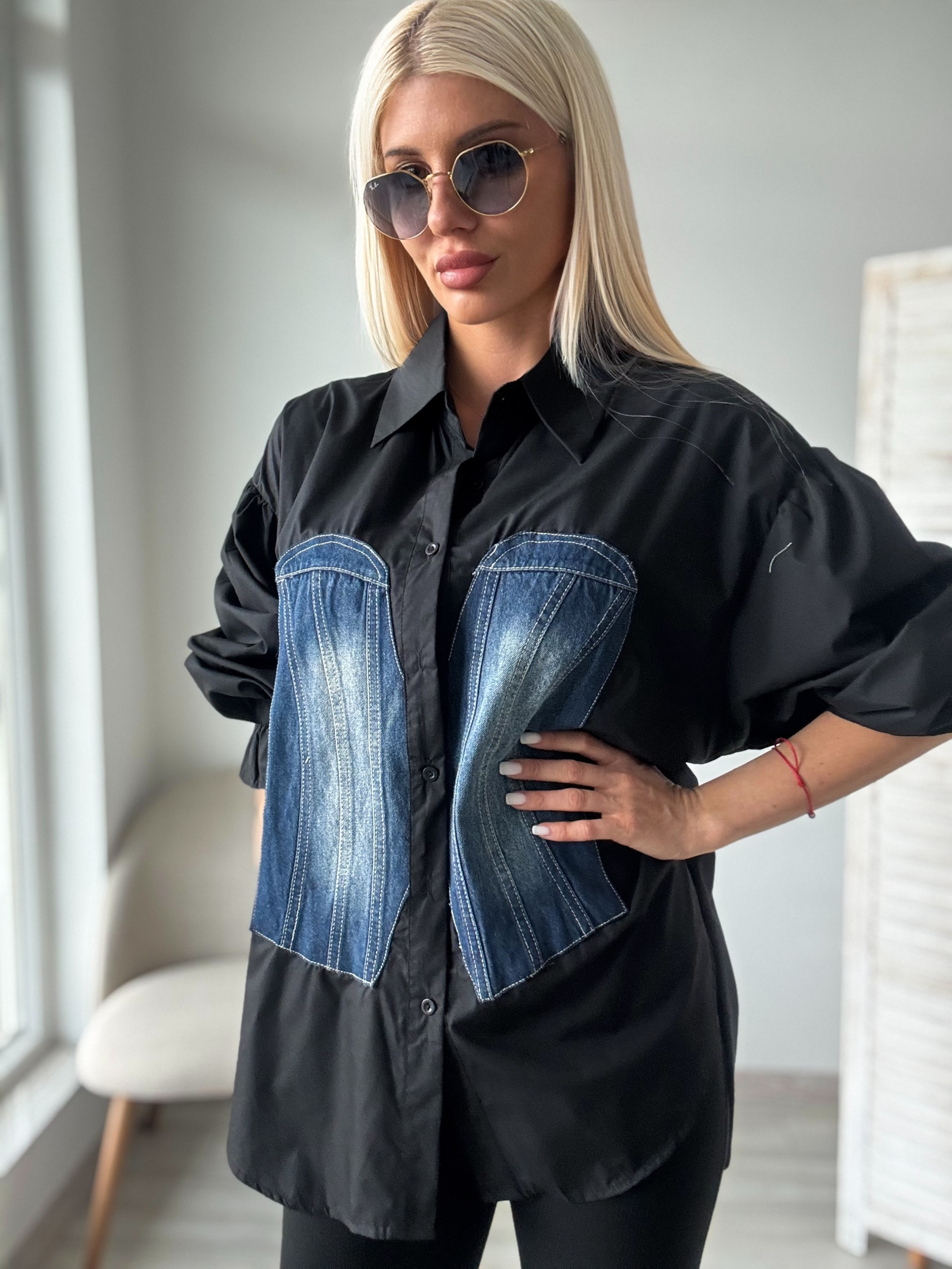 Нашата черна риза с деним акценти е перфектният начин да изразите своя индивидуален стил. Независимо дали я комбинирате с елегантен панталон или с дънки, тази риза ще ви осигури уверен и стилен външен вид. Подходяща за всеки сезон, тя е чудесно допълнение към вашия гардероб.