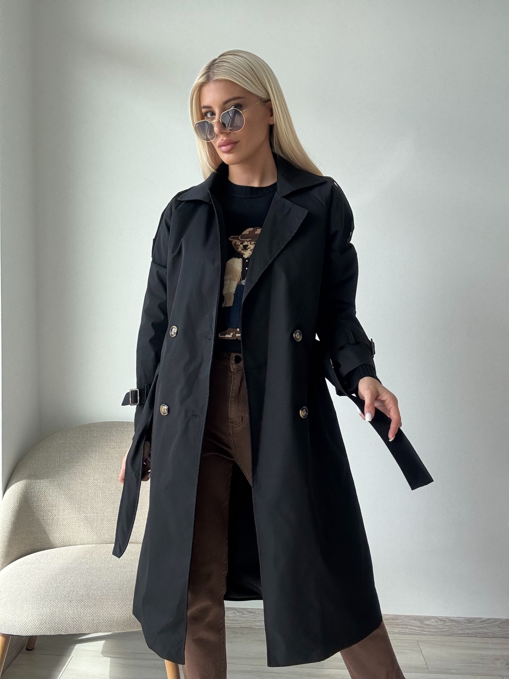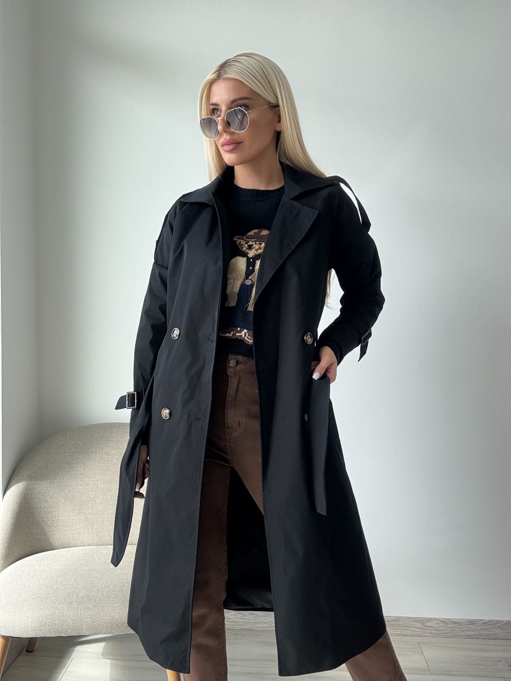 Елегантен дълъг черен тренч, идеален за стилна защита през преходните сезони. Подчертава силуета и добавя изисканост към всяка визия.