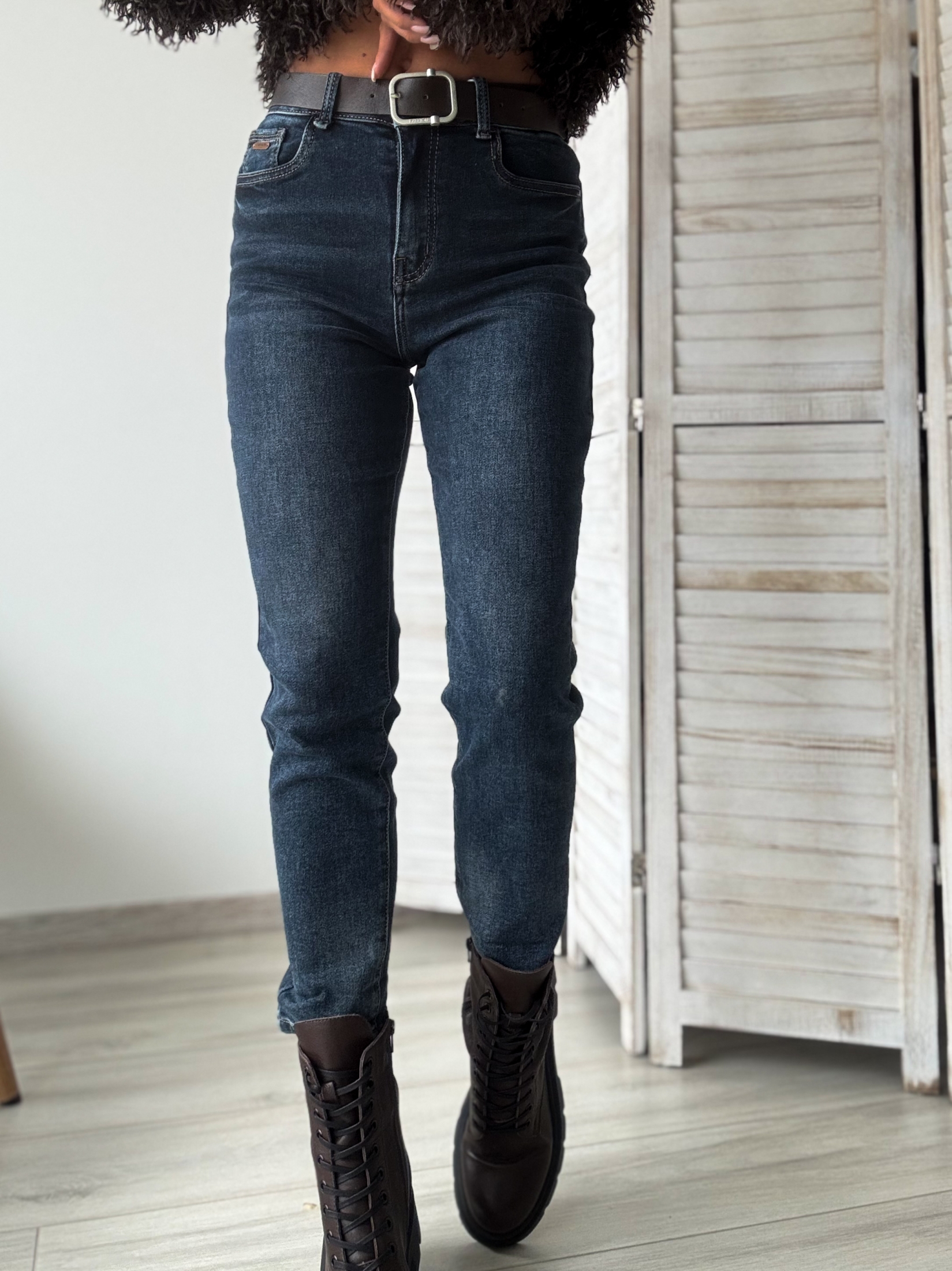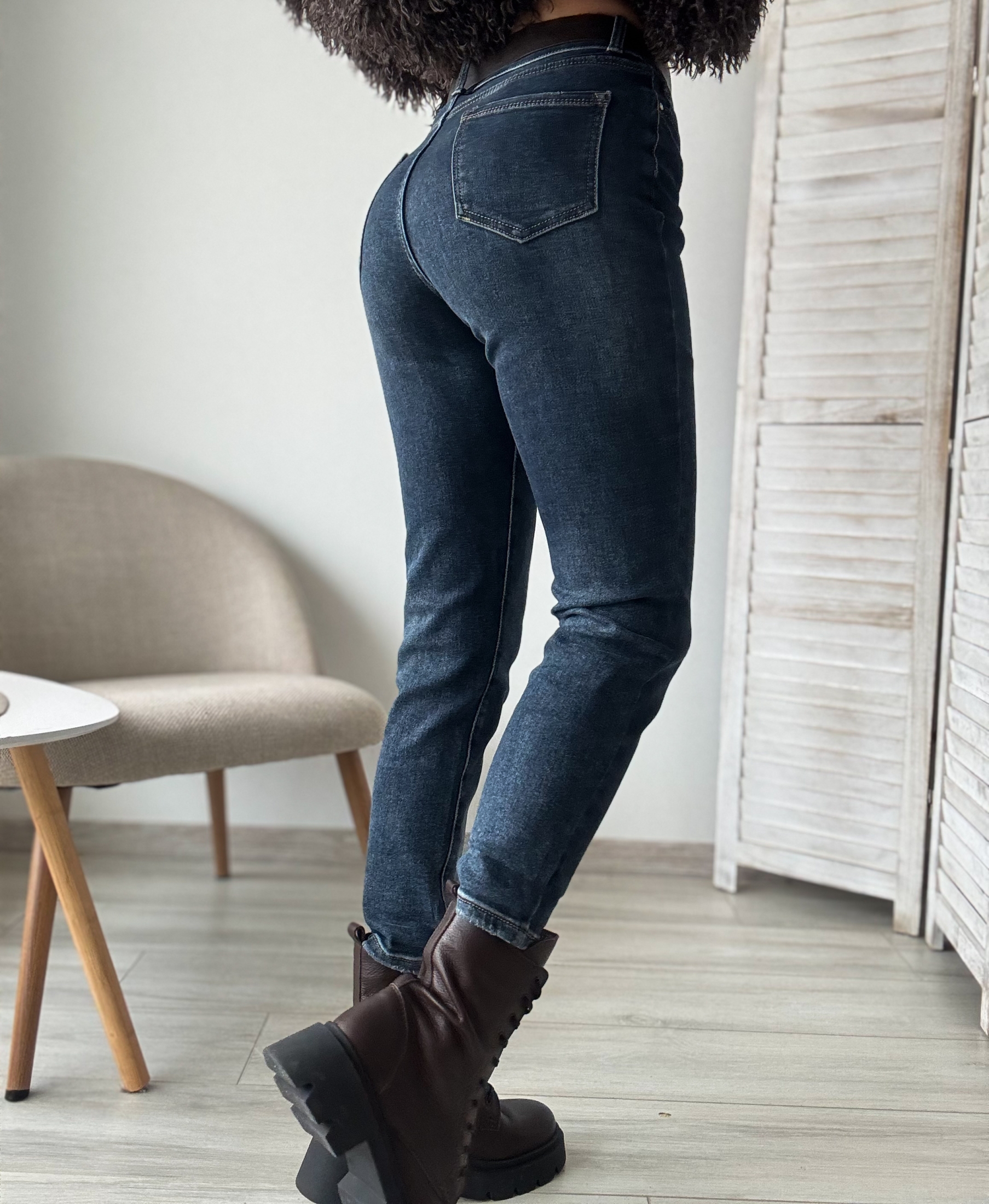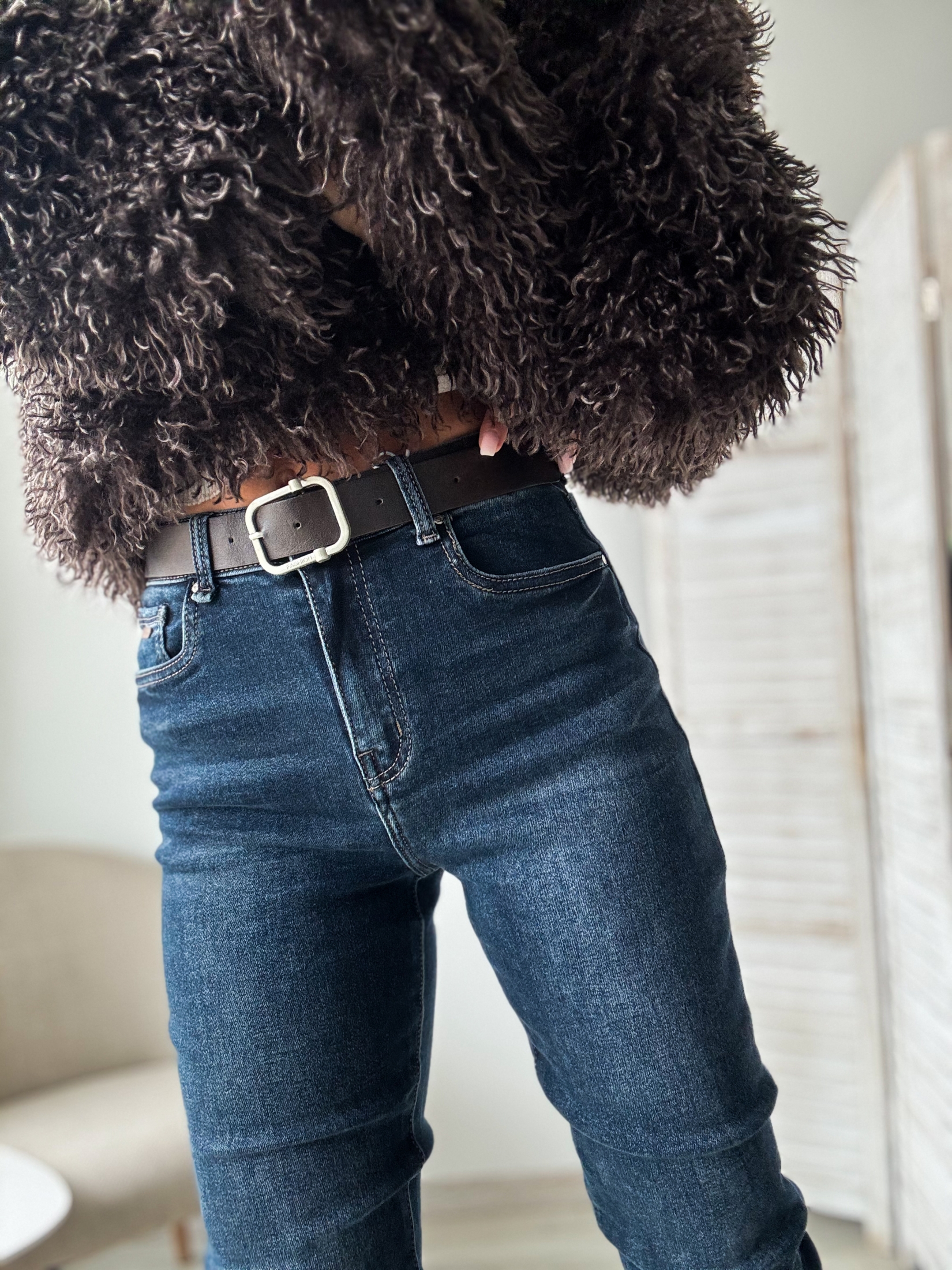 Стилни индиго дънки с акцент - кафяв колан. Перфектни за ежедневно носене, осигуряват комфорт и модерен вид.