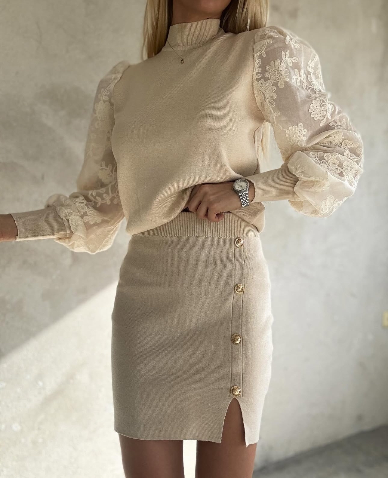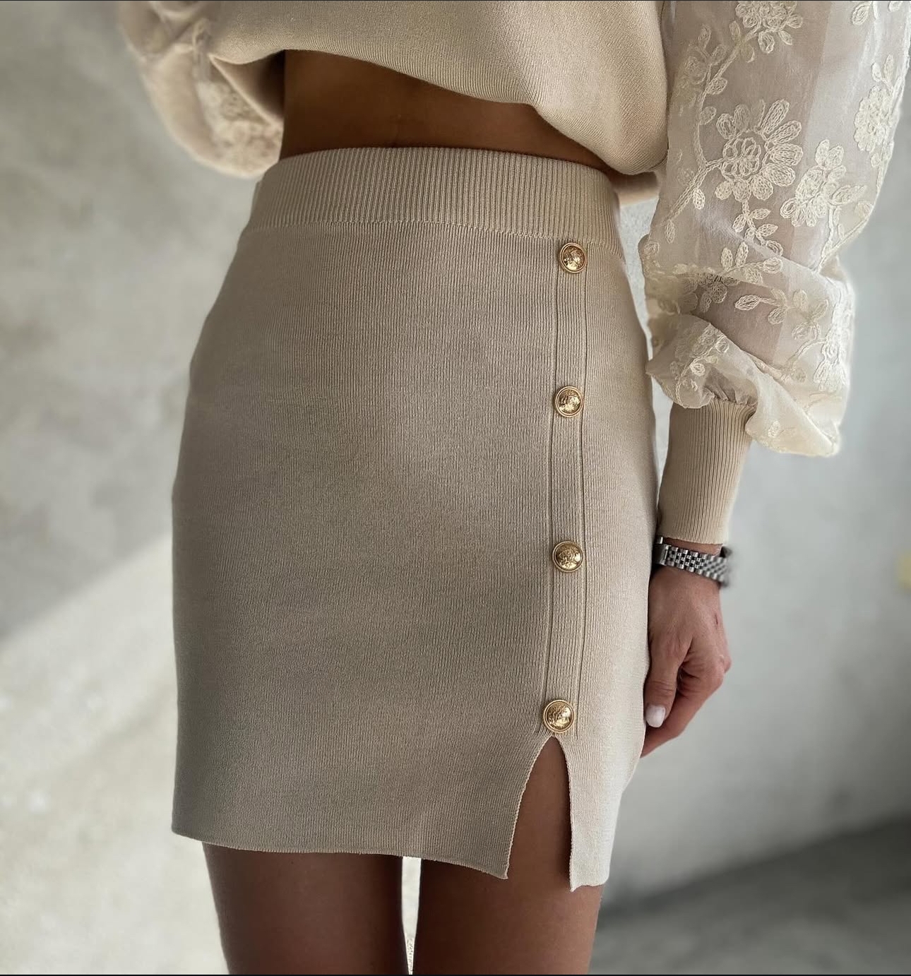 Изискана екрю пола, украсена със стилни златни копчета. Подходяща за всеки повод, тази пола добавя елегантност и финес към вашата визия.