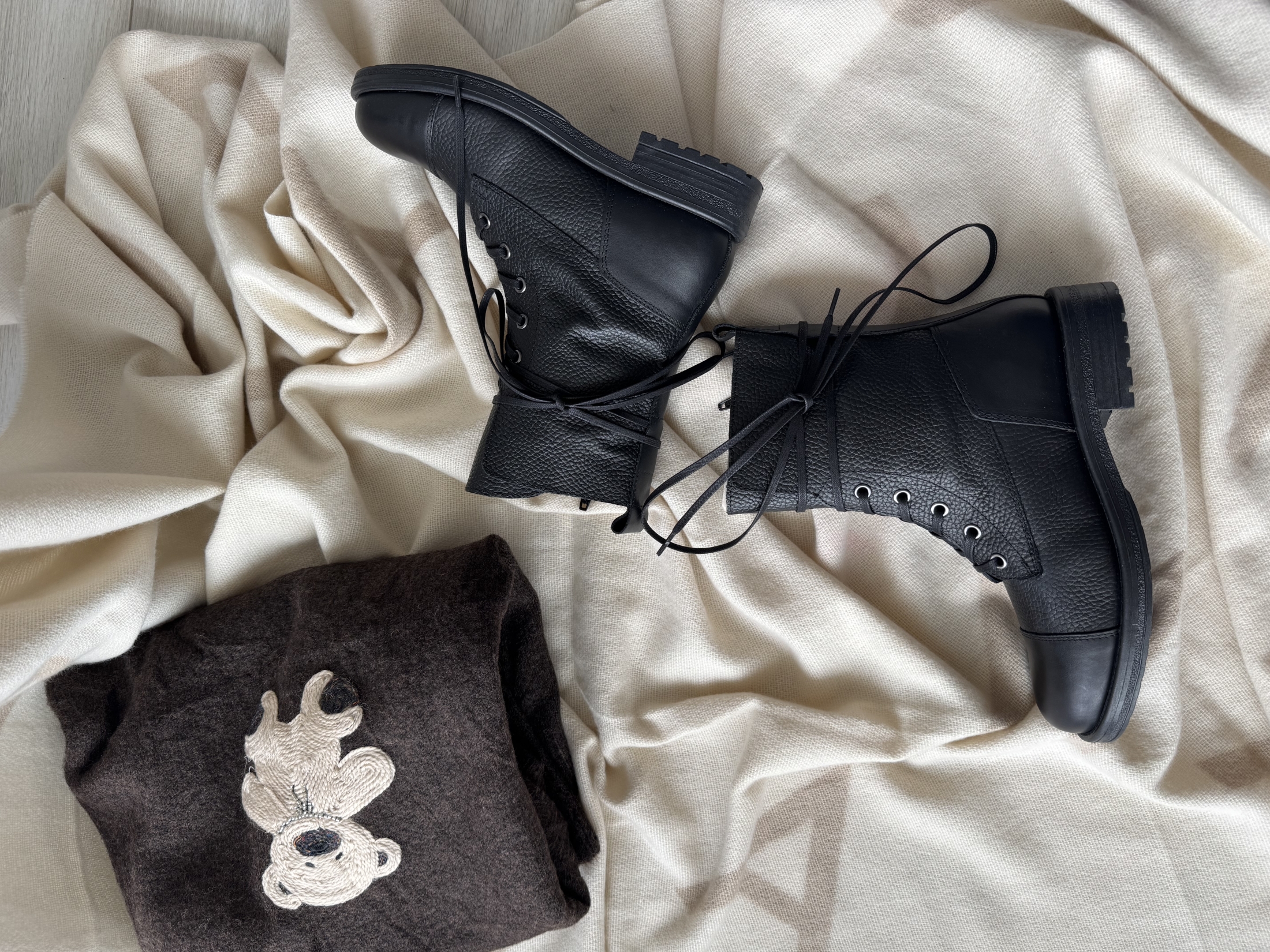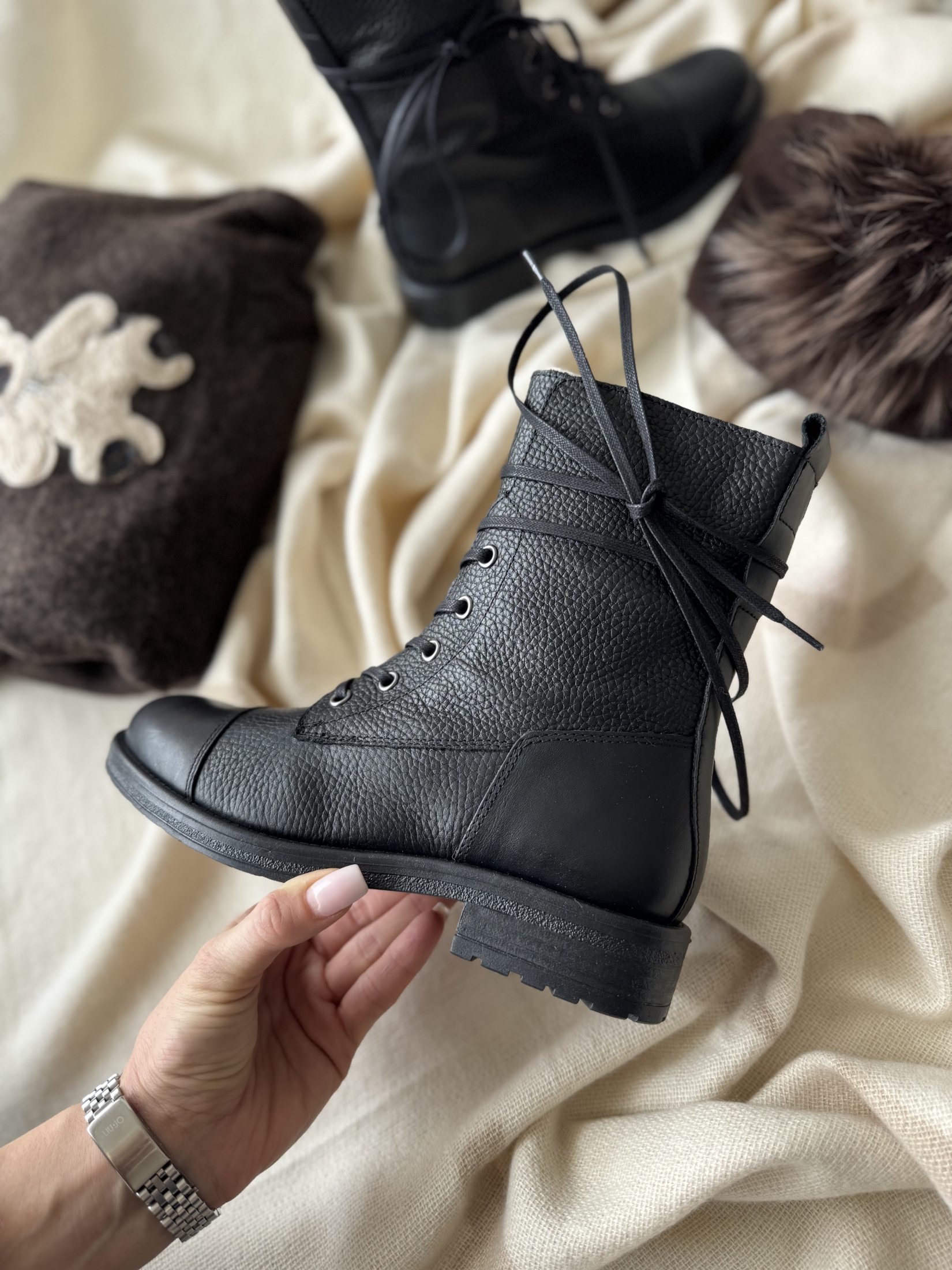 Черни боти с връзки естествена кожа