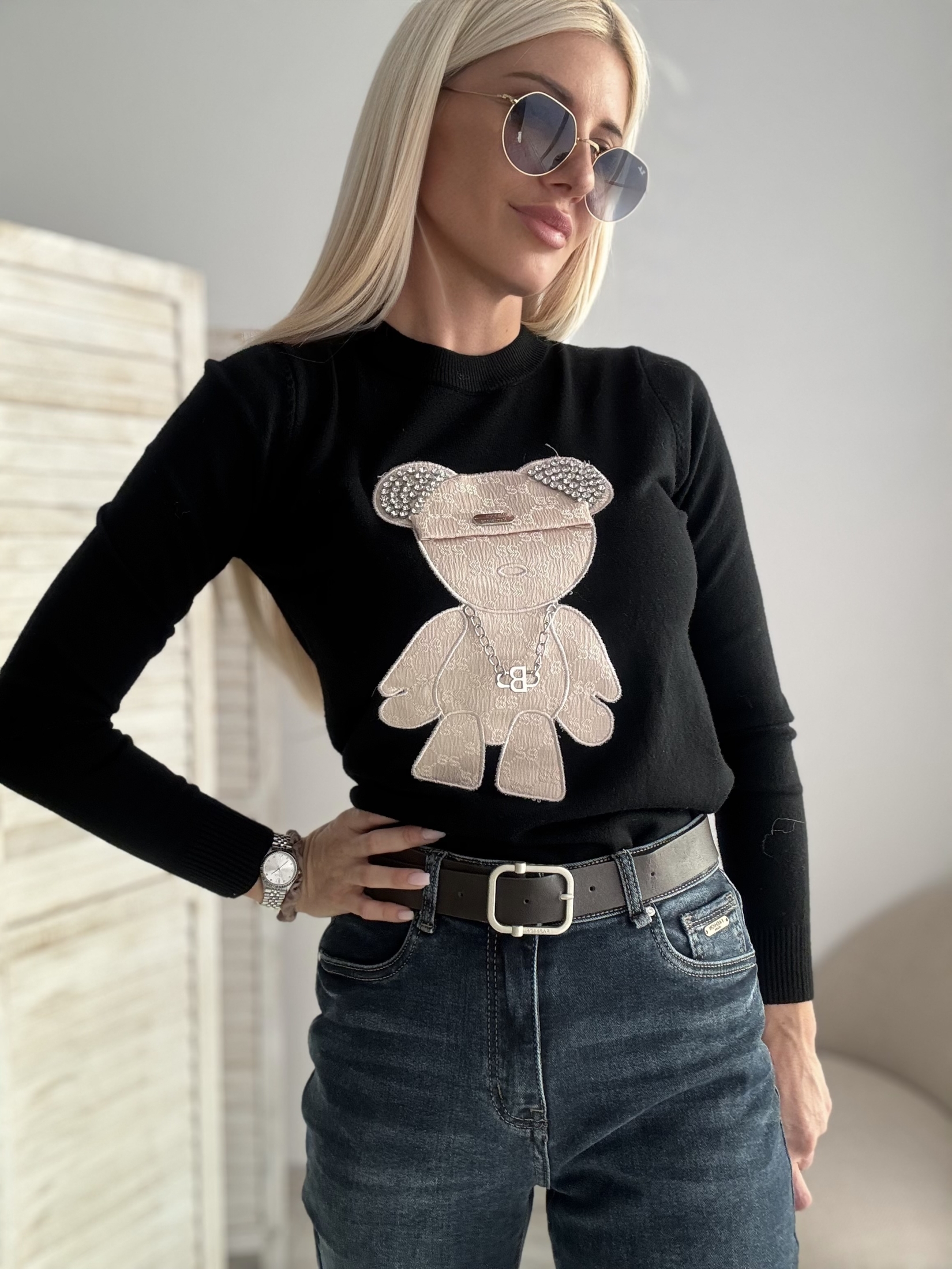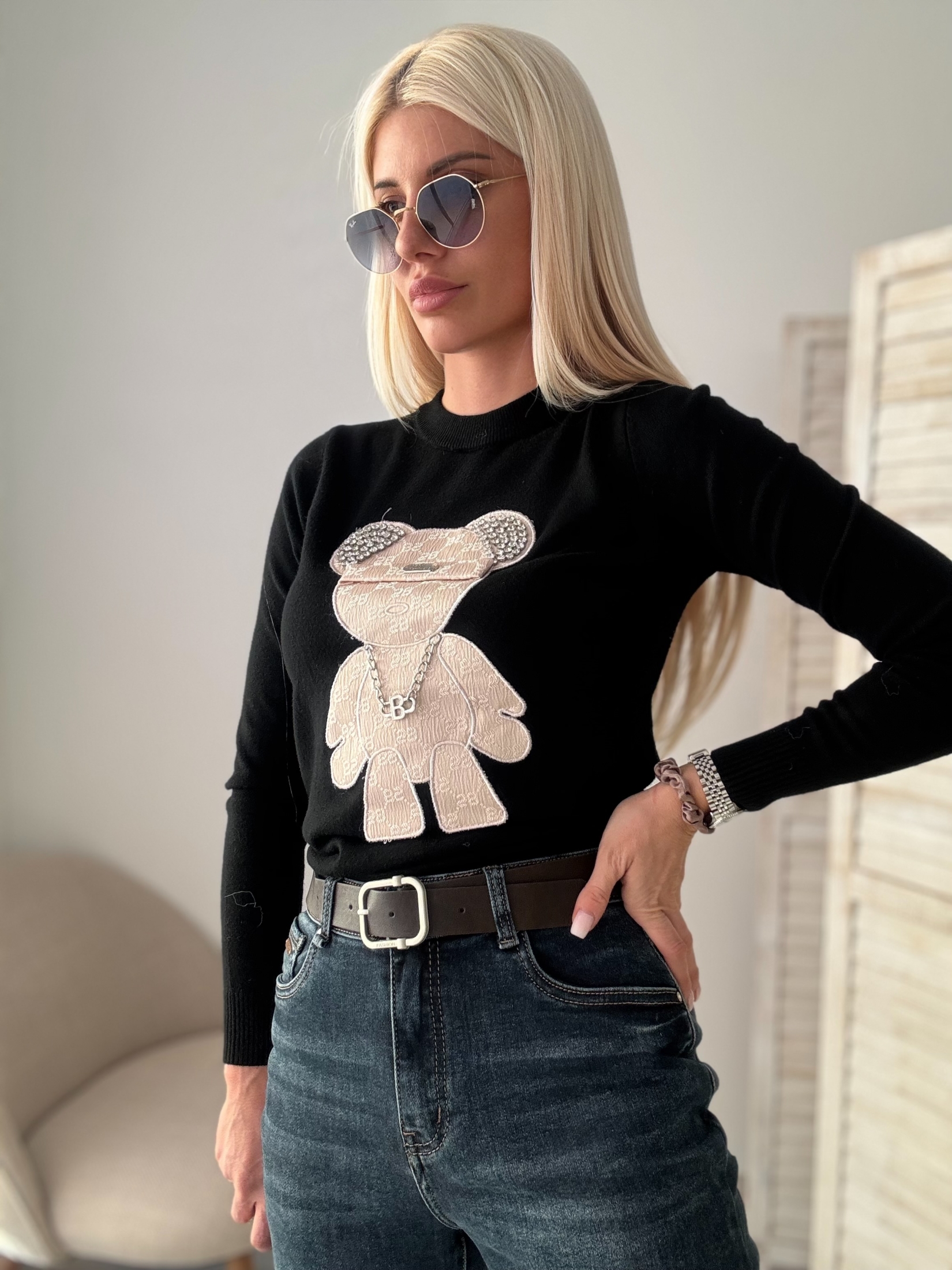 Черен пуловер с мече - Съчетание на стил и уют
