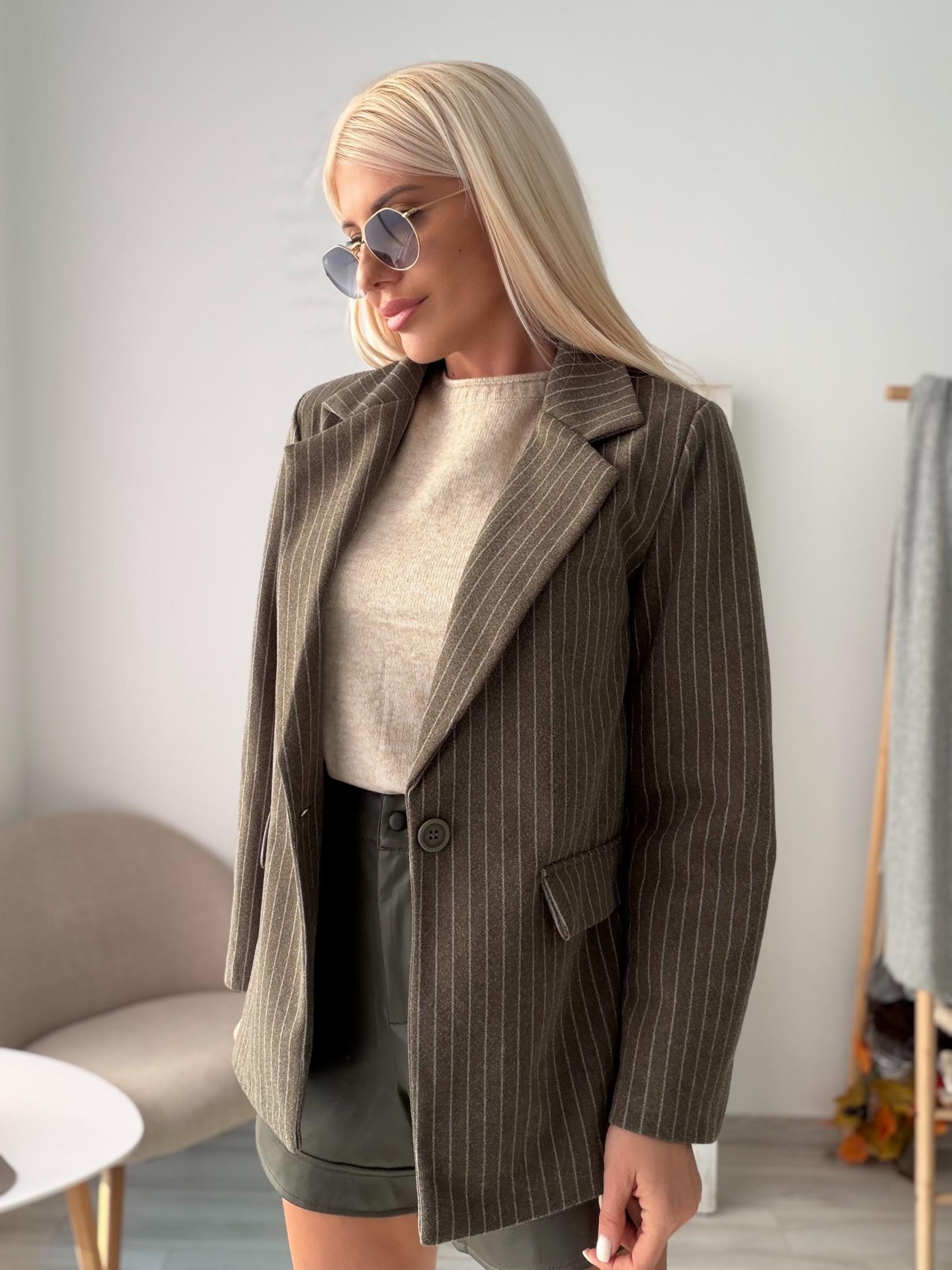 Дизайн и Материя: Сакото е изработено от висококачествена, плътна материя, която осигурява отлична топлоизолация. Зеленият цвят в комбинация с финото райе придава на сакото изискан и модерен вид. Кройката е съобразена с женствените форми, осигурявайки удобство и свобода на движение.