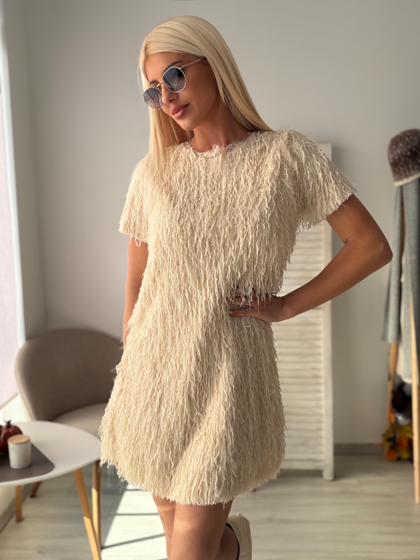 Очарователна рокля в нежен екрю нюанс, идеална за специални поводи. С ефектни ресни, които придават динамика и елегантност на визията. Подчертава женствеността и осигурява комфорт при носене.