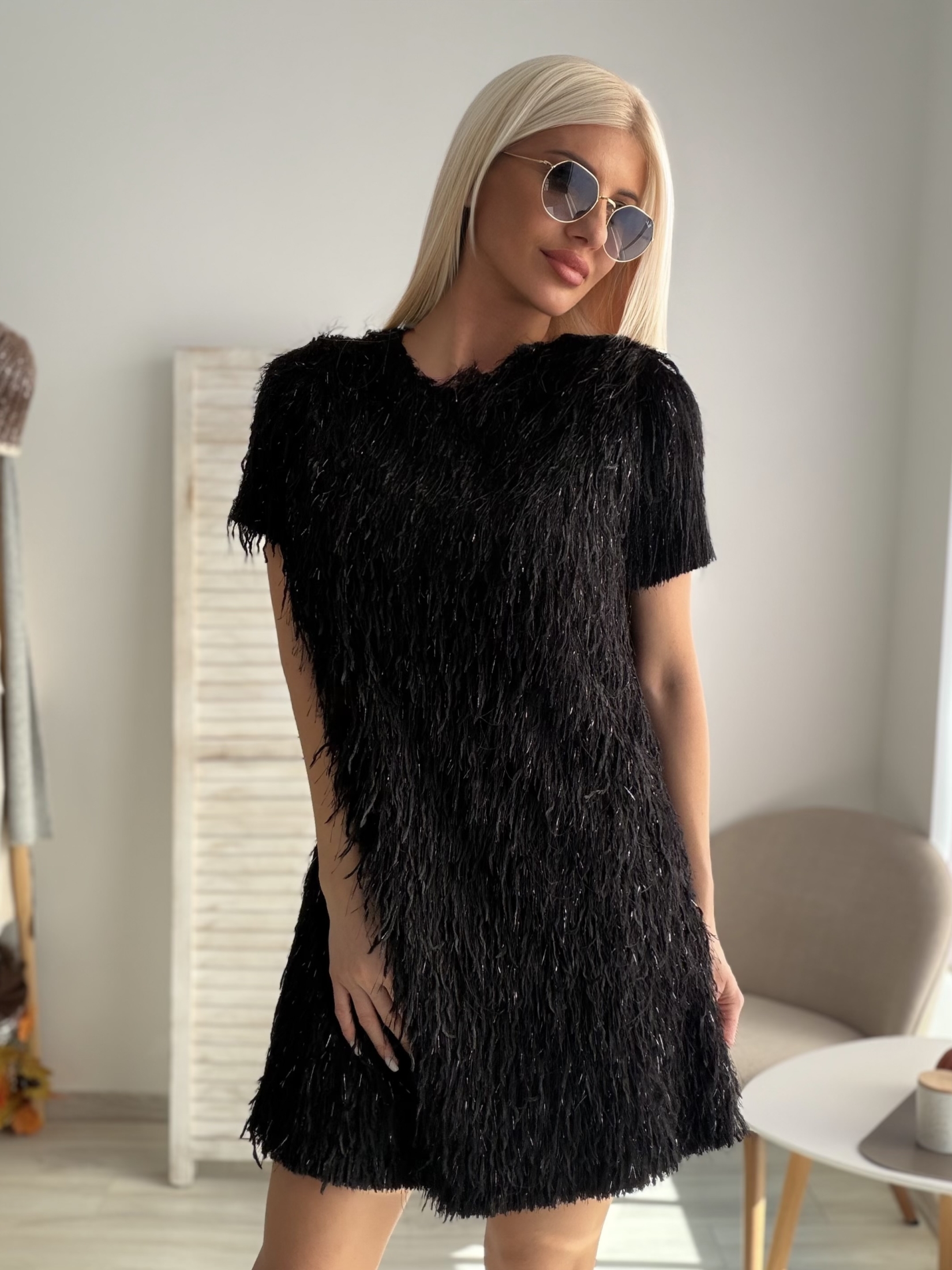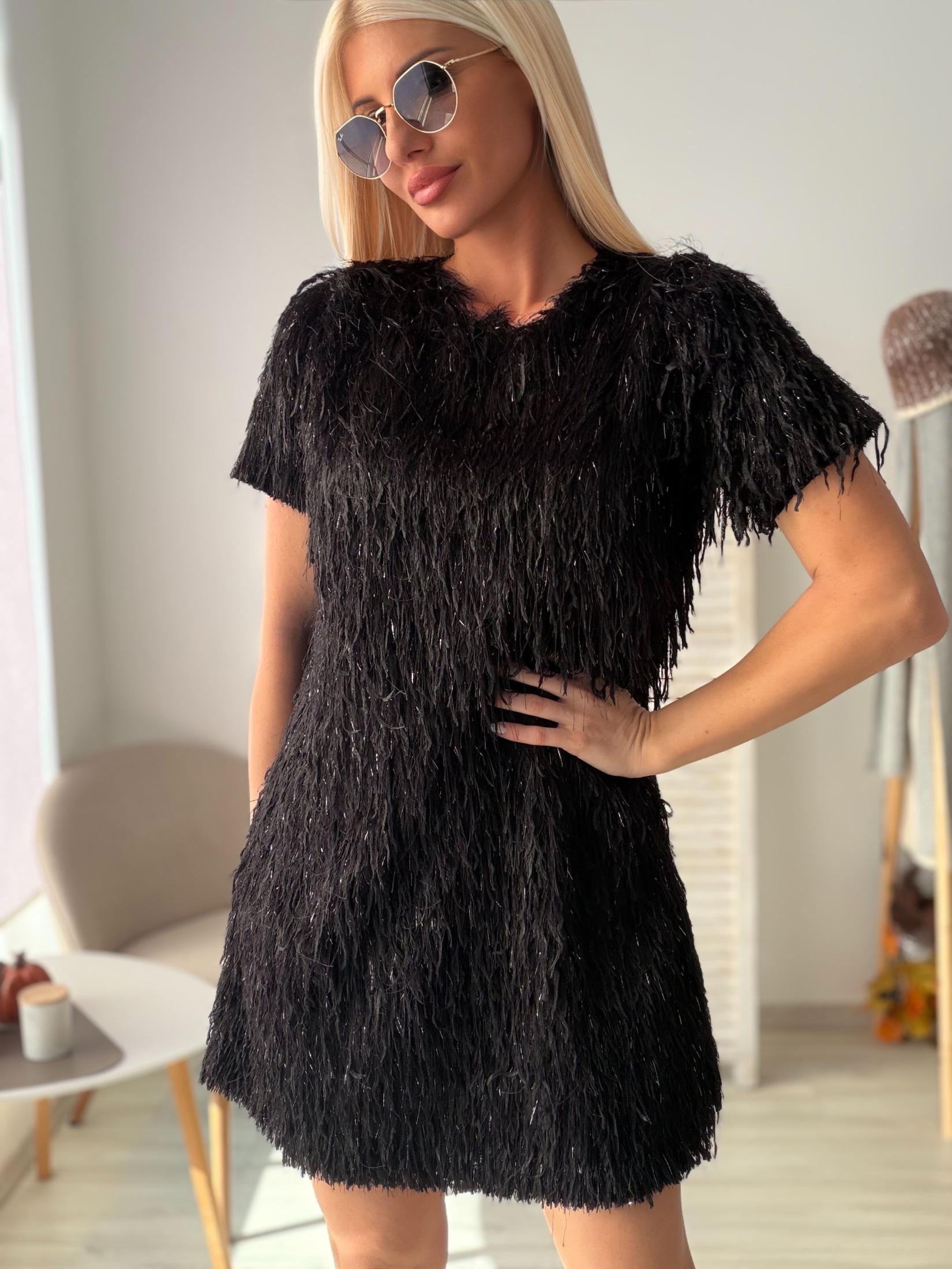 Елегантна черна рокля, идеална за специални поводи. Тази стилна рокля е украсена с атрактивни ресни, които придават динамика и блясък на визията ви.
