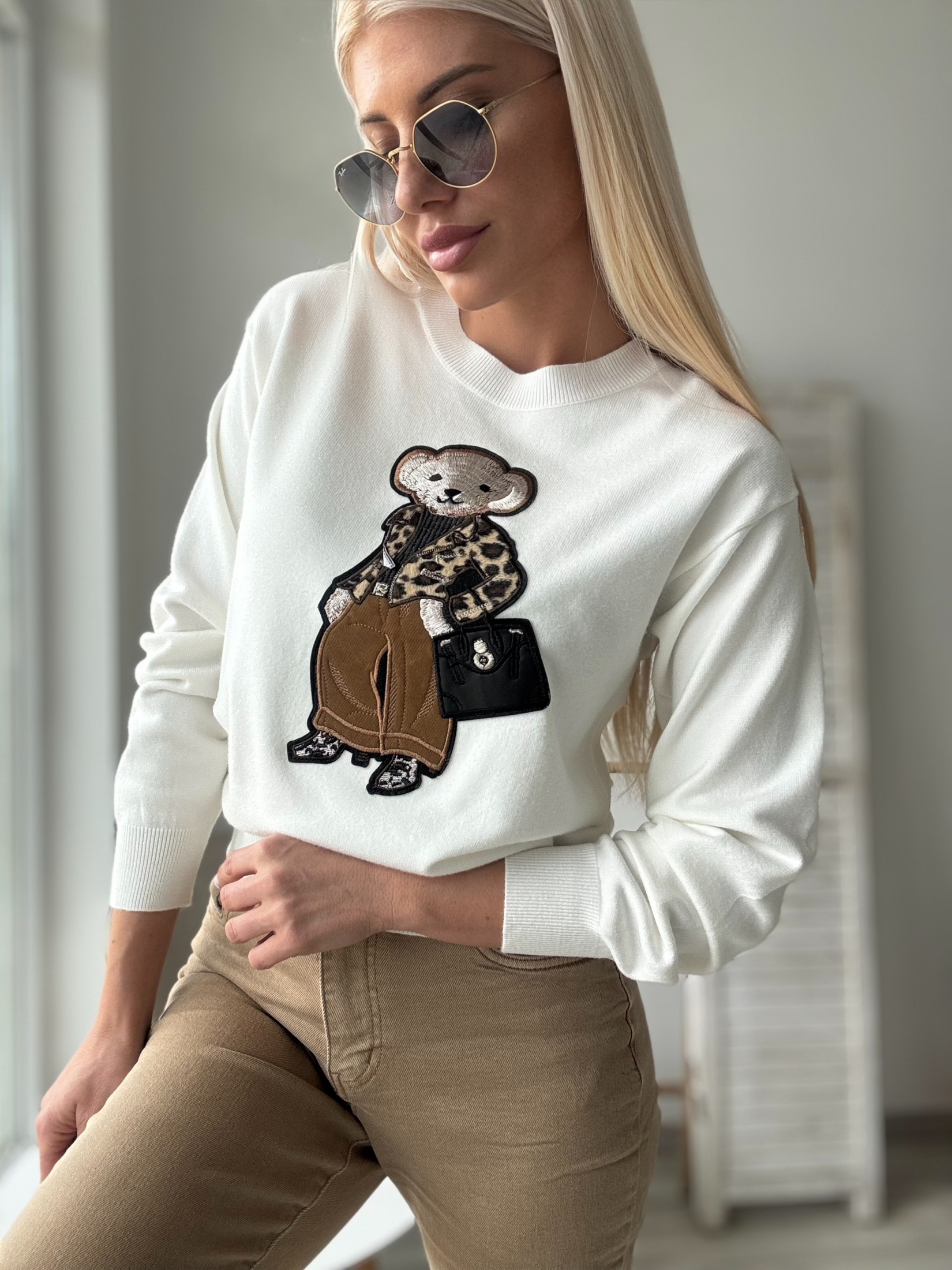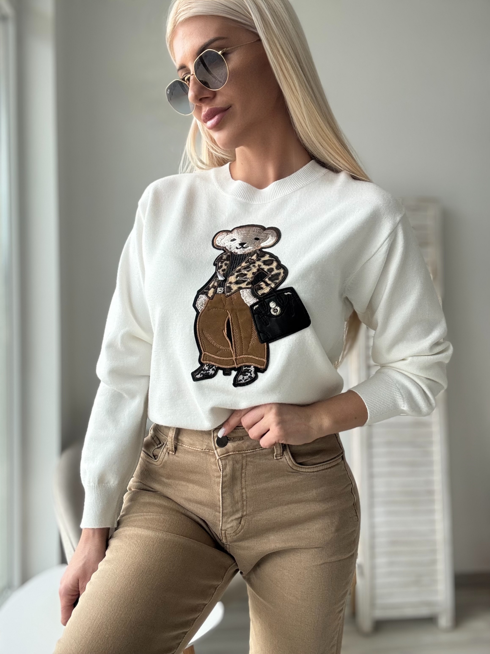 Очарователен бял пуловер, украсен с игрив мече леопард! Този мек и удобен пуловер е идеален за добавяне на закачлив акцент към вашия гардероб.