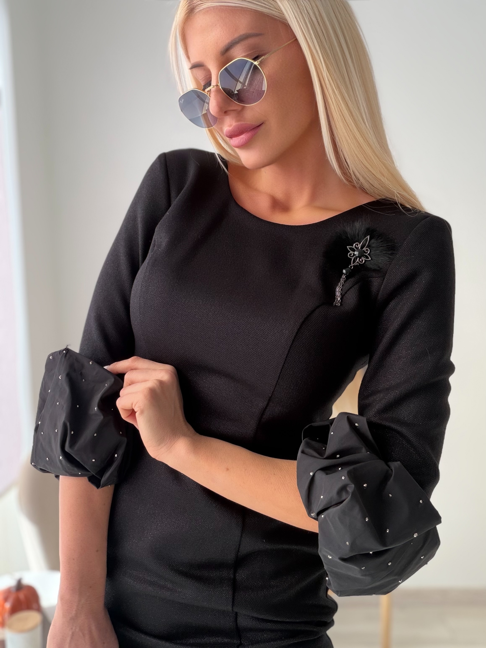 Тази черна рокля е перфектна комбинация от класически и модерни елементи. Изисканата брошка, украсена с камъни, добавя луксозен акцент, докато класическият черен цвят гарантира, че ще бъдете център на внимание. Дизайнът е създаден така, че да подчертава най-добрите ви черти и да ви осигури максимален комфорт.