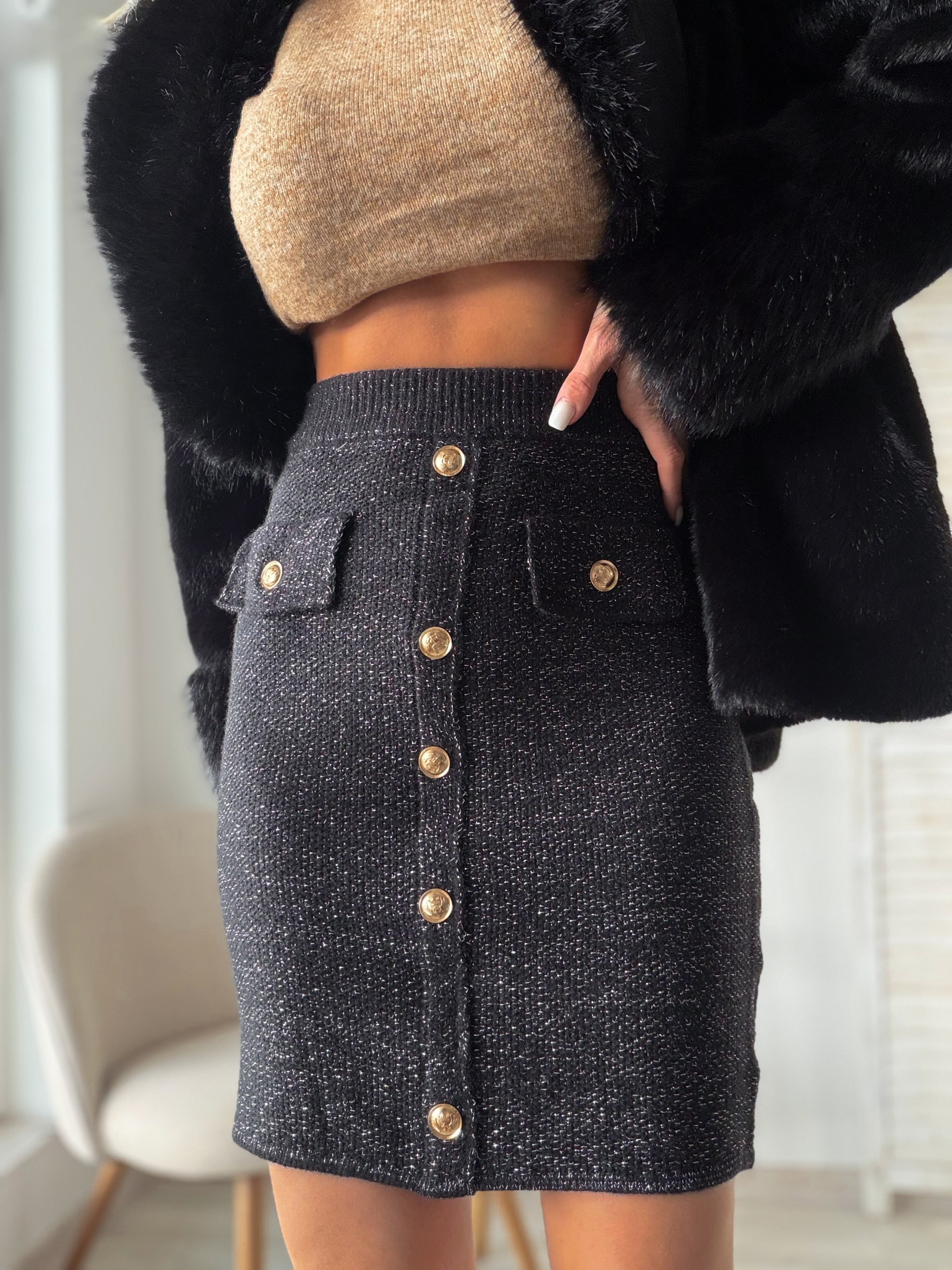 Тази пола е не само красива, но и изключително удобна за носене. Ламето придава елегантен блясък, който привлича вниманието, докато кройката по тялото подчертава вашата фигура по най-добрия начин. Черният цвят е универсален и позволява лесно да я комбинирате с различни дрехи и аксесоари, за да създадете уникален стил.