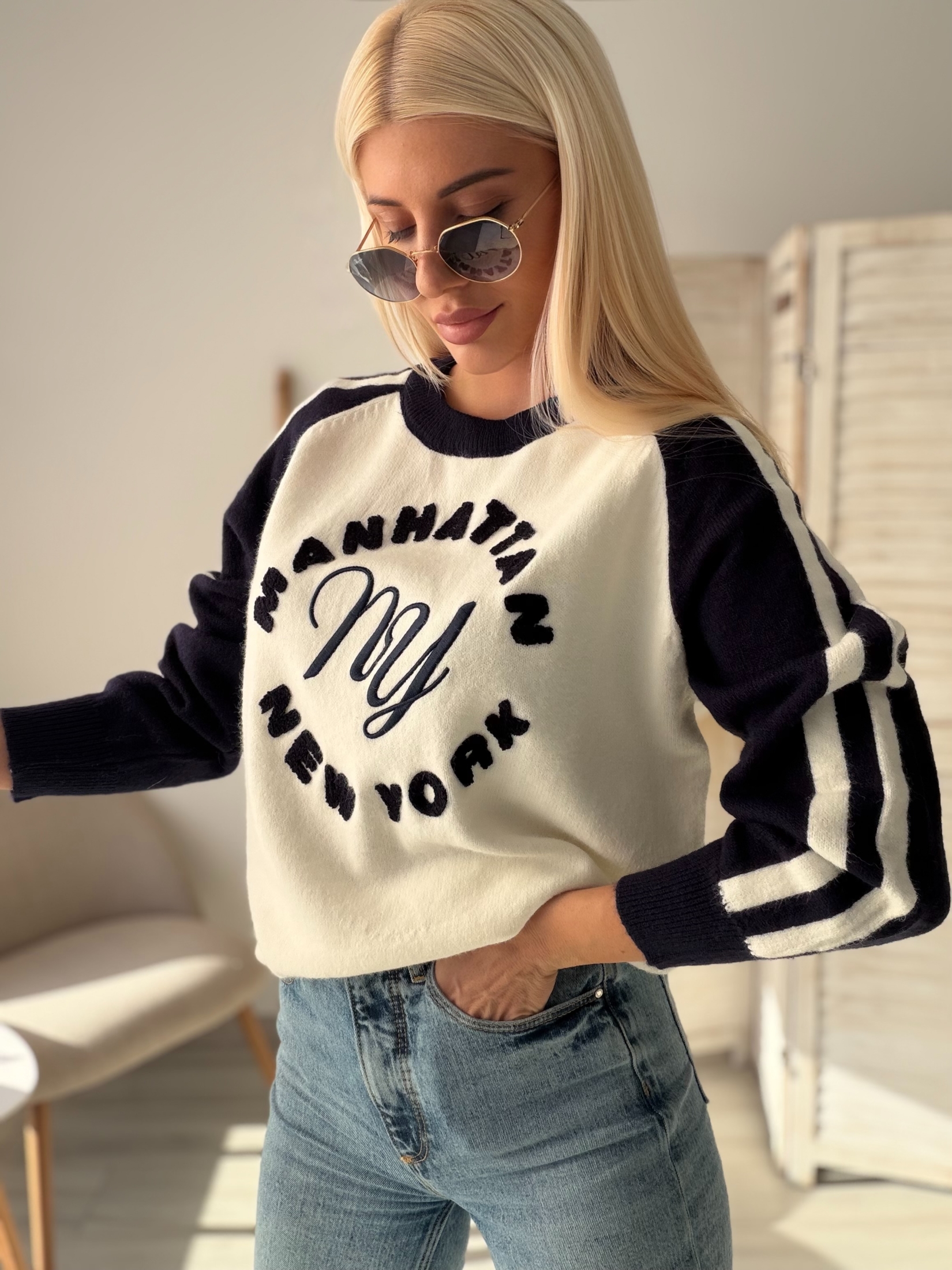 Елегантен тъмно син пуловер Manhattan, идеален за всеки стил. Изработен от висококачествена материя, осигурява комфорт и топлина. Подходящ за ежедневно носене или за по-специални поводи.