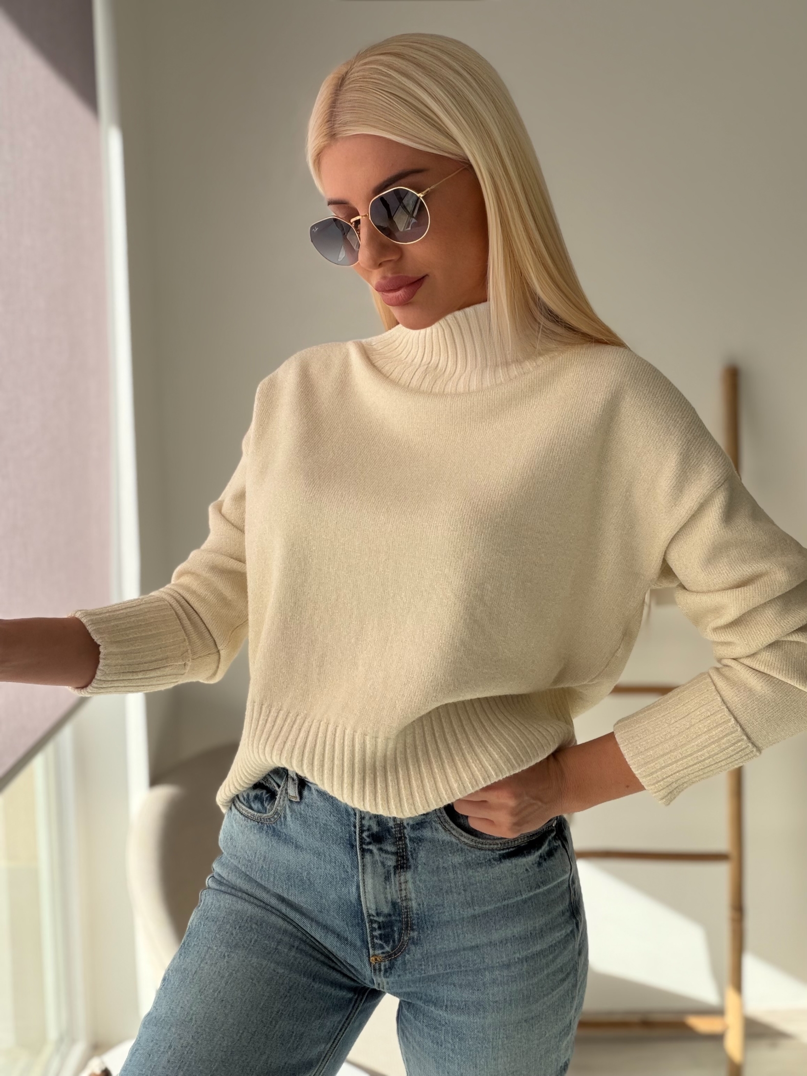 Този пуловер предлага не само модерен външен вид, но и комфорт при носене. Ламе материята придава деликатен блясък, който улавя светлината и създава изискан ефект. Дългите ръкави го правят идеален за по-хладните дни, а класическият цвят екрю позволява лесно комбиниране с други дрехи и аксесоари.