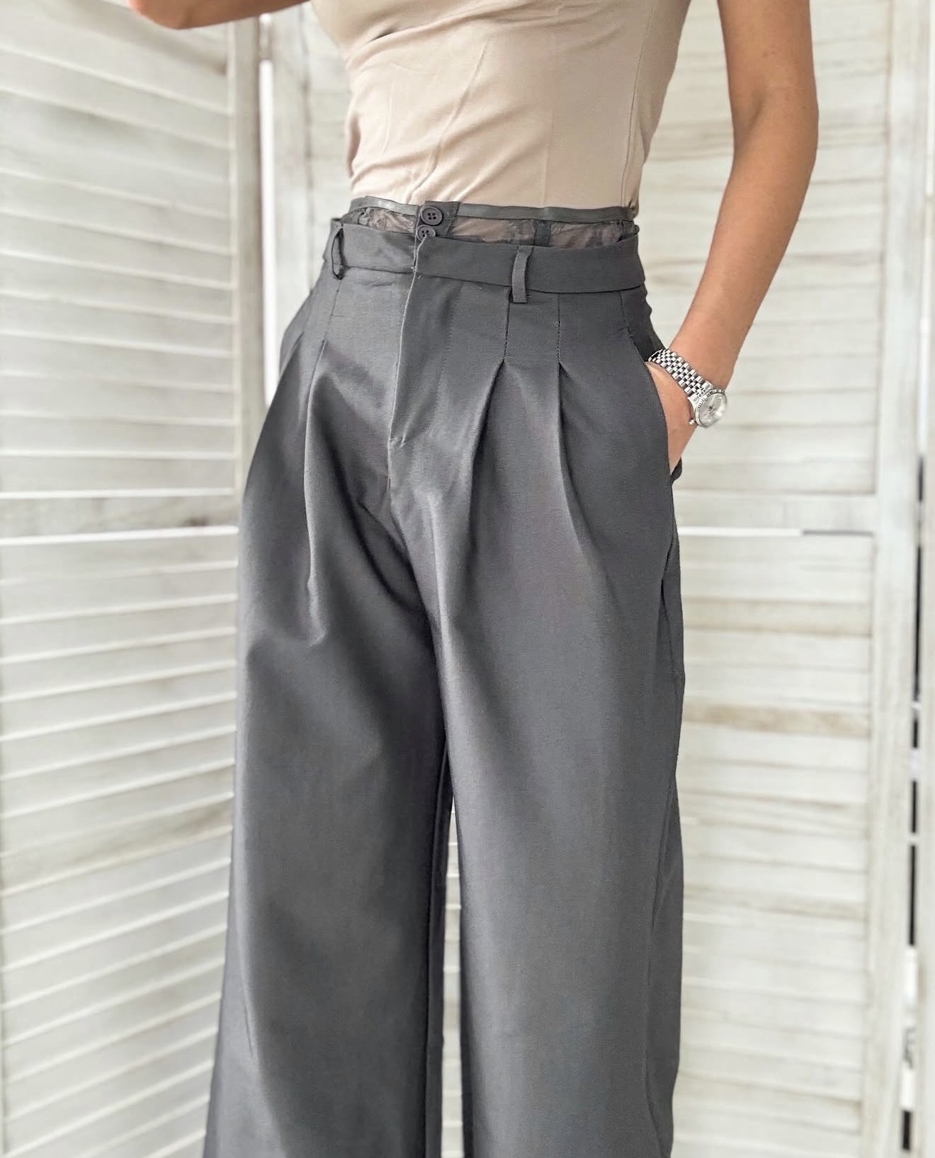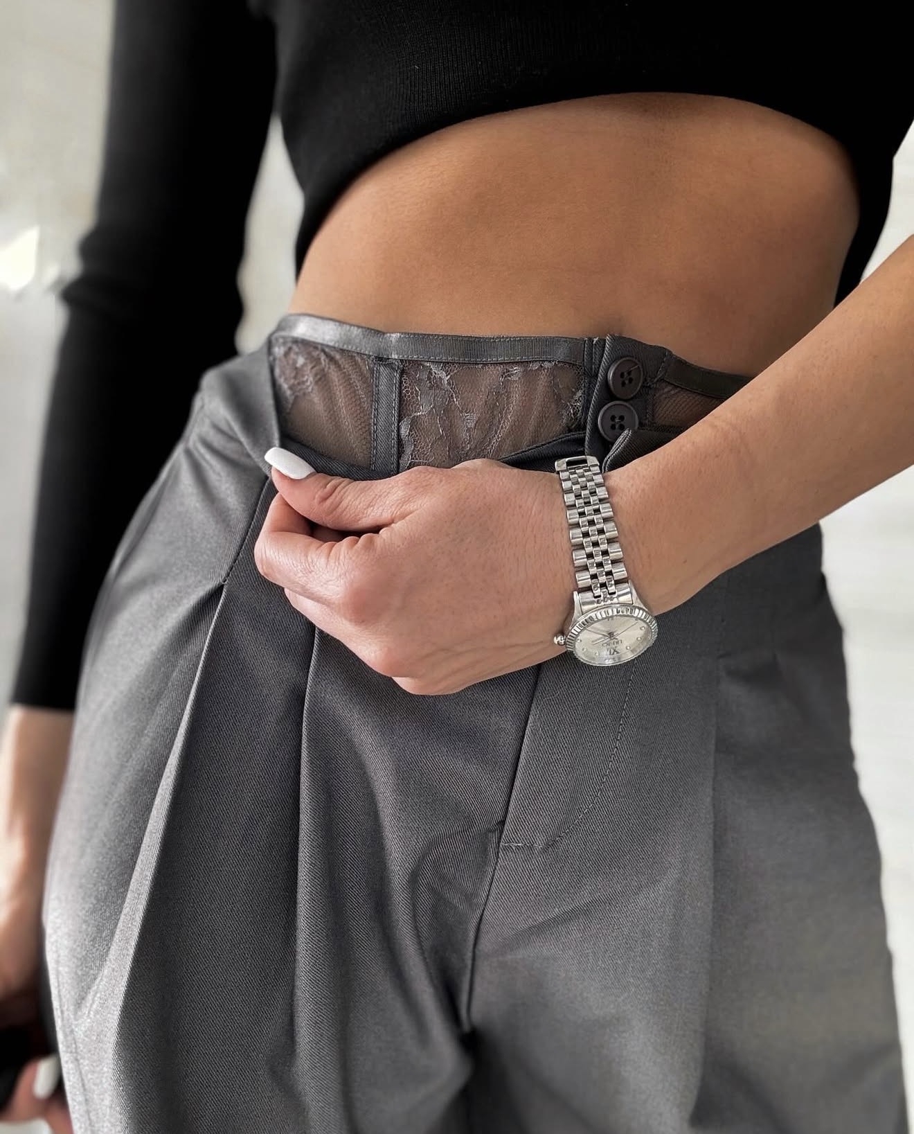 Потопете се в елегантност с нашия сив широк панталон с дантела.