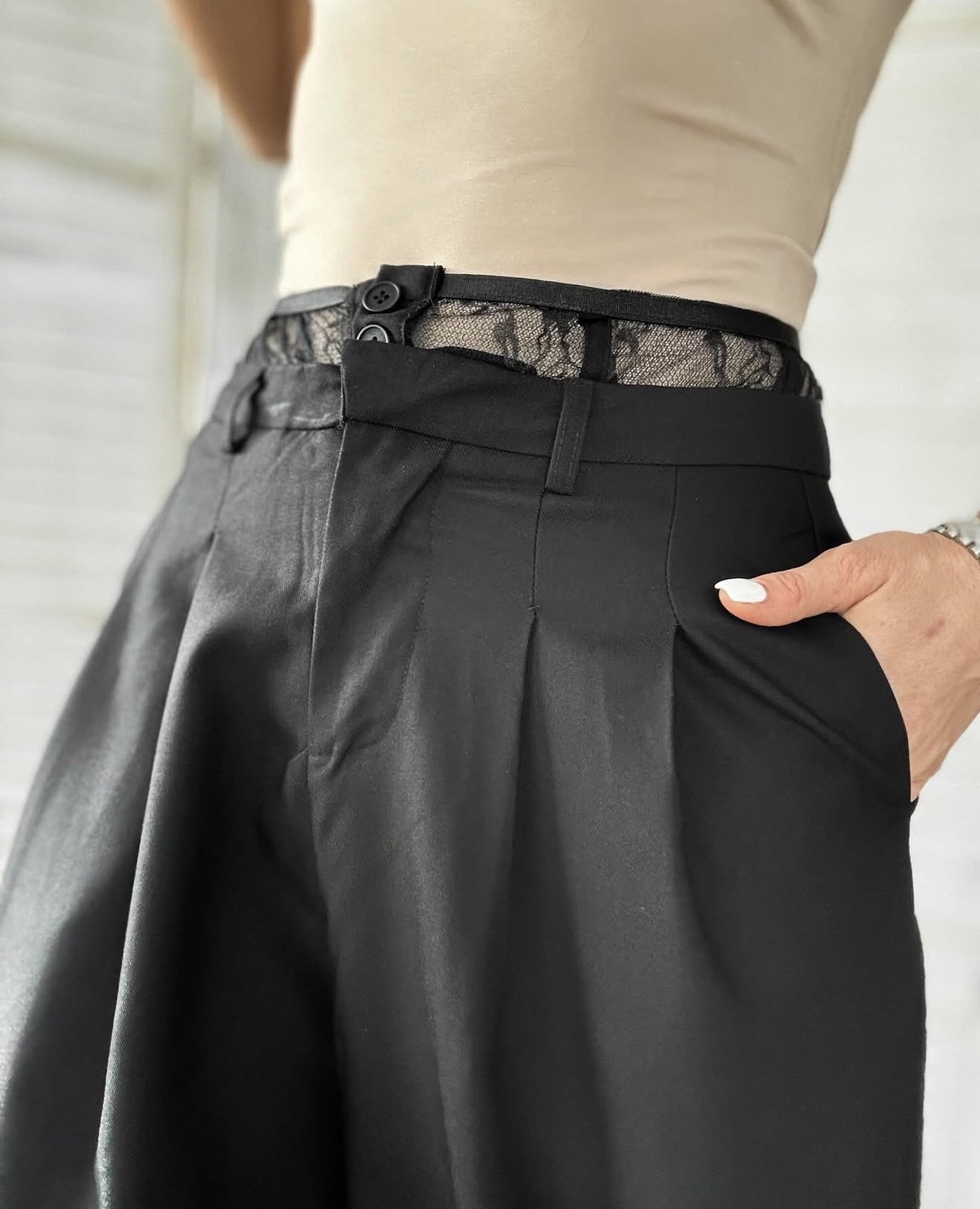 Този панталон е изработен с внимание към детайла, като дантелата придава фина женственост и елегантност. Широкият силует осигурява свобода на движение и комфорт през целия ден, докато черният цвят гарантира лесна комбинация с различни върхове и аксесоари.