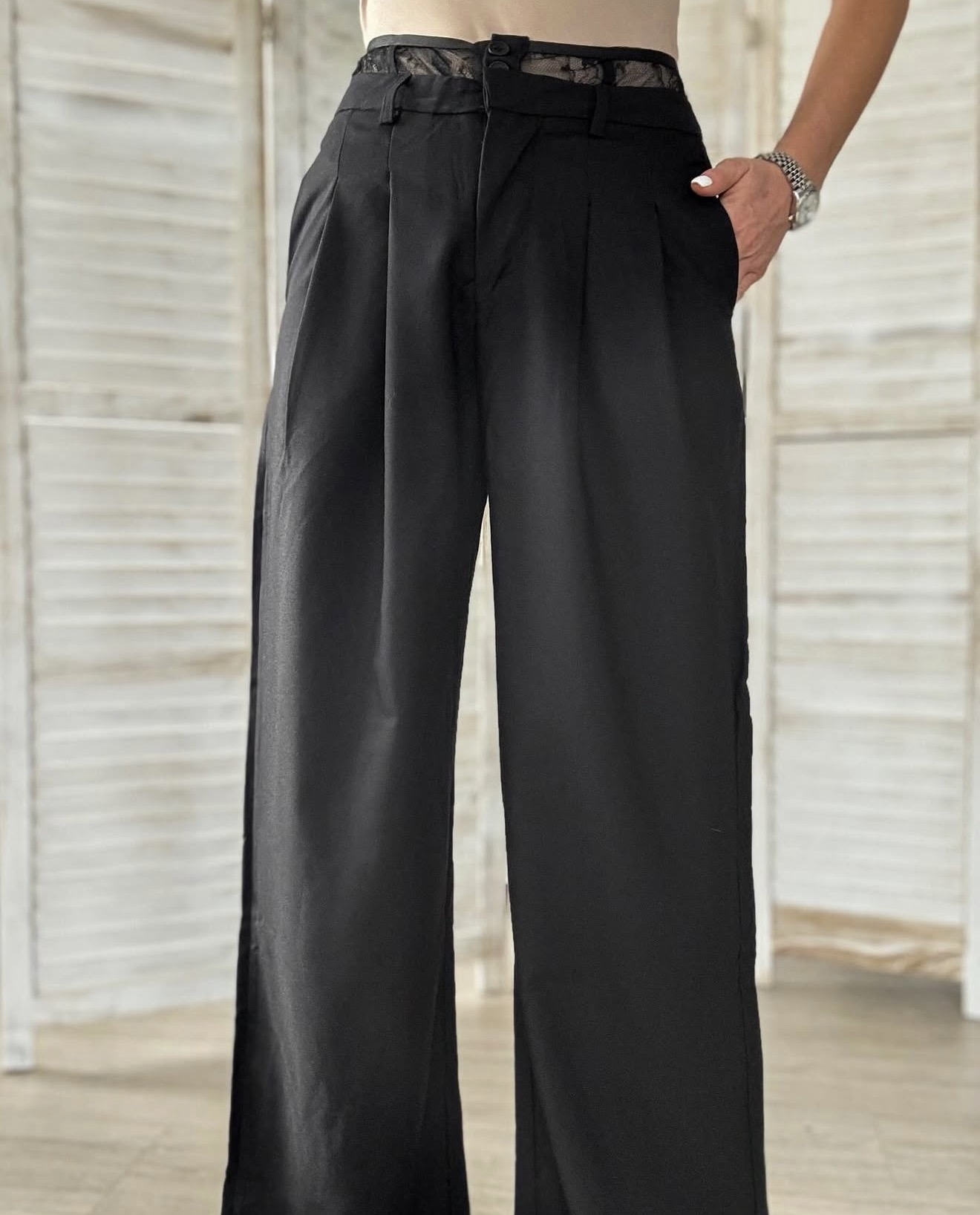 Елегантен черен панталон с широки крачоли и изискана дантела.