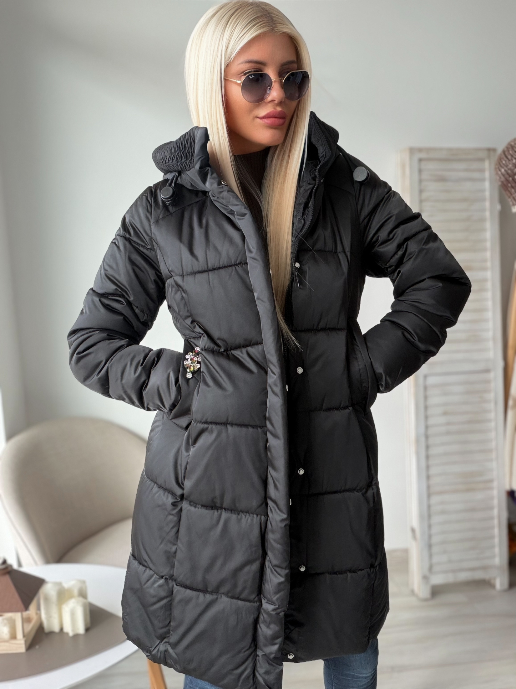 - Камъни на джоба: Декоративните камъни, поставени върху джобовете, придават изтънченост и блясък на якето. Те улавят светлината и добавят фина, но забележима доза лукс.