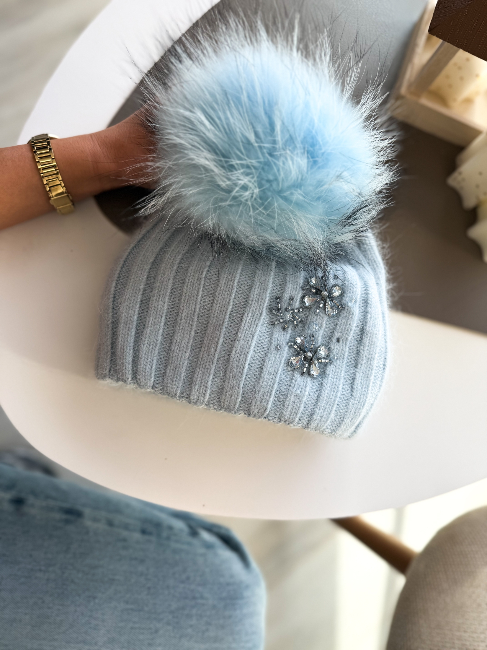 - Елегантен дизайн: Камъните и естественият пух придават на шапката изискан и модерен вид, който ще допълни всяка визия.